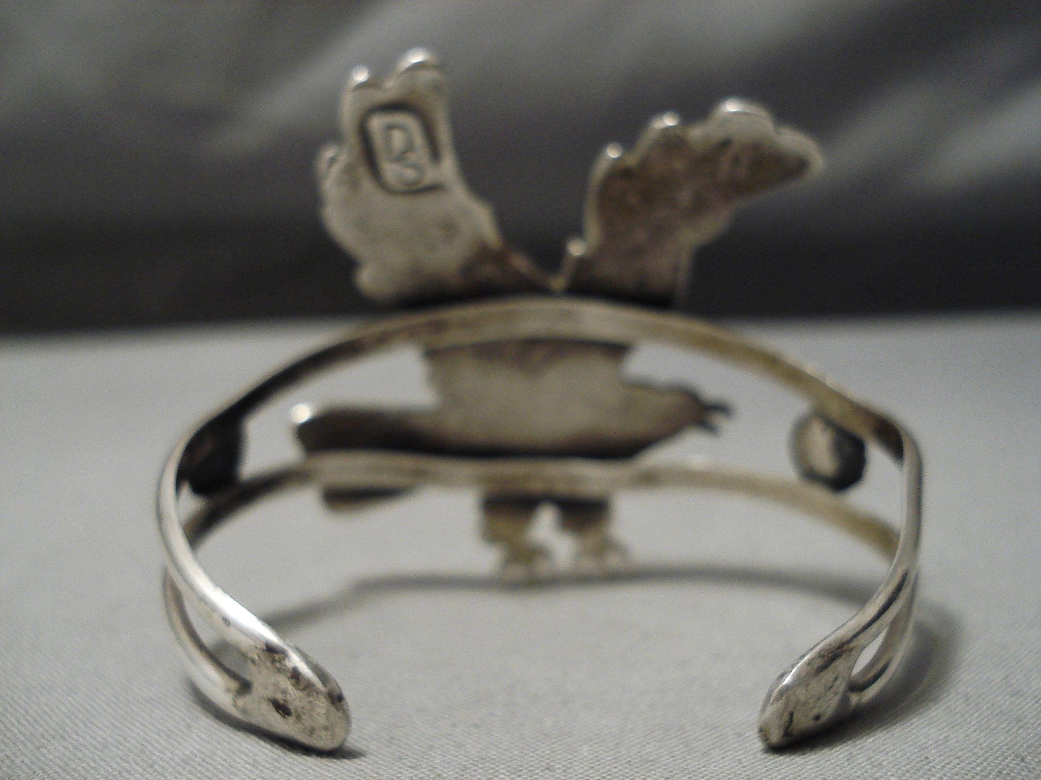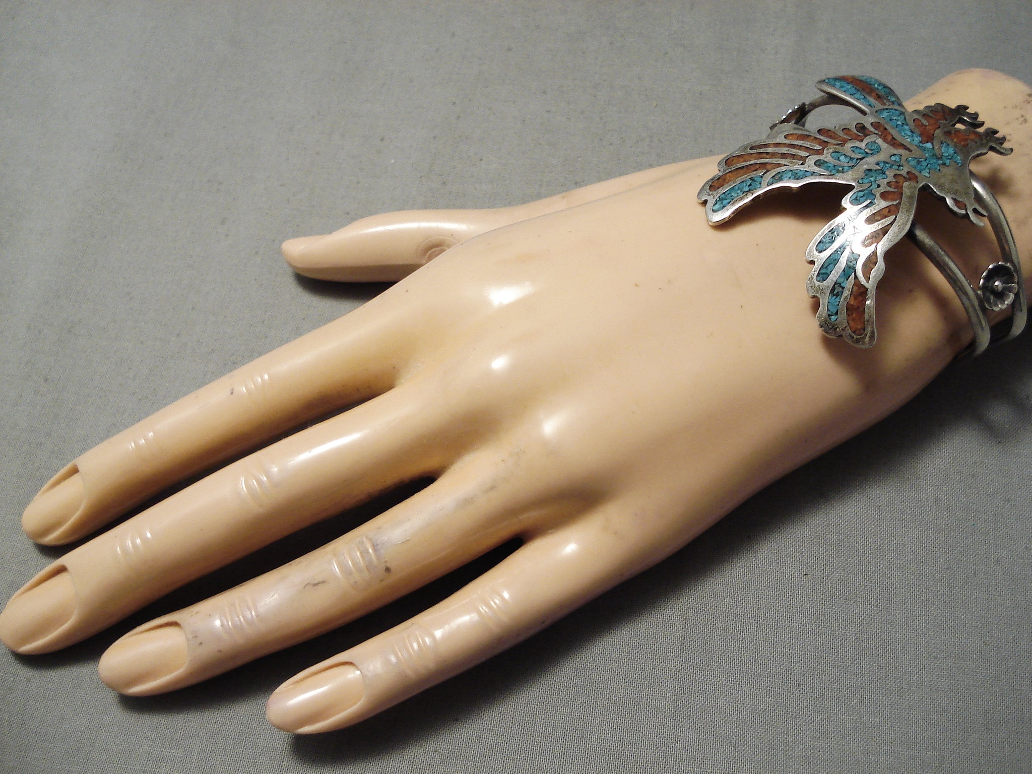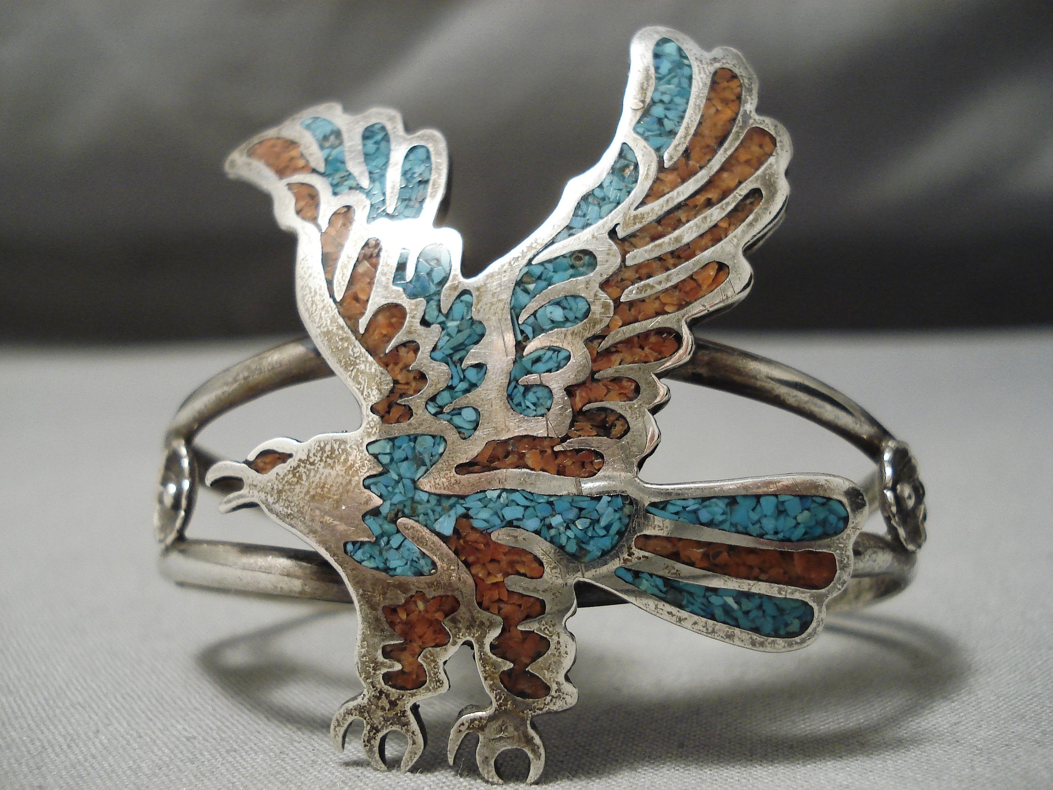 This is an exceptional vintage Navajo inlaid silver eagle bracelet. This piece contains a remarkable center hand carved inlaid silver eagle. The eagle measures around 2" X 1-3/8". The inlay consists of turquoise and coral. Resting at the sides of the double silver shank cuff are absolutely stunning silver flowers with old natural patina. The width of the bracelet measures around 3/4". Signed by Navajo artist, DS. Sterling silver. Cir. 1960's+. The inside end to end measures around 5-1/4" with an additional 1" gap. Sturdy 30 grams.