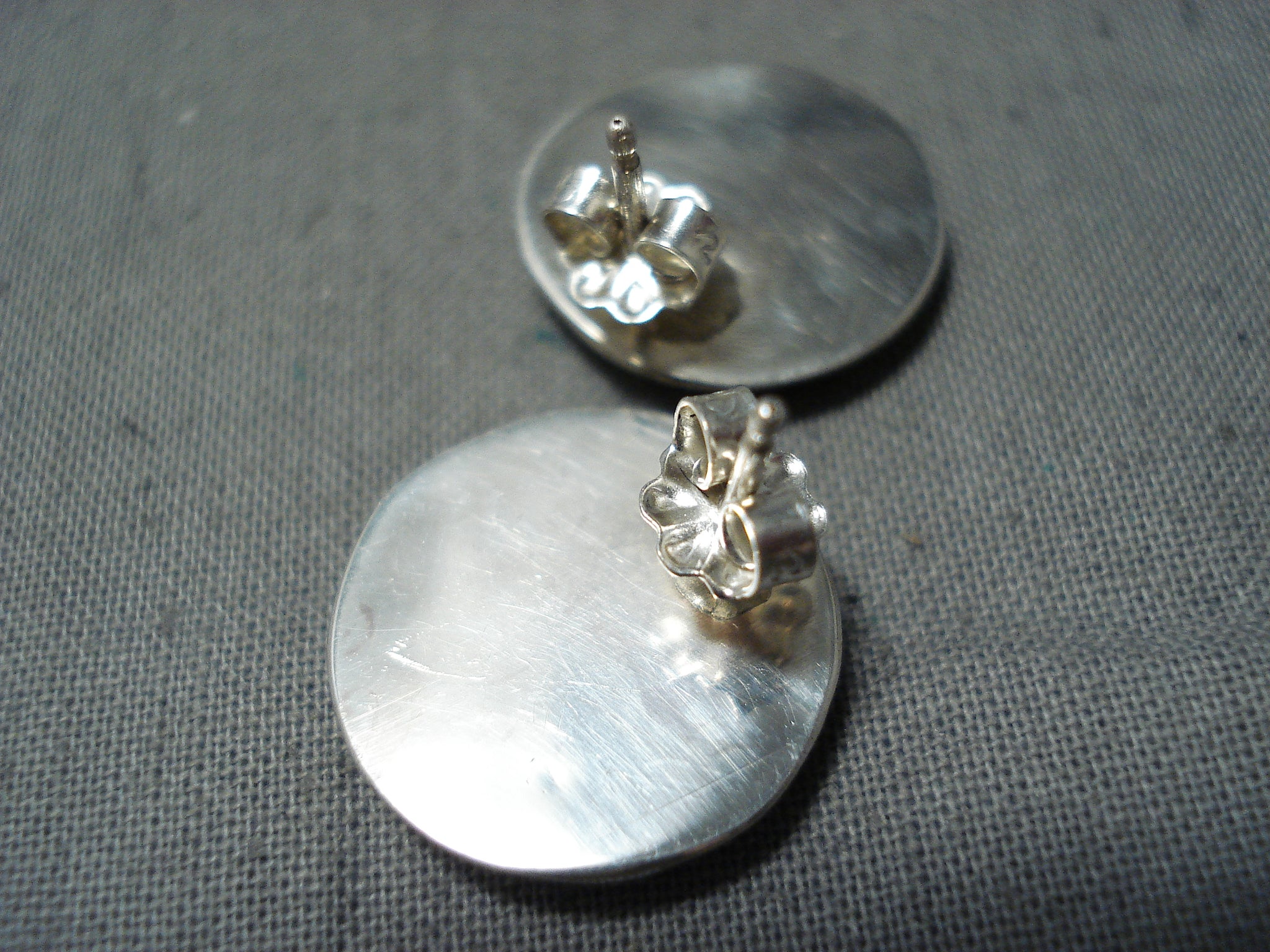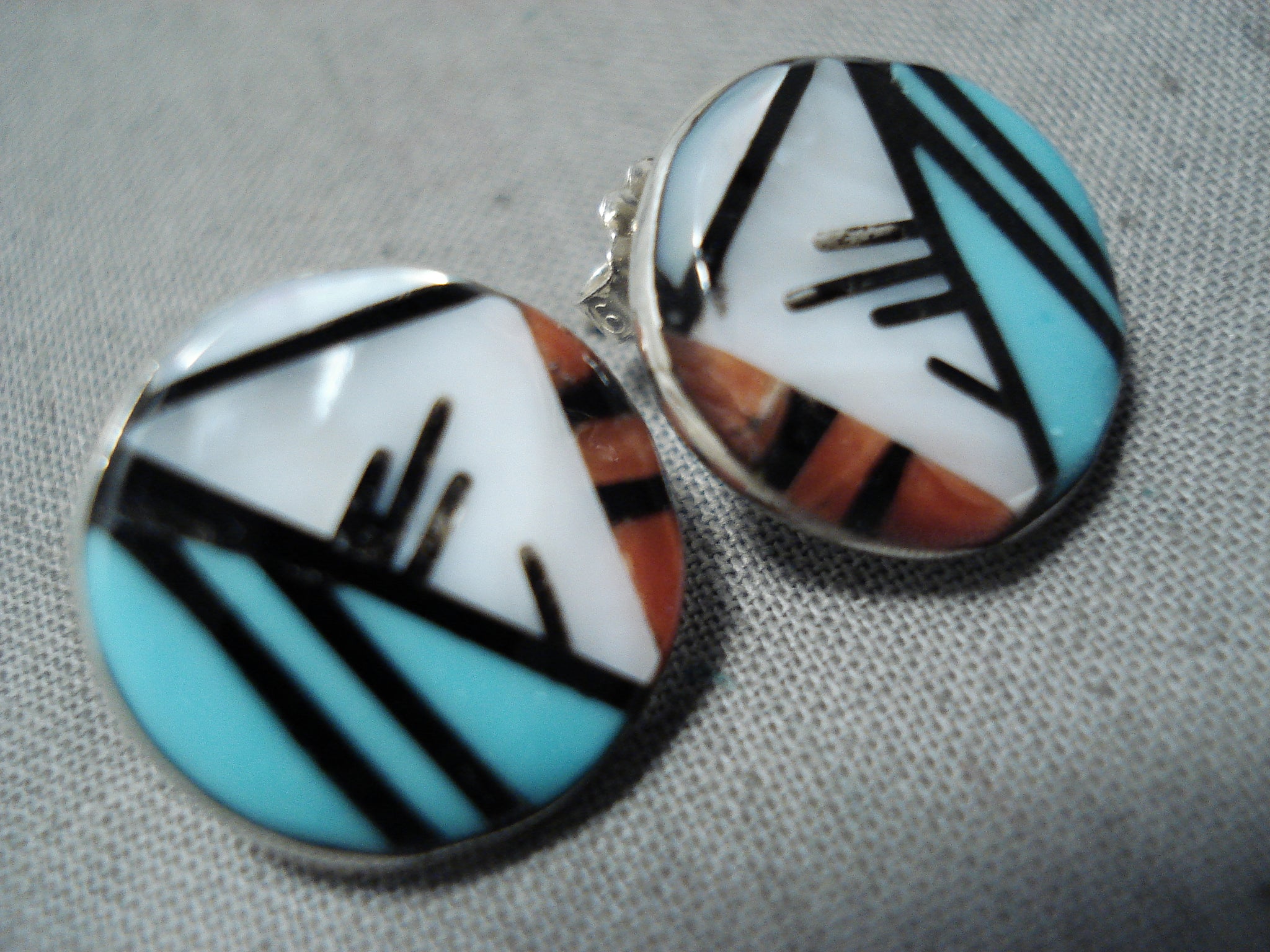 Detailed Vintage Native American Zuni Turquoise Inlay Sterling Silver Earrings