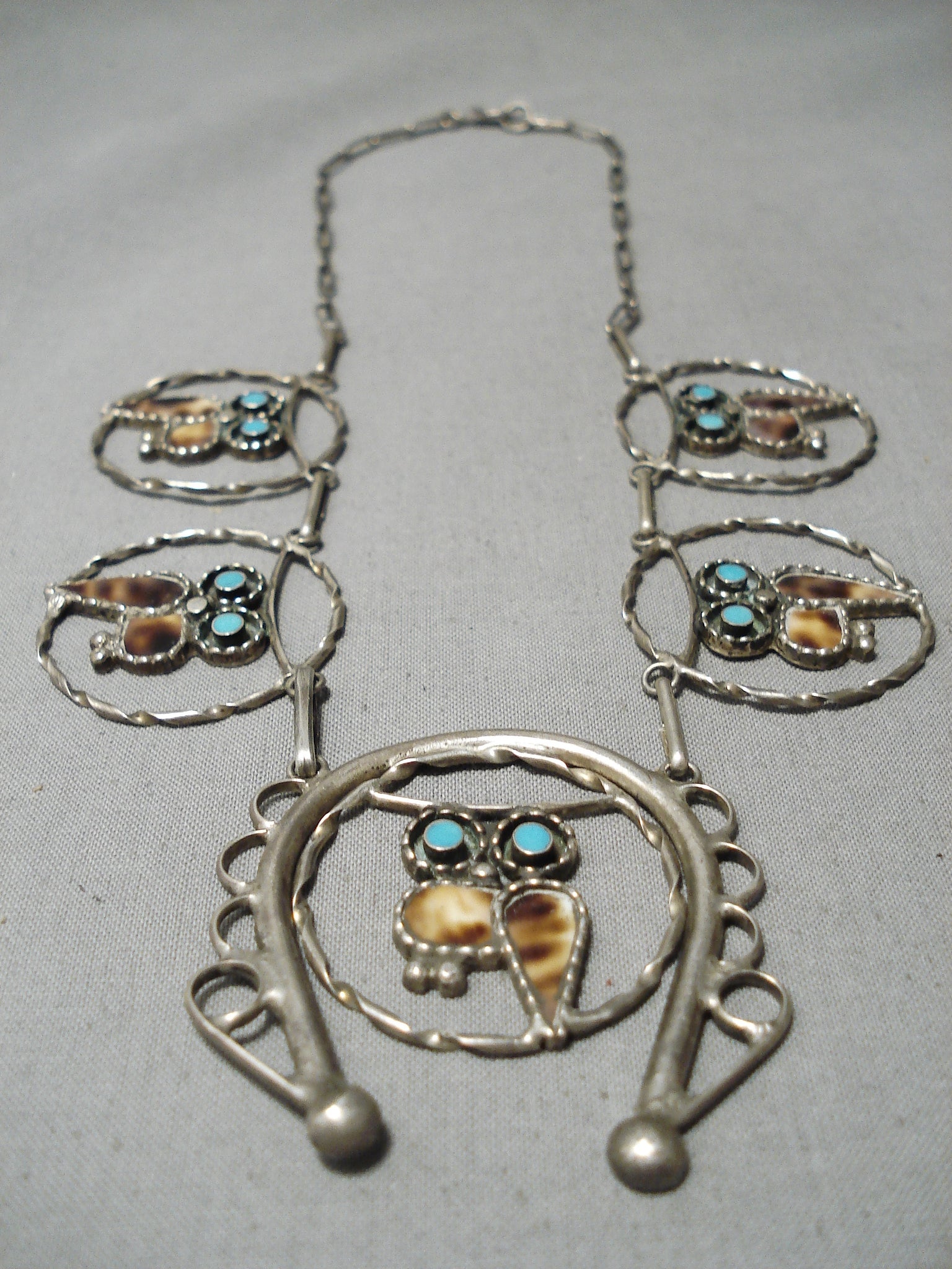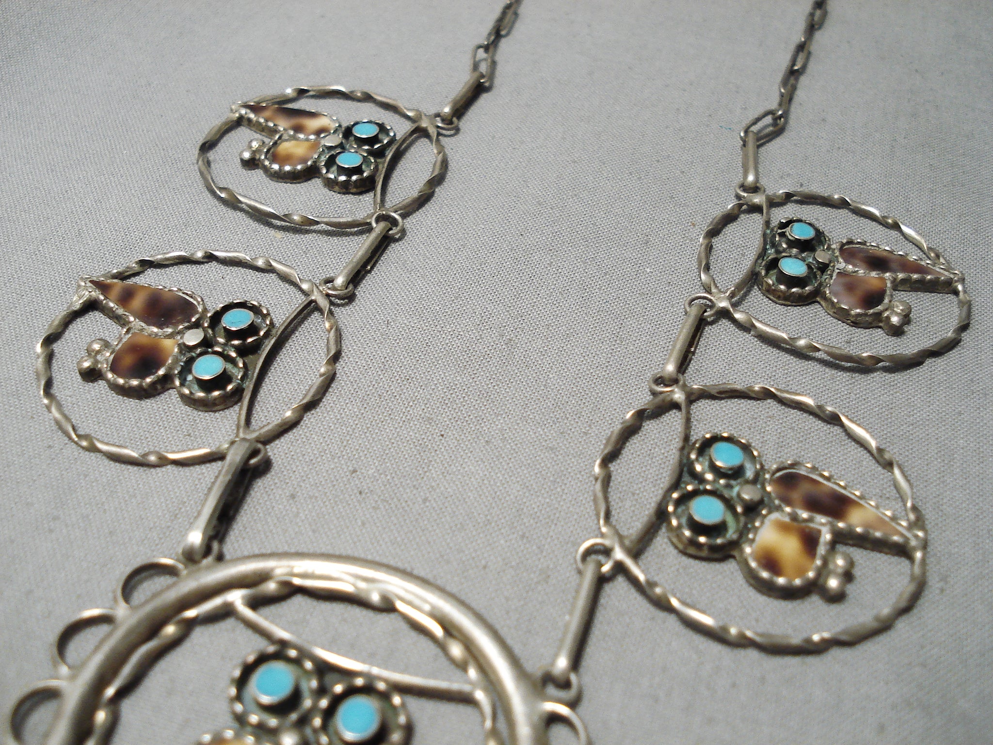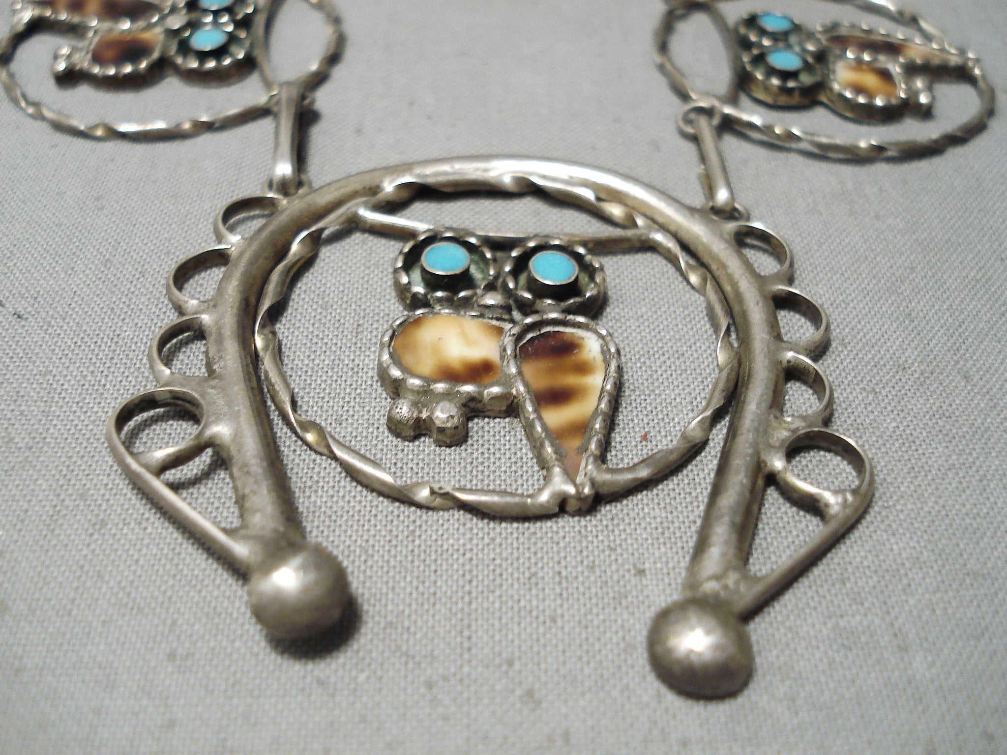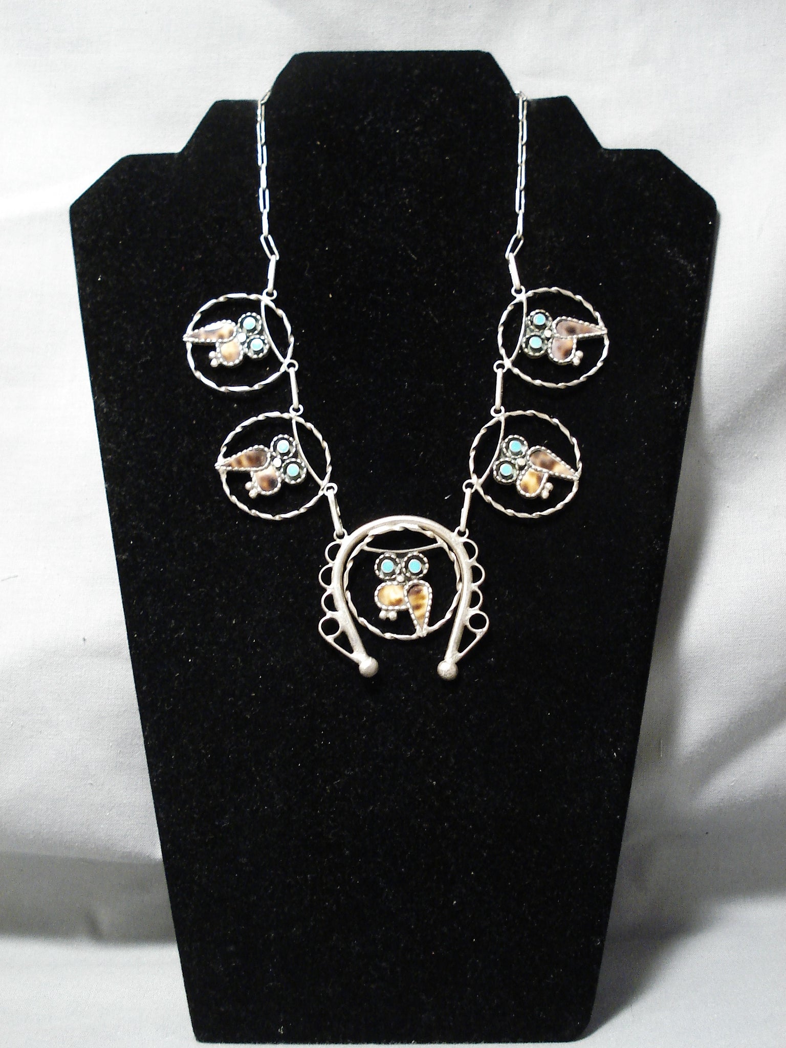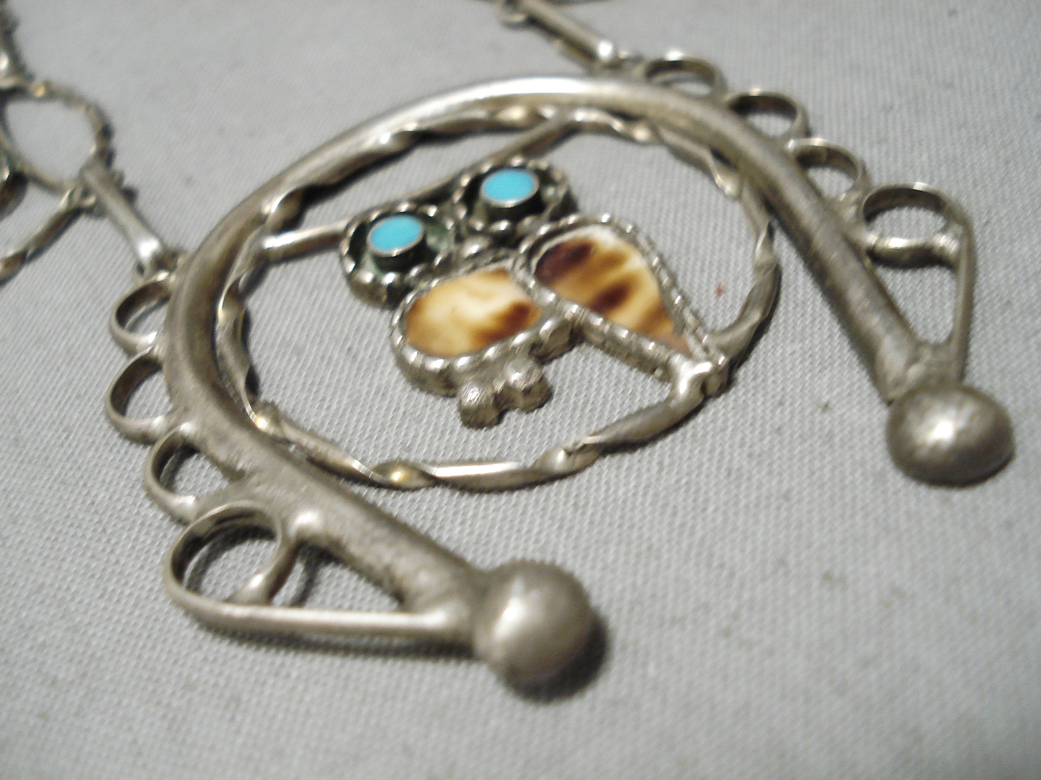 Detailed Vintage Native American Zuni Turquoise Inlay Sterling Silver Squash Blossom Necklace