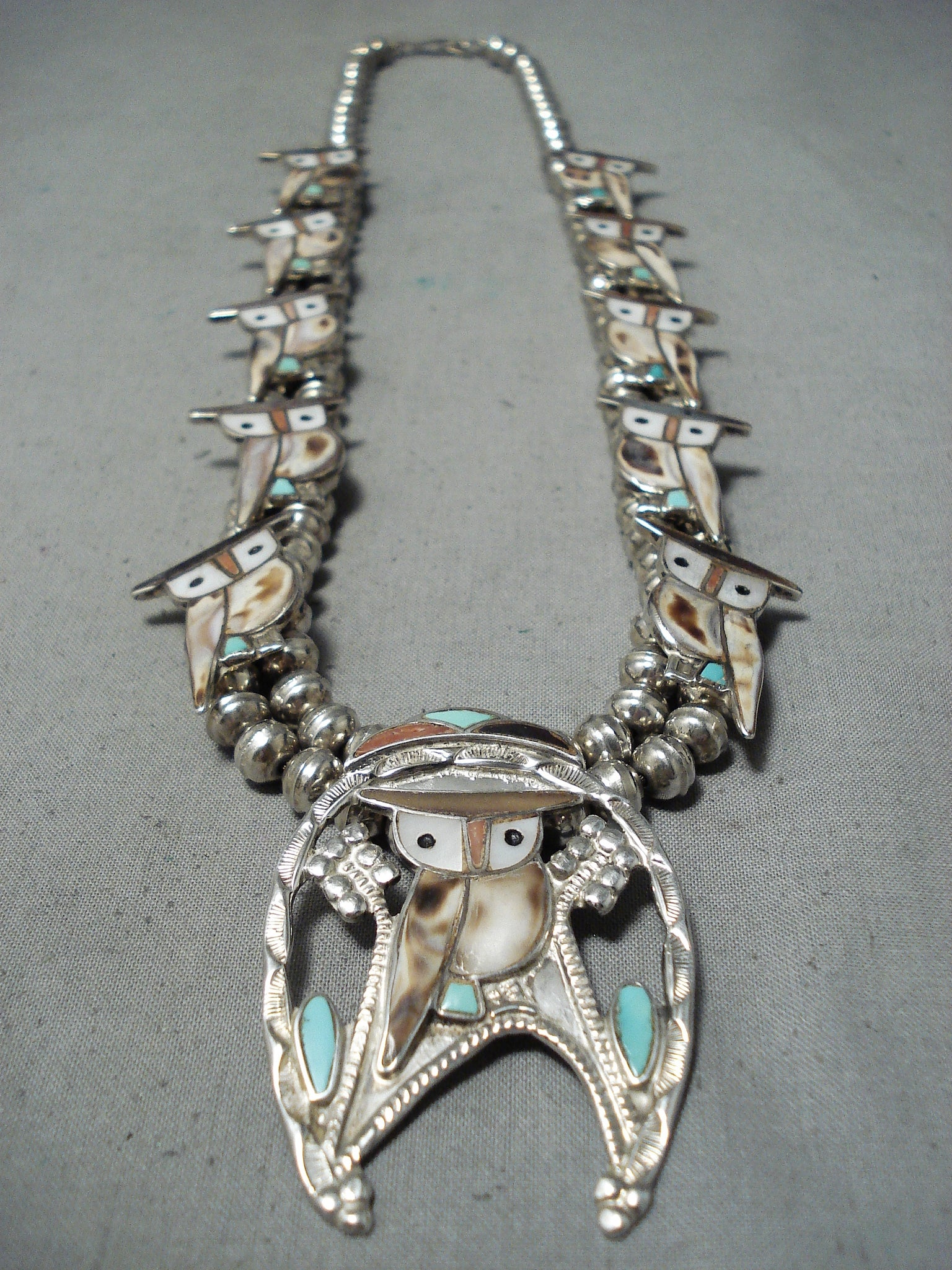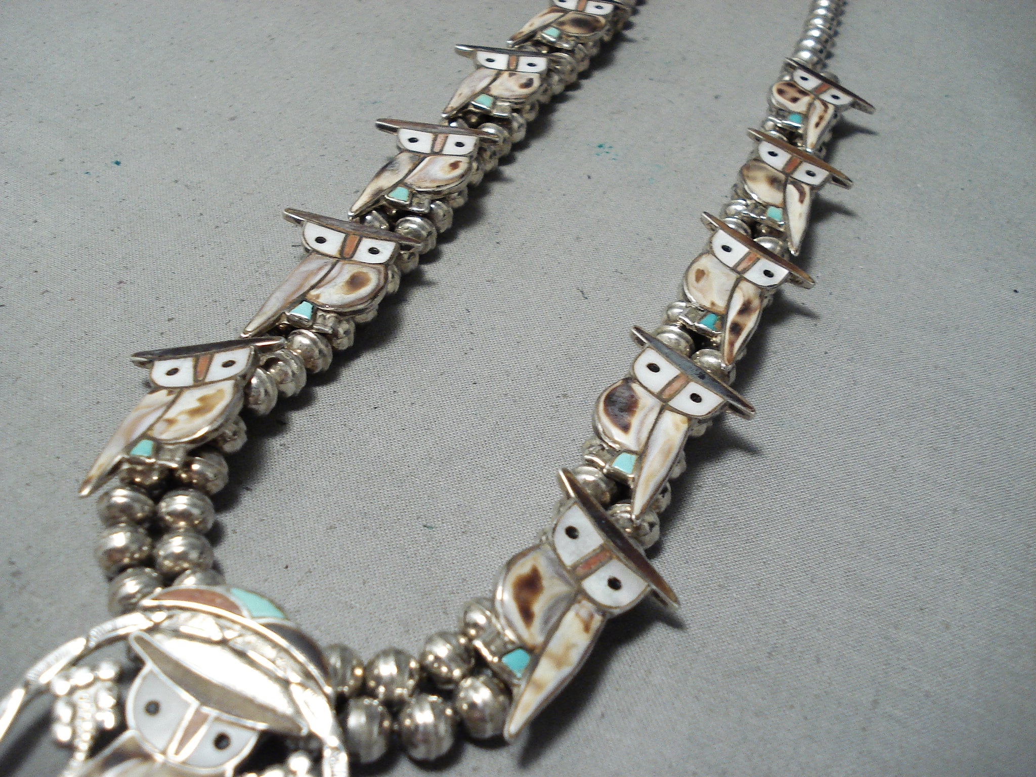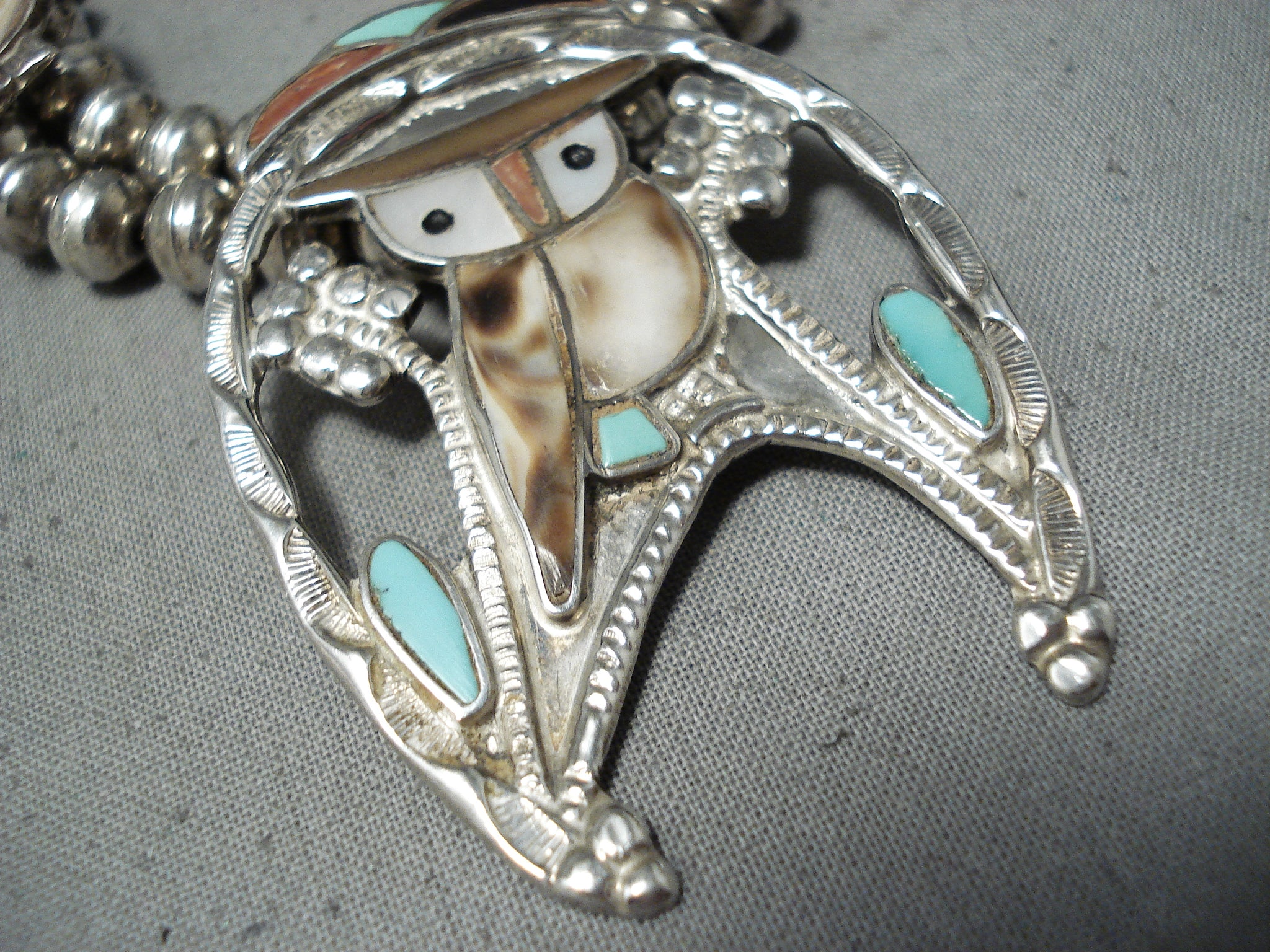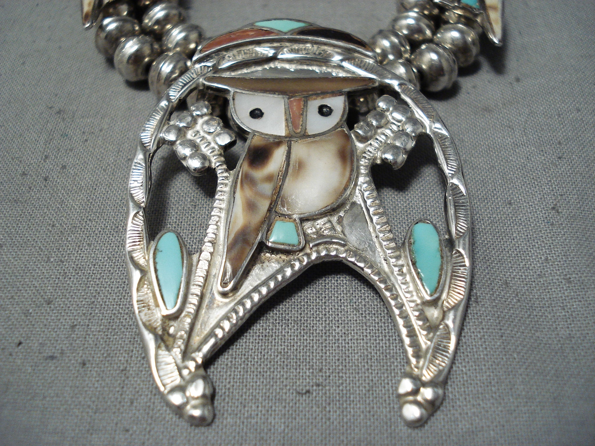 Detailed Vintage Native American Zuni Turquoise Owl Sterling Silver Squash Blossom Necklace