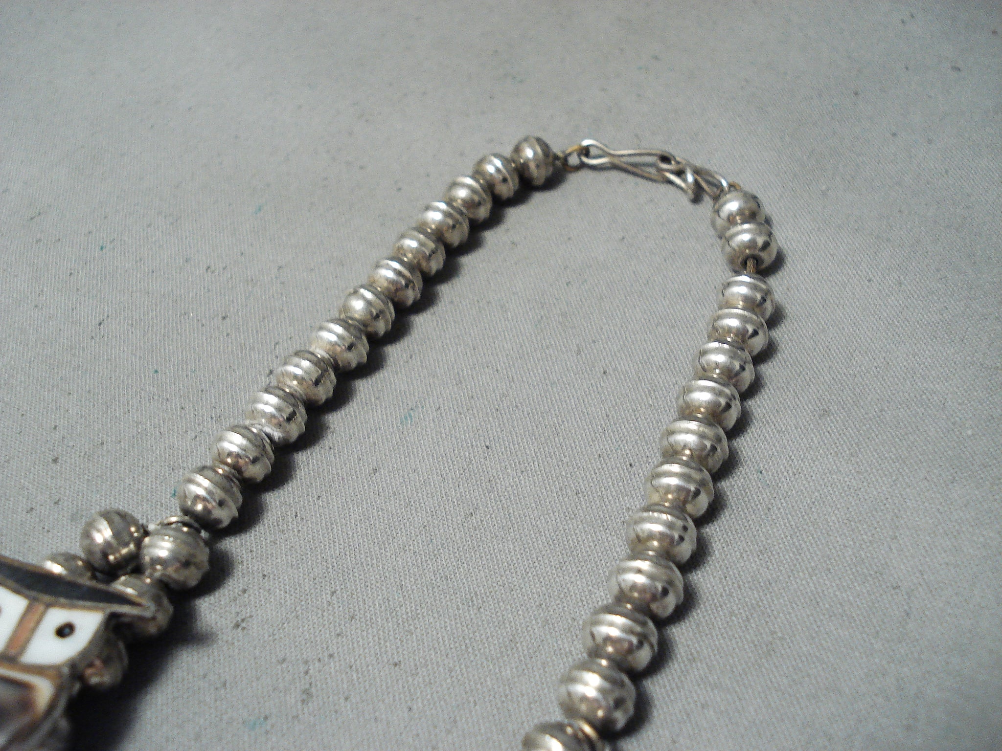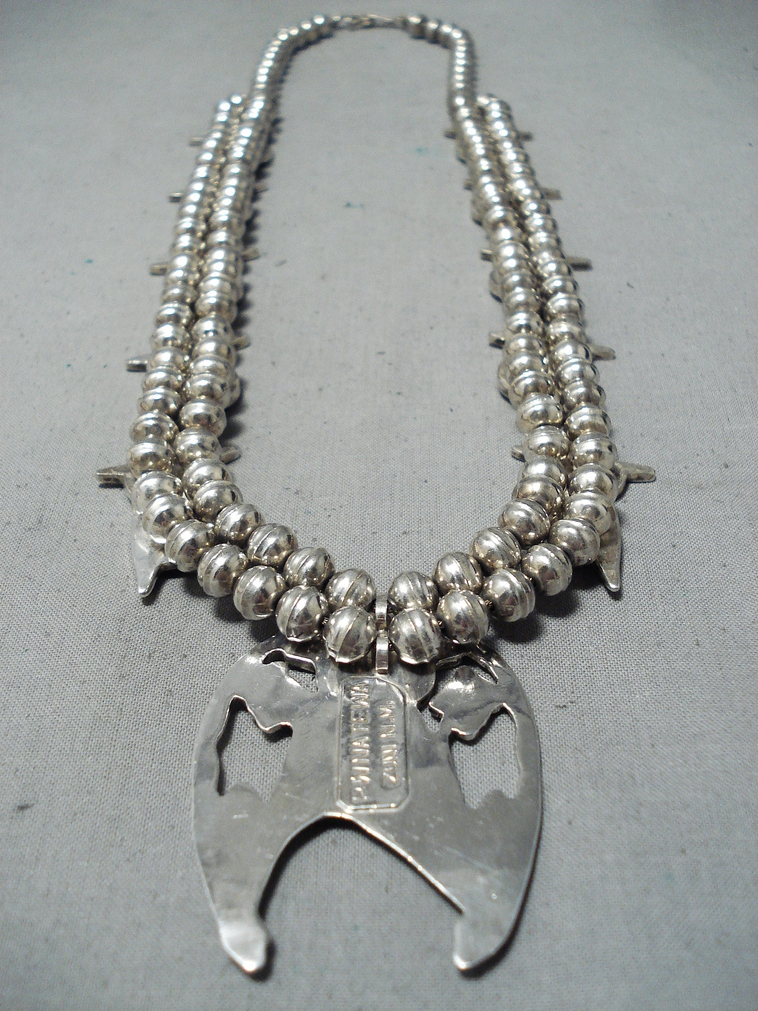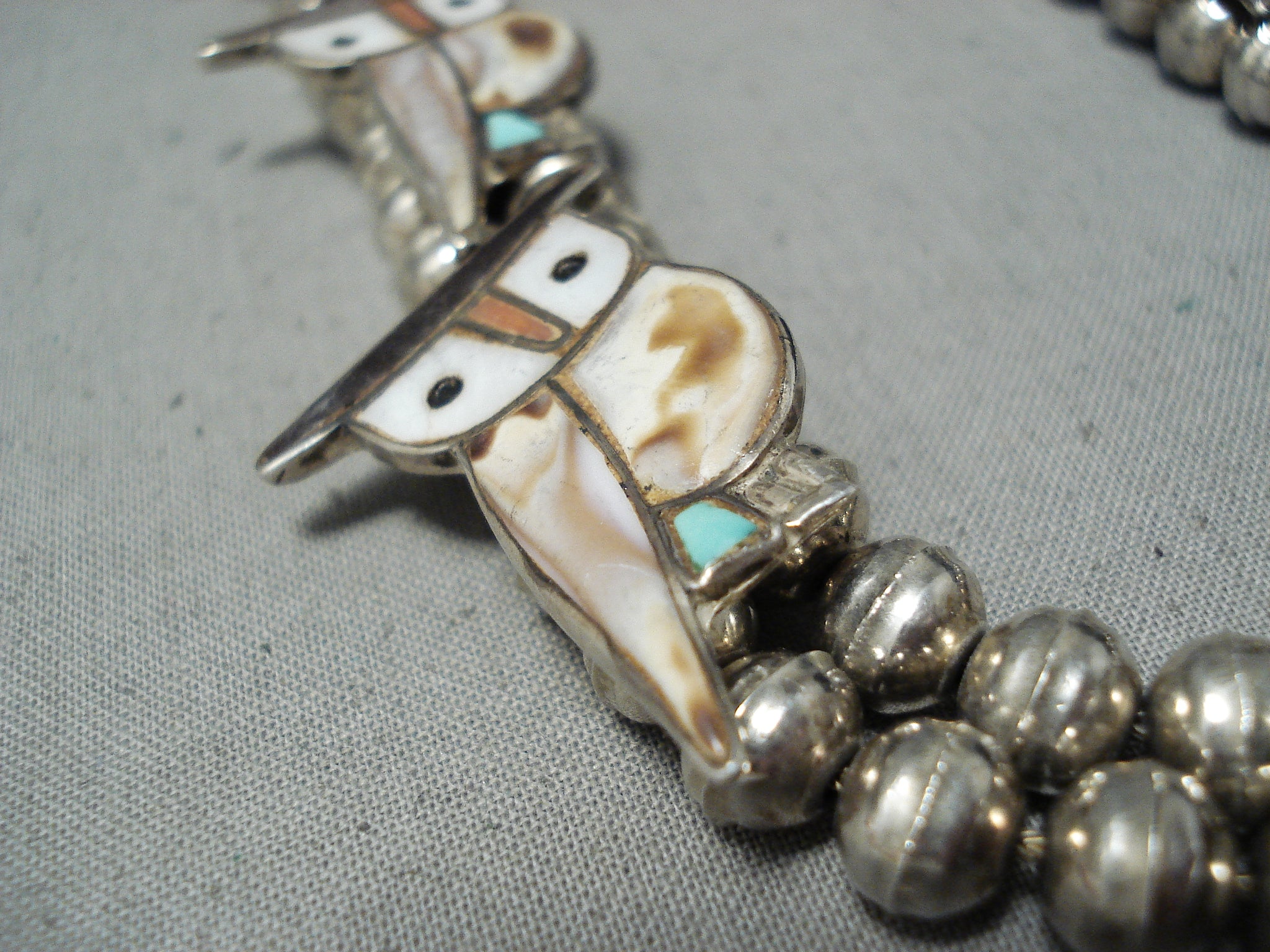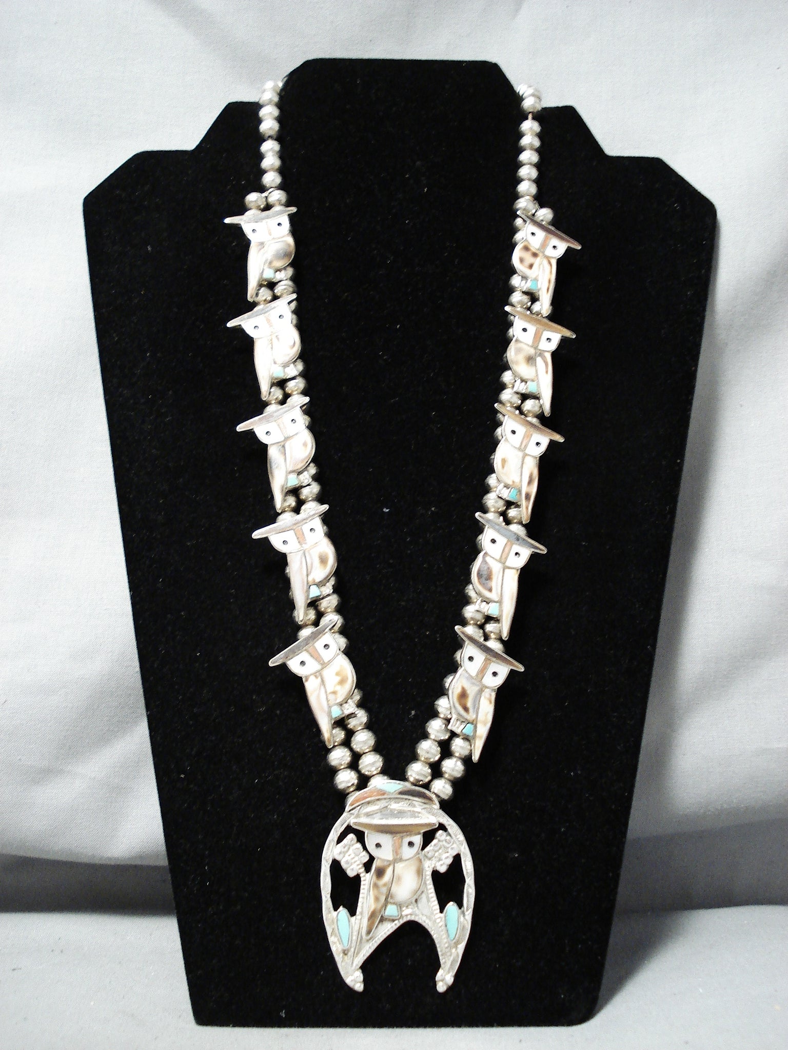Detailed Vintage Native American Zuni Turquoise Owl Sterling Silver Squash Blossom Necklace