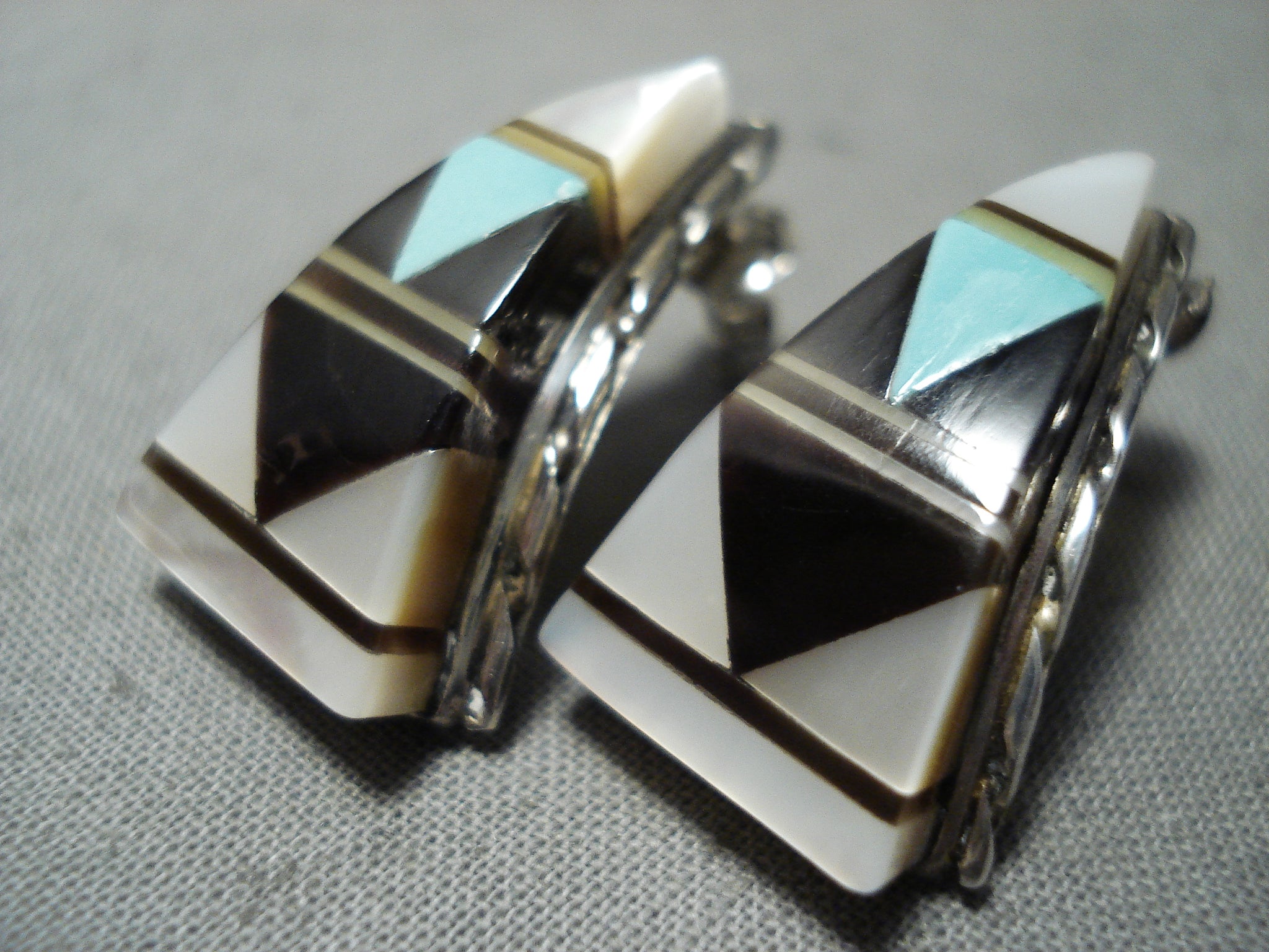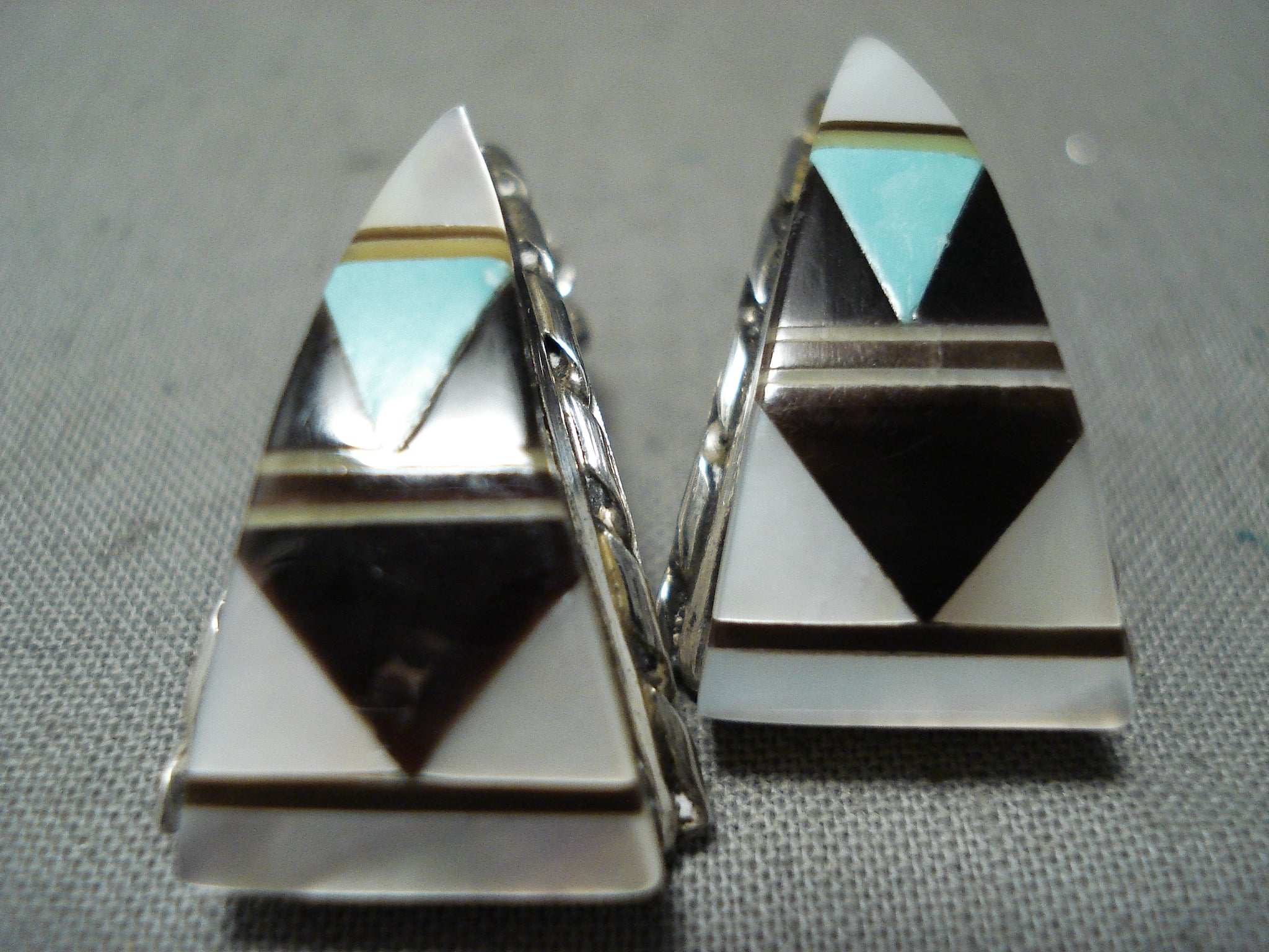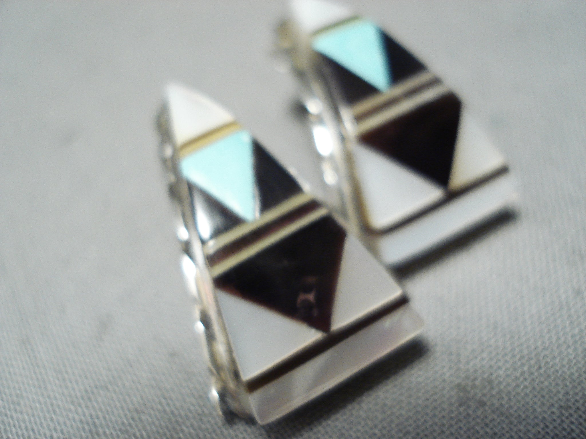 Detailed Vintage Native American Zuni Turquoise Sterling Silver Earrings