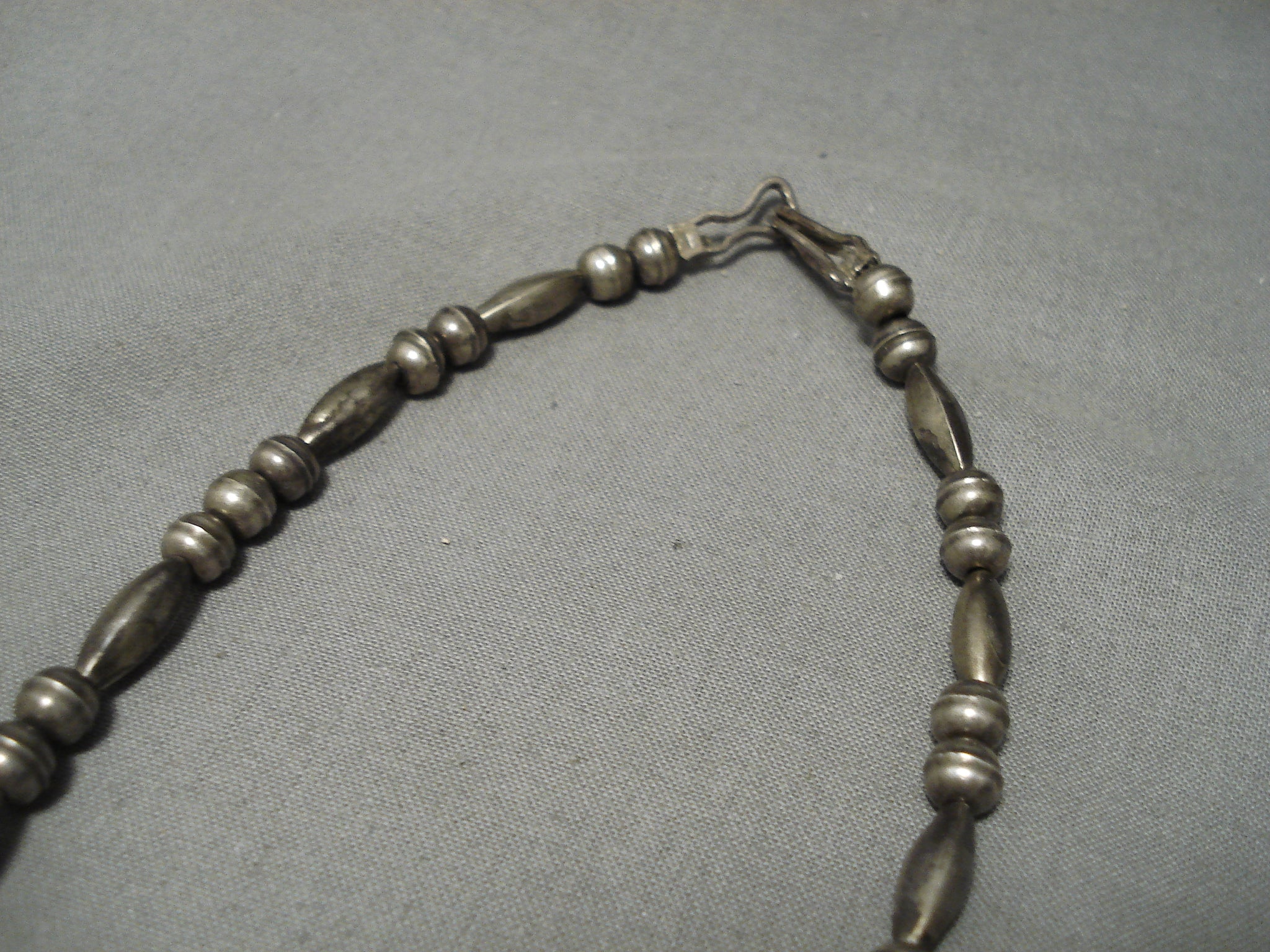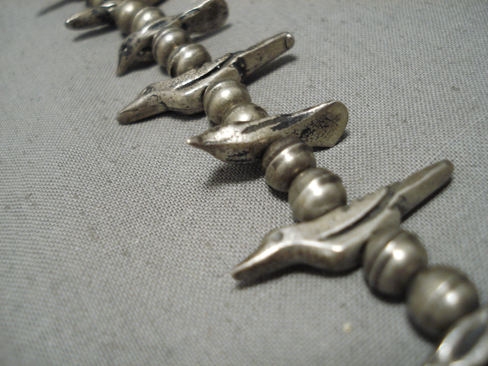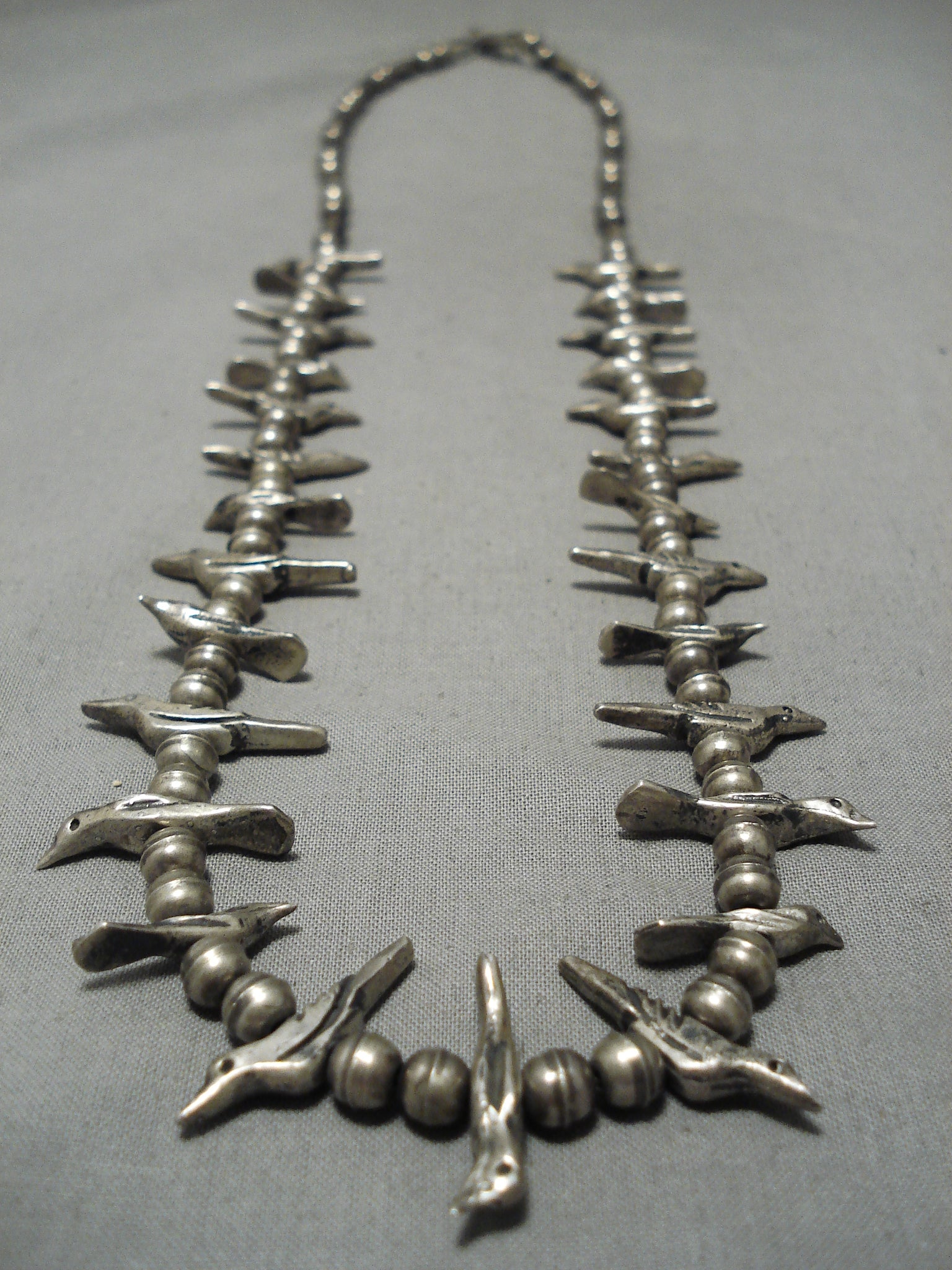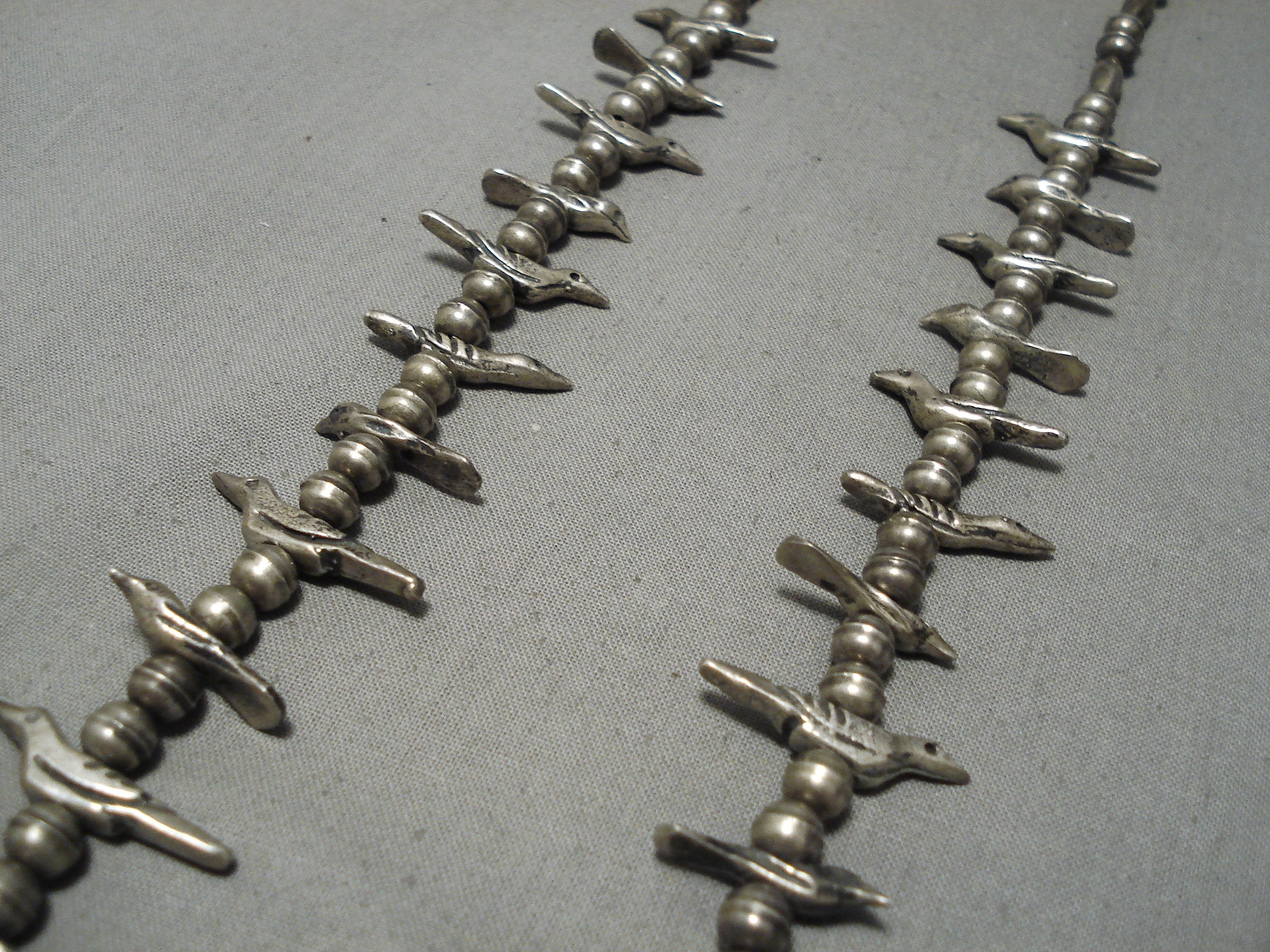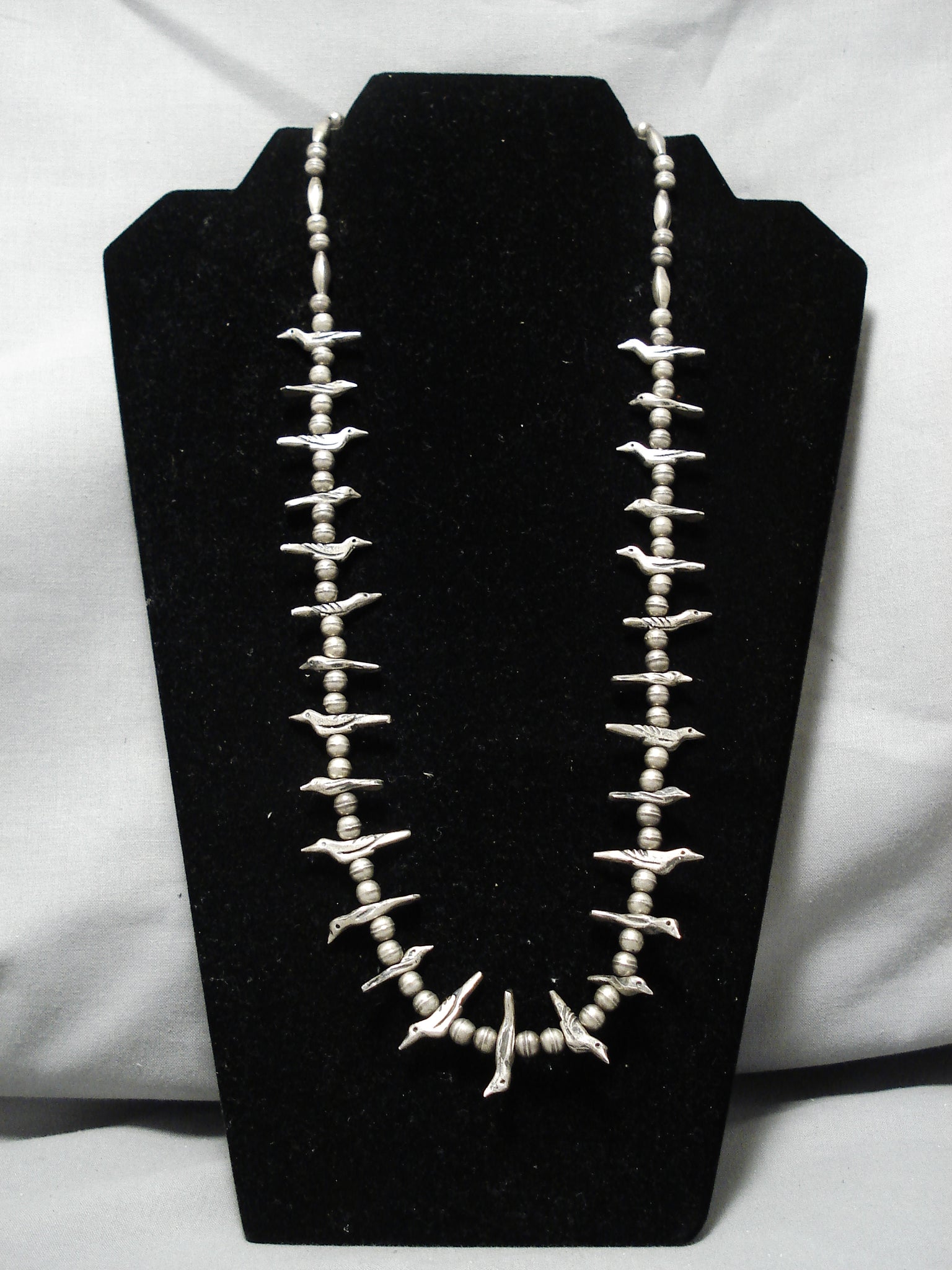 A tremendous vintage Navajo silver necklace. Calling all bird lovers! This fabulous silver bead necklace is home to 27 incredible handcarved silver feathered-friend fetishes – the largest of which measures about 1” x ¼”. Sterling silver. The length of the necklace measures around 29". Sturdy 82 grams.