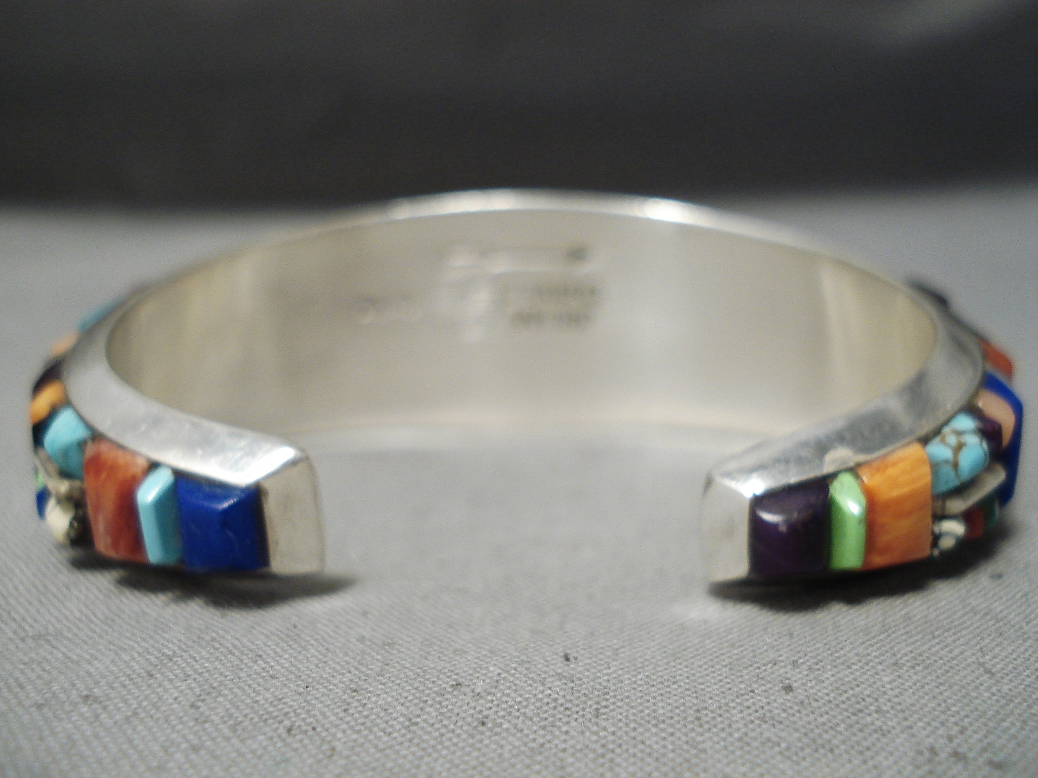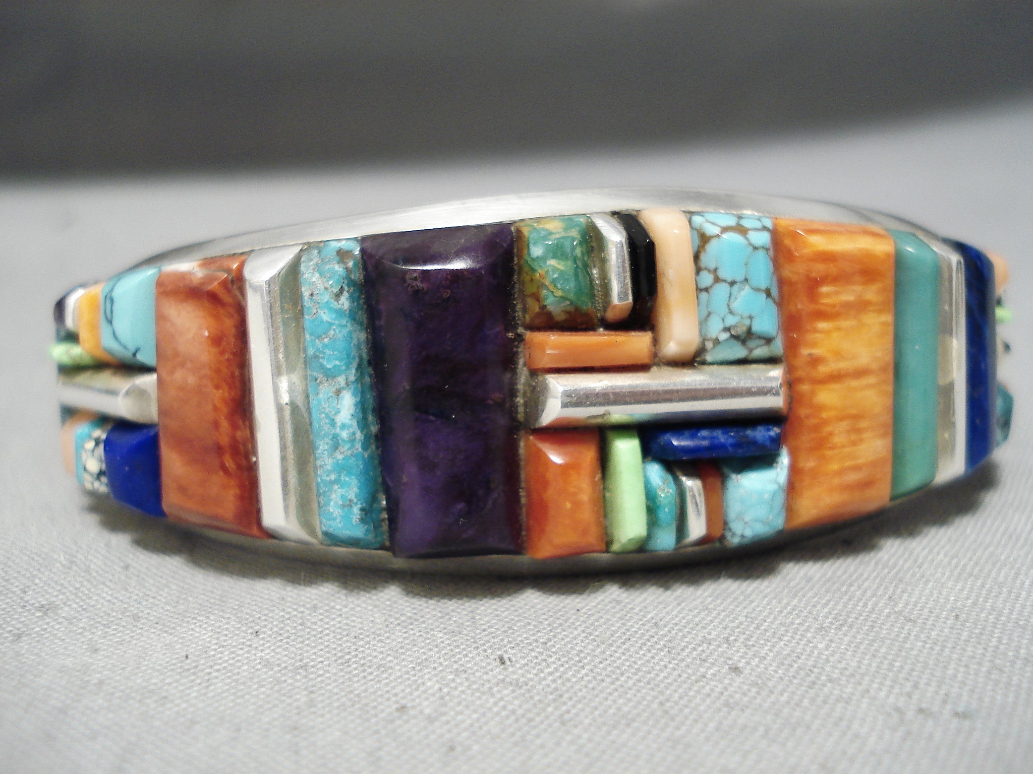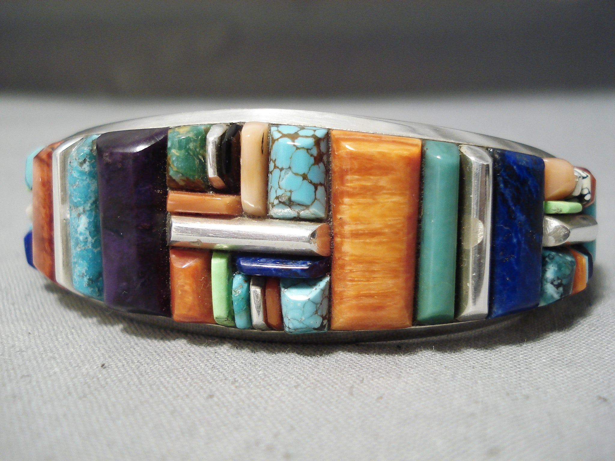Up for sale is this striking Zuni silver bracelet. OMGoodness! What a dynamic, spectacular cuff we have here – of a collection of the most vibrant and colorful eye-catching stones that include turquoise, coral, sugulite, lapis and gaspeite! The largest is about 3/4” x 5/16”. The largest stone measures around 3/4" x 5/16". The width of the bracelet measures around 7/8". Signed by Zuni artist, Julian Chavez. Sterling silver, marked. The inside end to end measures around 5-7/8" with an additional 7/8" gap. Sturdy 56 grams.