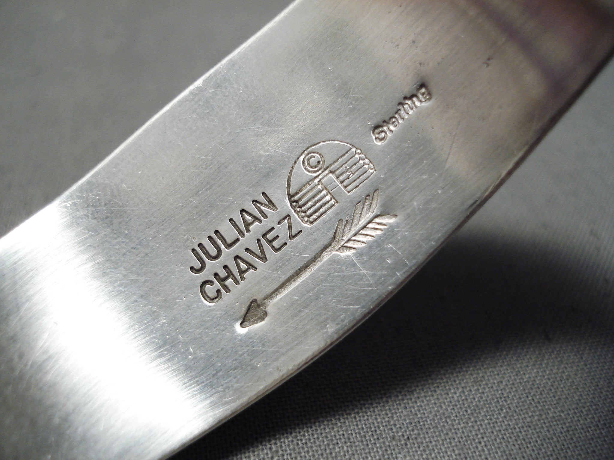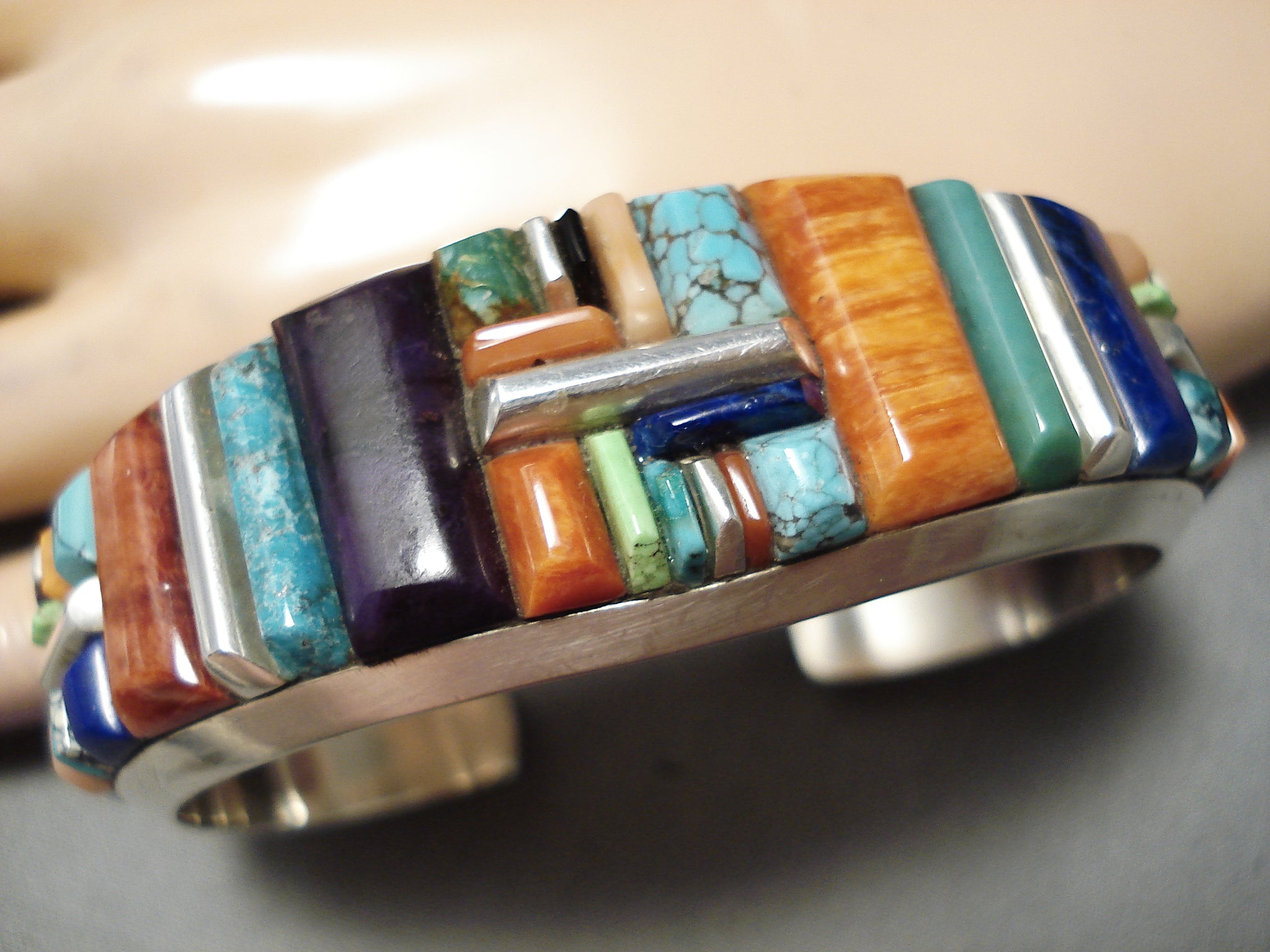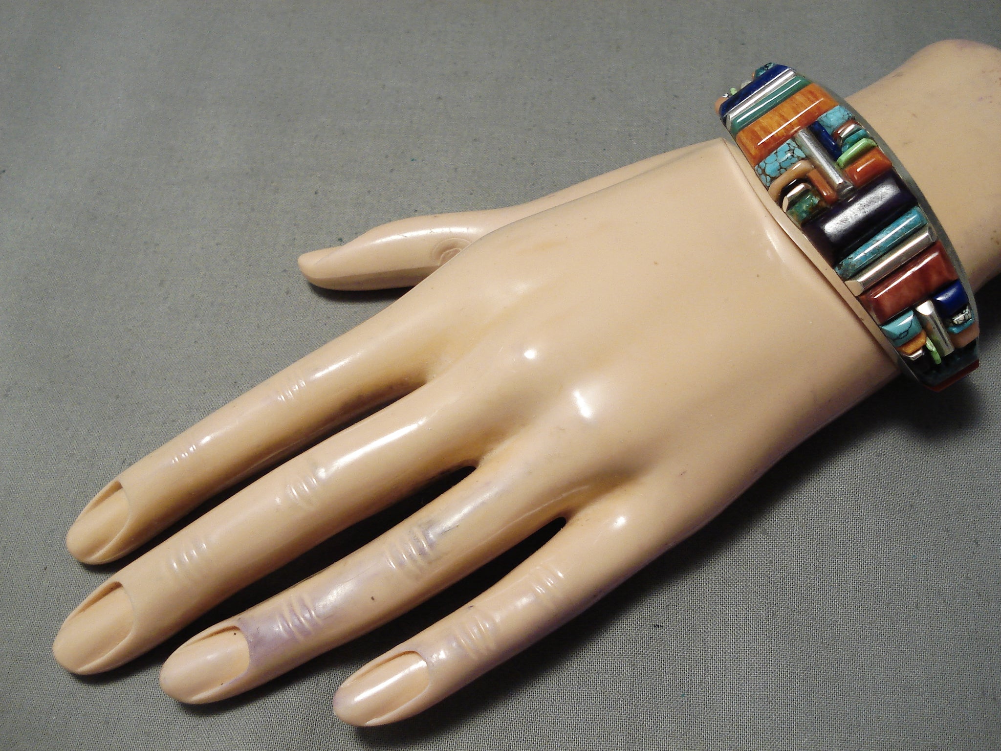 Up for sale is this striking Zuni silver bracelet. OMGoodness! What a dynamic, spectacular cuff we have here – of a collection of the most vibrant and colorful eye-catching stones that include turquoise, coral, sugulite, lapis and gaspeite! The largest is about 3/4” x 5/16”. The largest stone measures around 3/4" x 5/16". The width of the bracelet measures around 7/8". Signed by Zuni artist, Julian Chavez. Sterling silver, marked. The inside end to end measures around 5-7/8" with an additional 7/8" gap. Sturdy 56 grams.