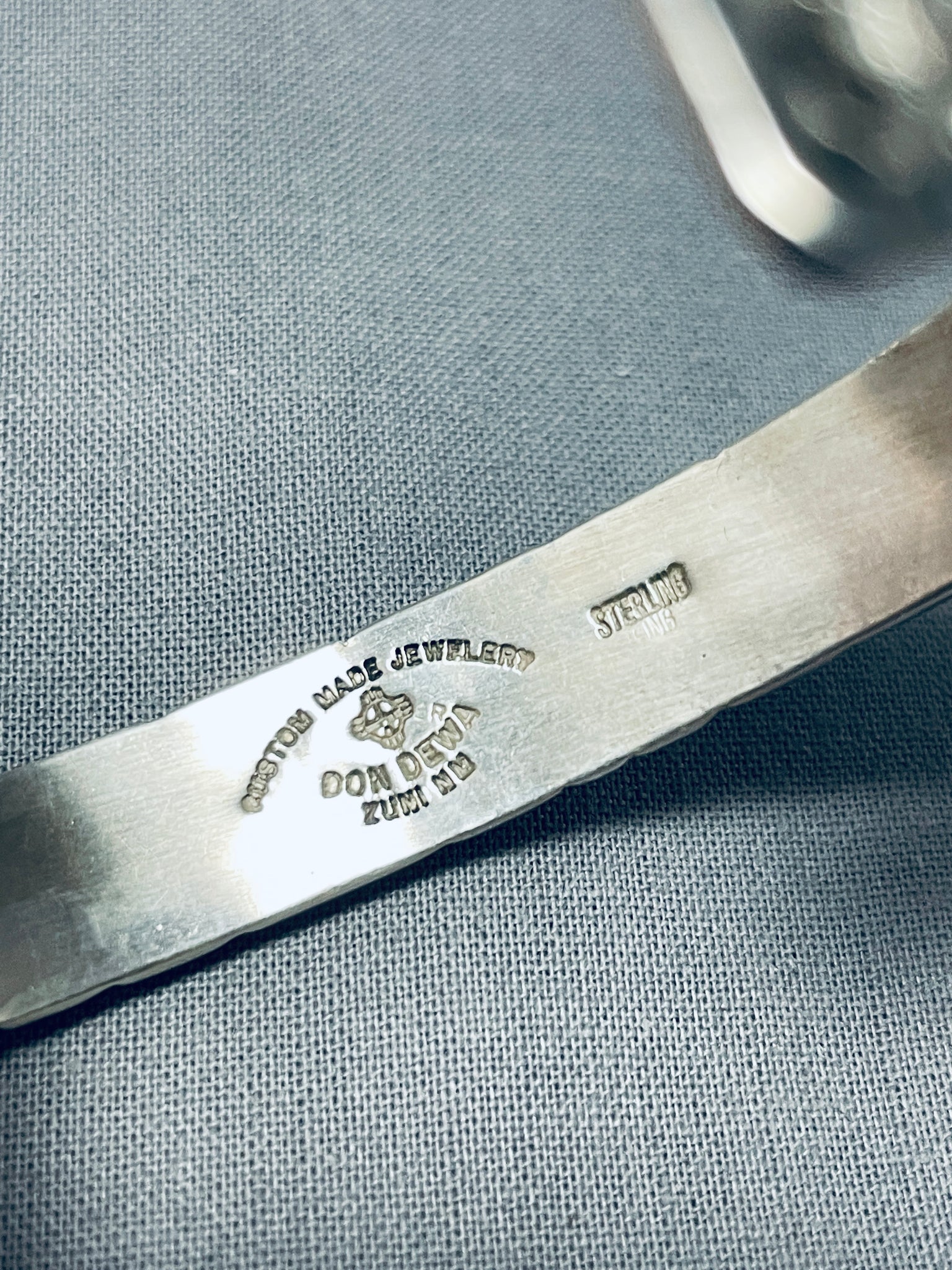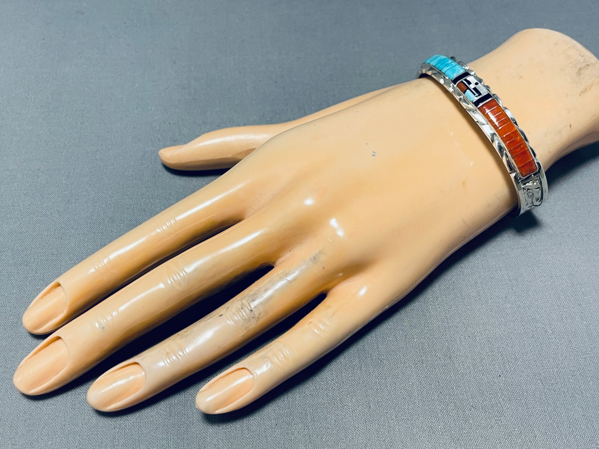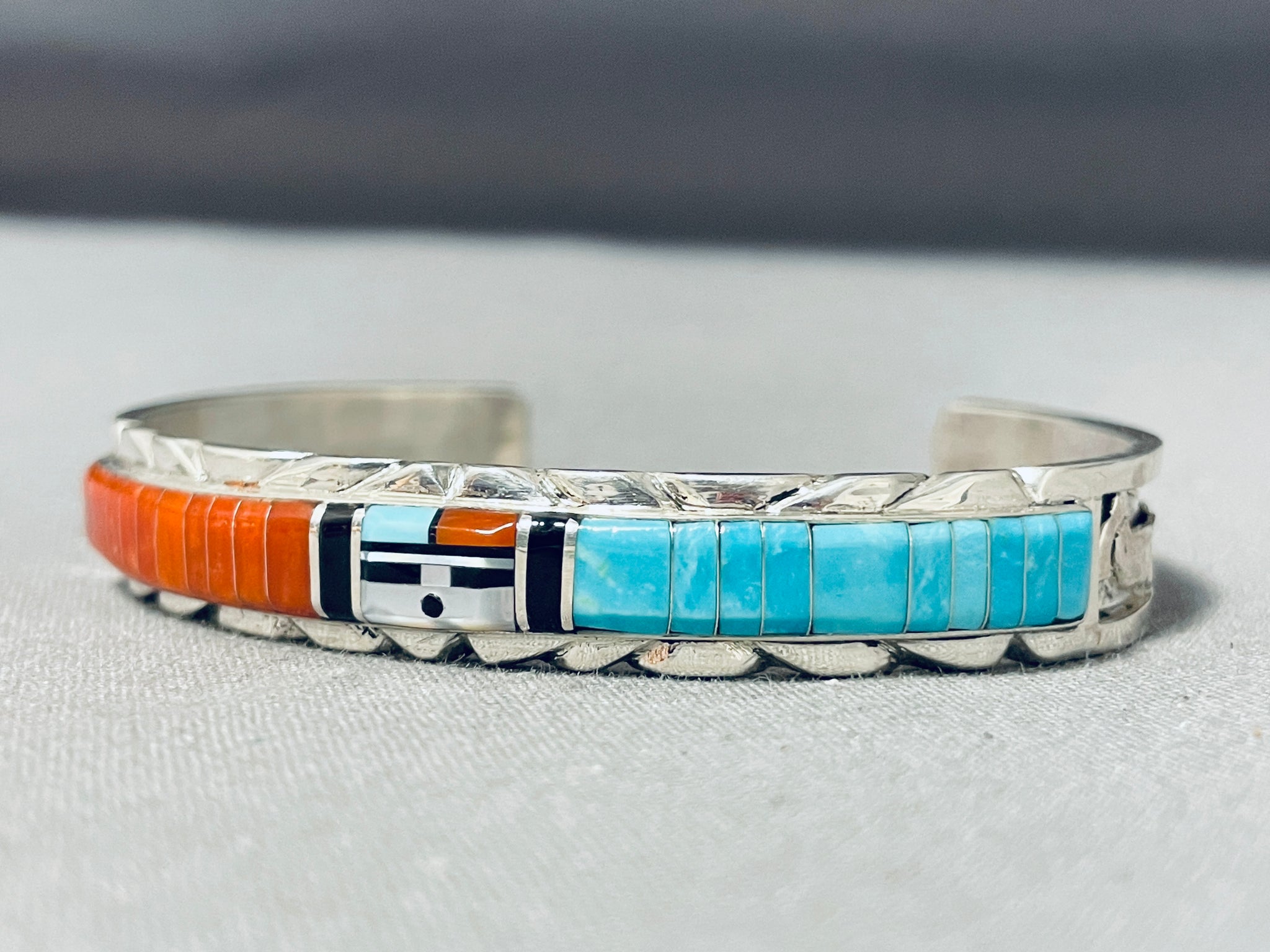 Don Dewa Native American Zuni Coral Turquoise Sterling Silver Sunface Bracelet