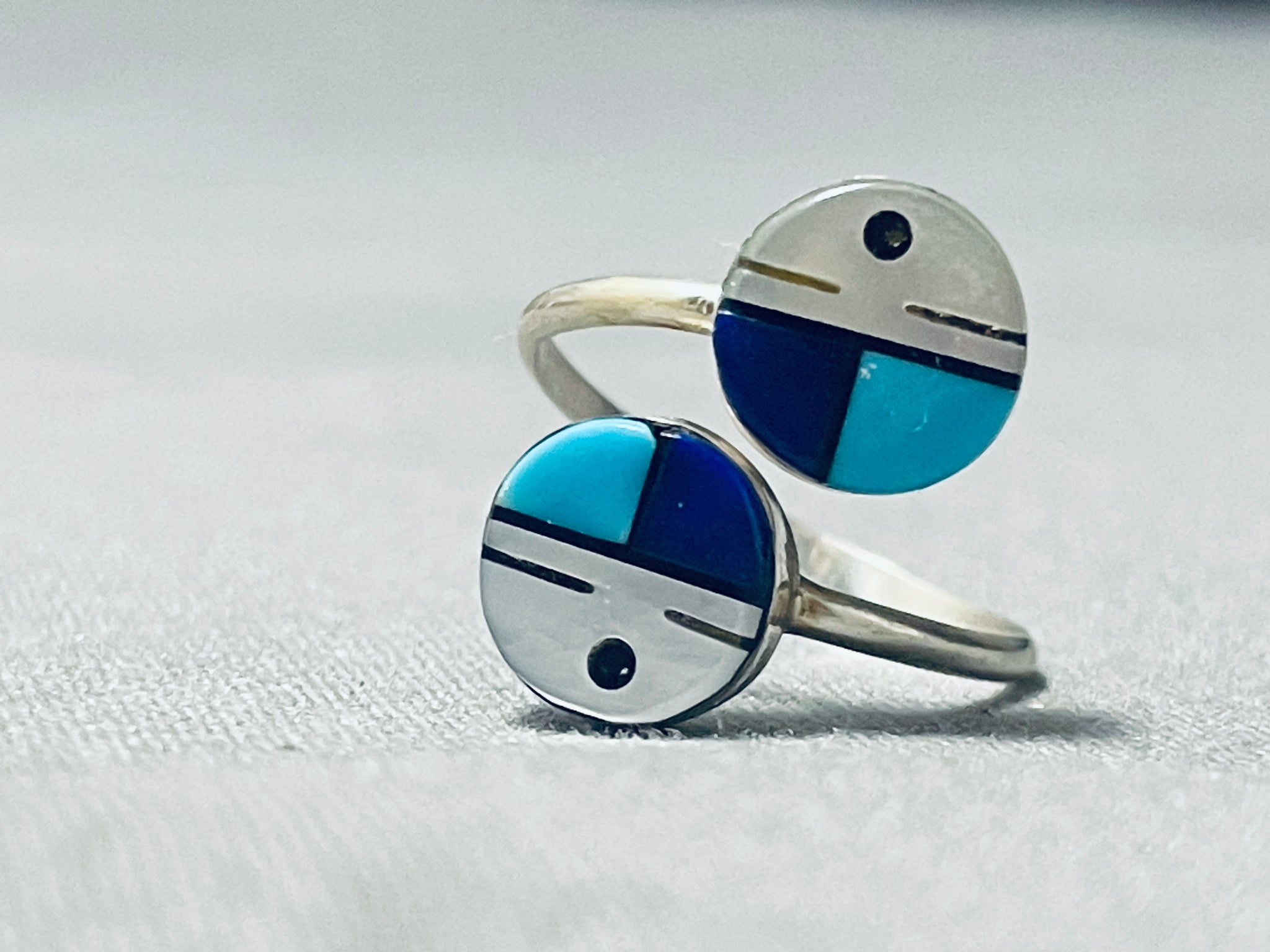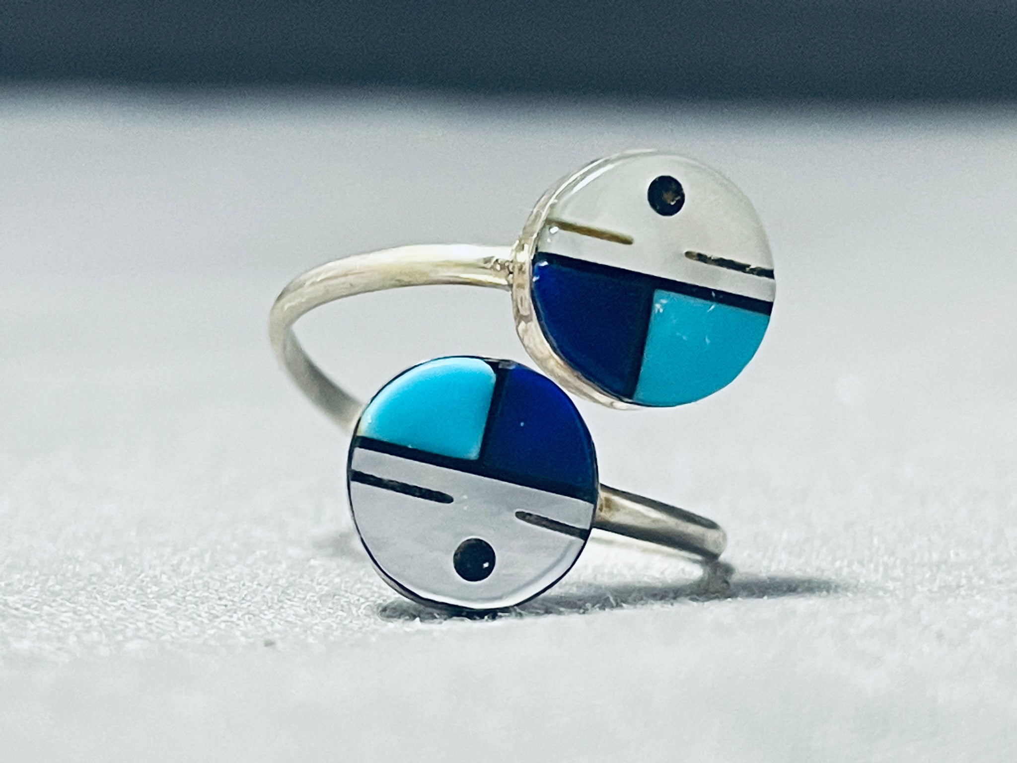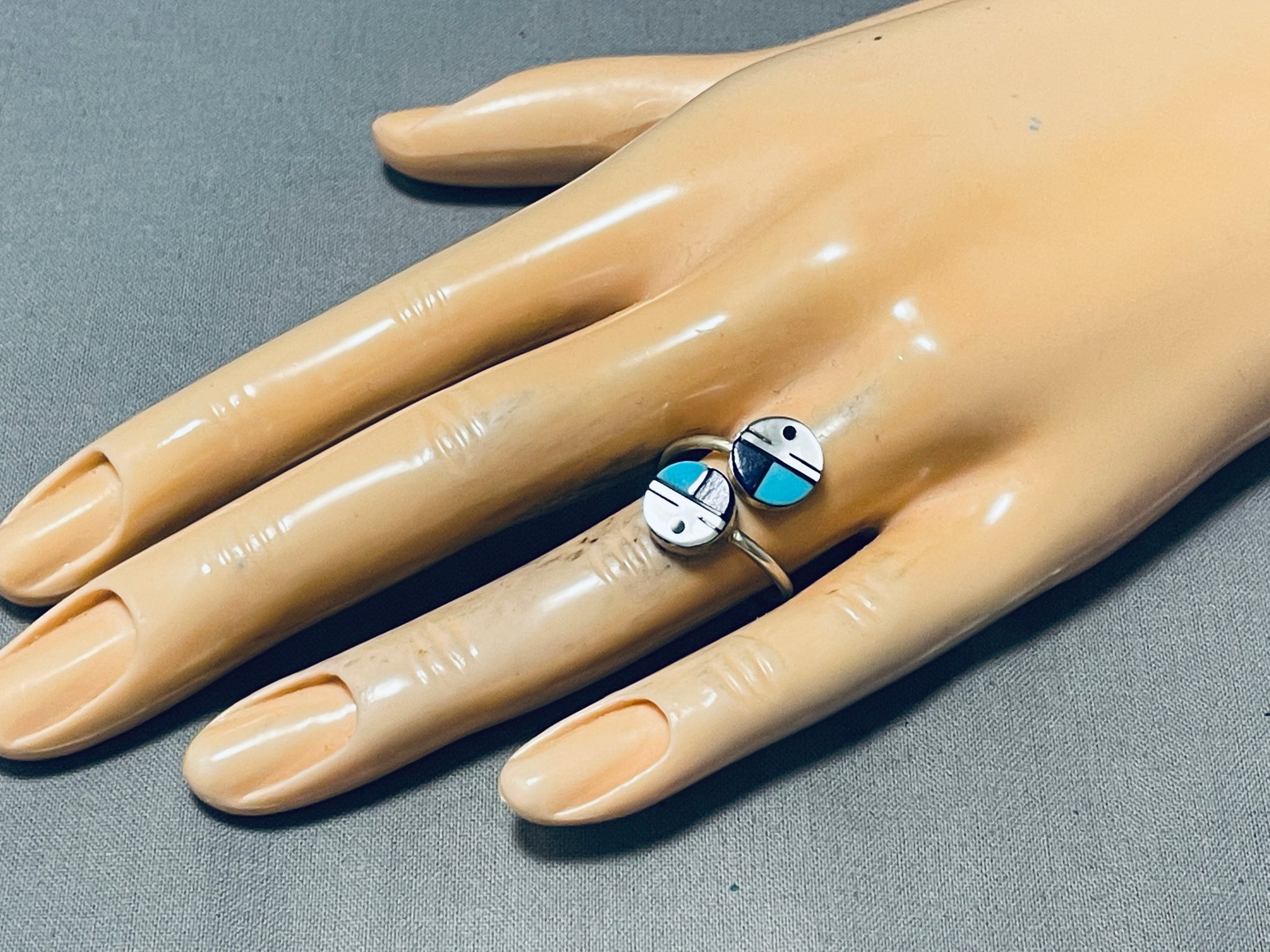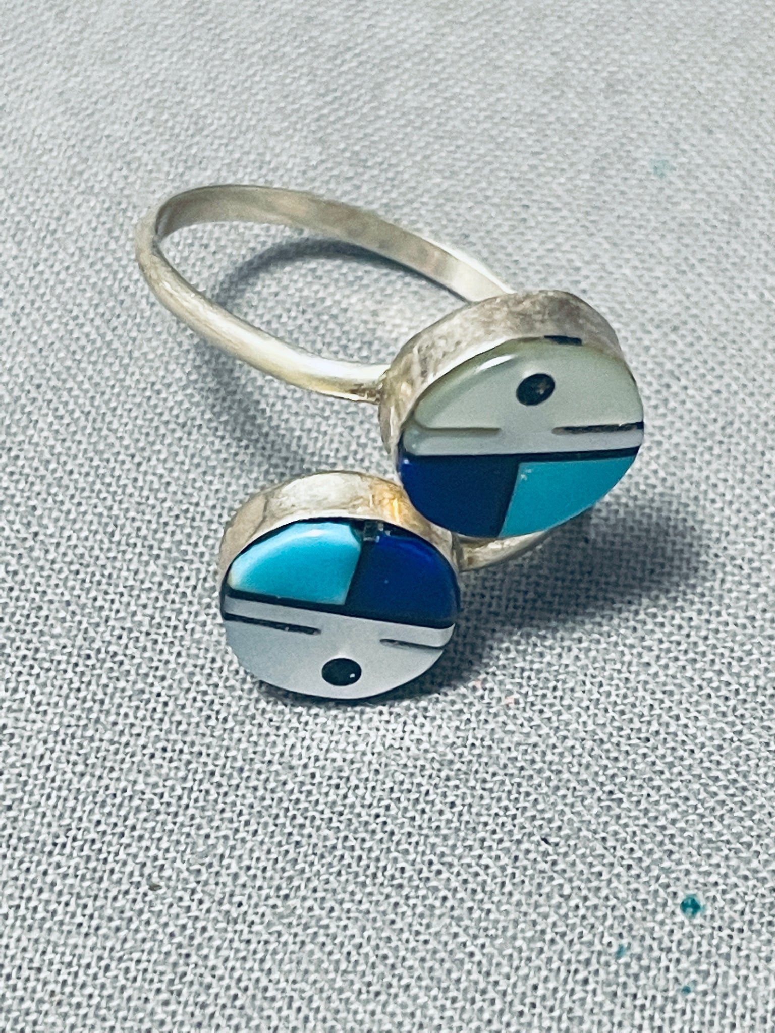 Double Kachina Face Vintage Native American Zuni Turquoise Sterling Silver Inlay Ring