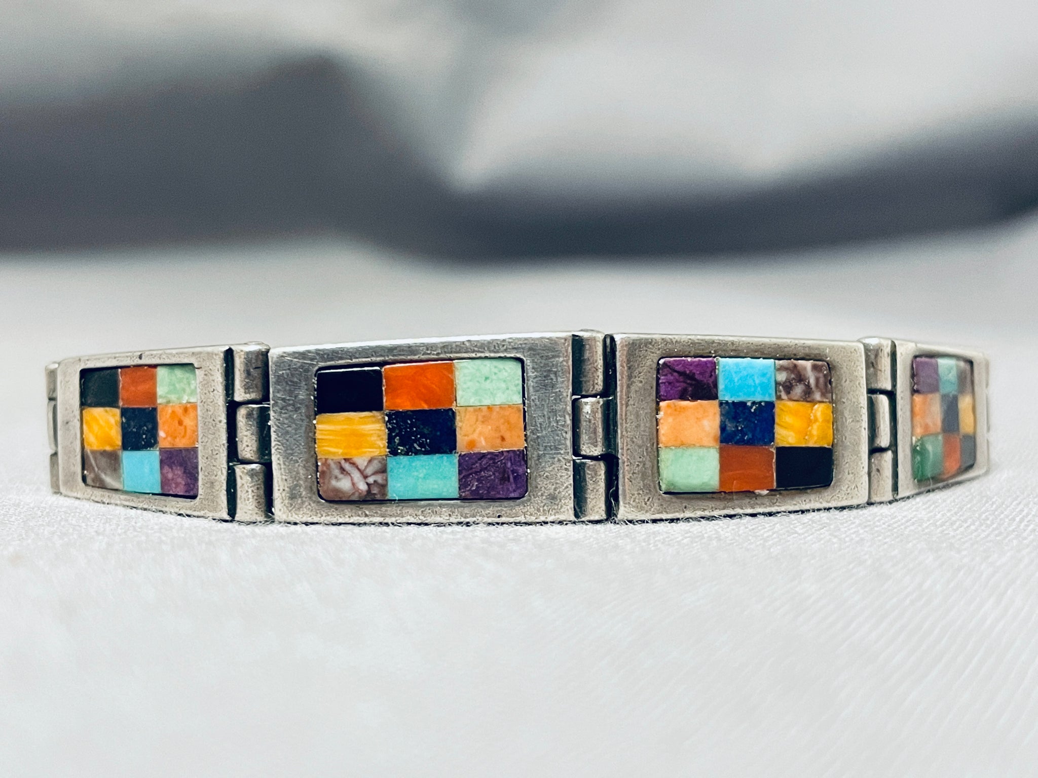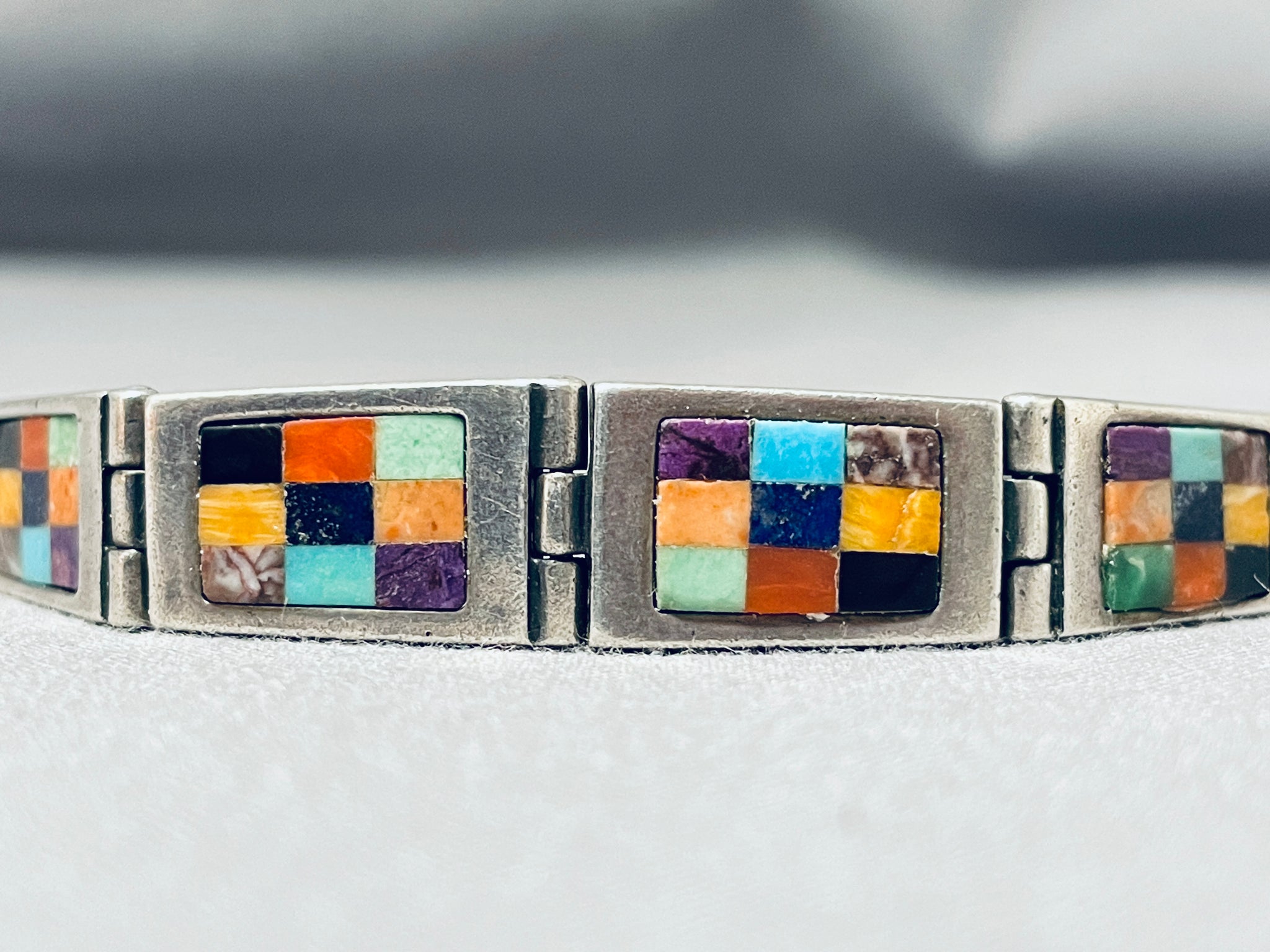 Double Technique Vintage Native American Navajo Turquoise Sterling Silver Link Bracelet