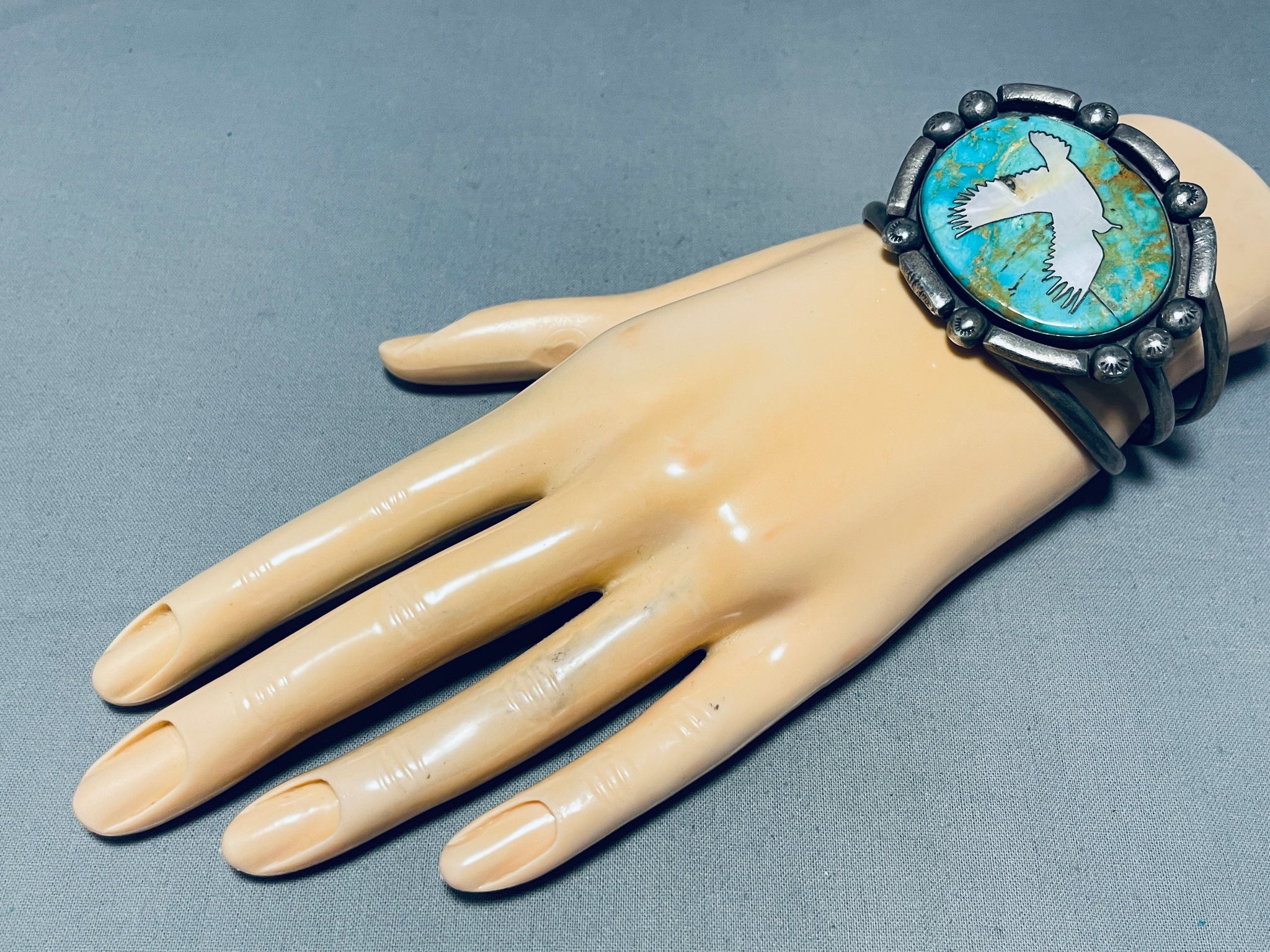 This is a tremendous vintage Navajo inlaid dove silver bracelet. This fascinating bracelet contains a center inlaid section that includes Number 8 turquoise and a mother of pearl dove. Bordering the large inlaid section consists of thick silver works that include raindrops and stems. This bracelet contains a sturdy and thick triple silver shank cuff that graduates in width towards the center. The old natural patina is marvelous. The center stone measures around 1-5/8" x 1-1/4". The width of the bracelet measures around 1-5/8". Sterling silver. Cir. 1970's+. The inside end to end measures around 5-1/2" with an additional 1" gap. Sturdy 64 grams.