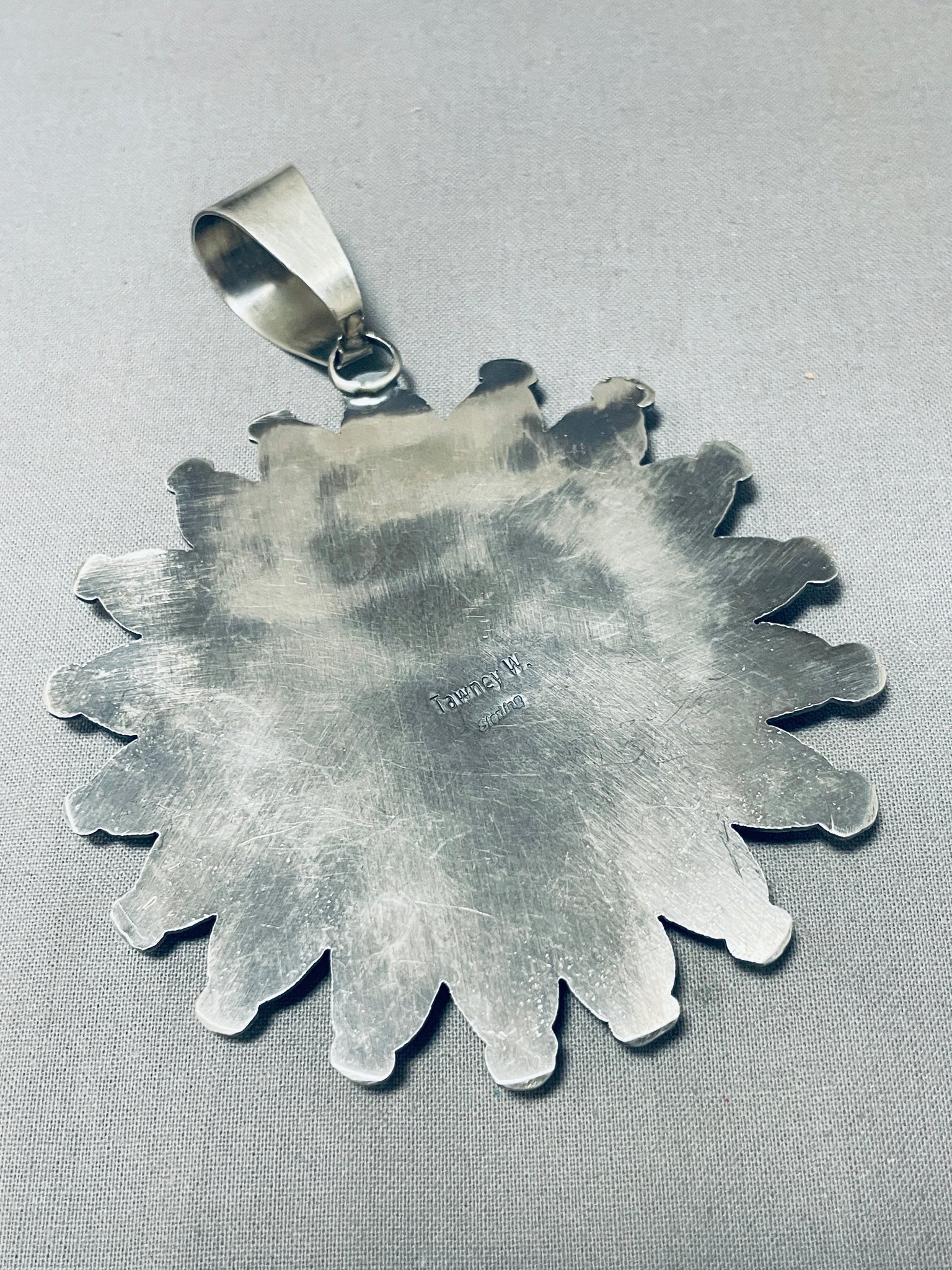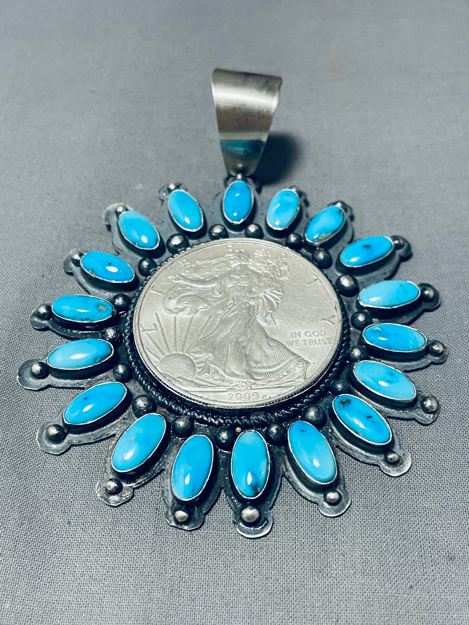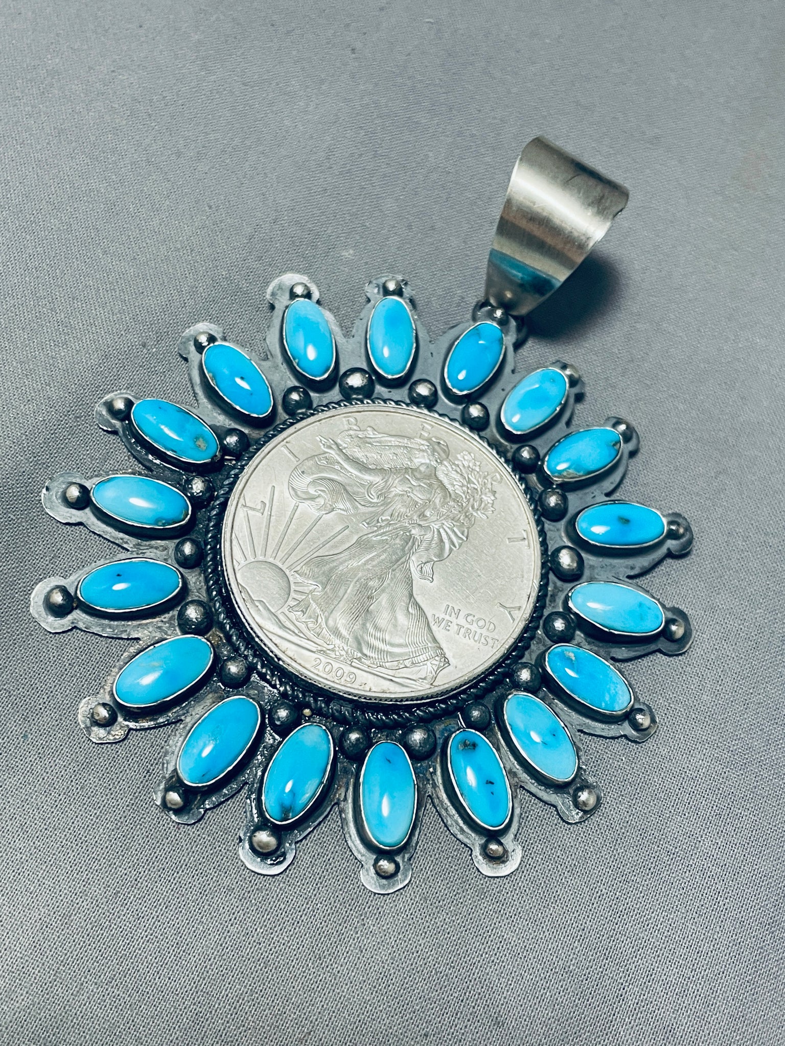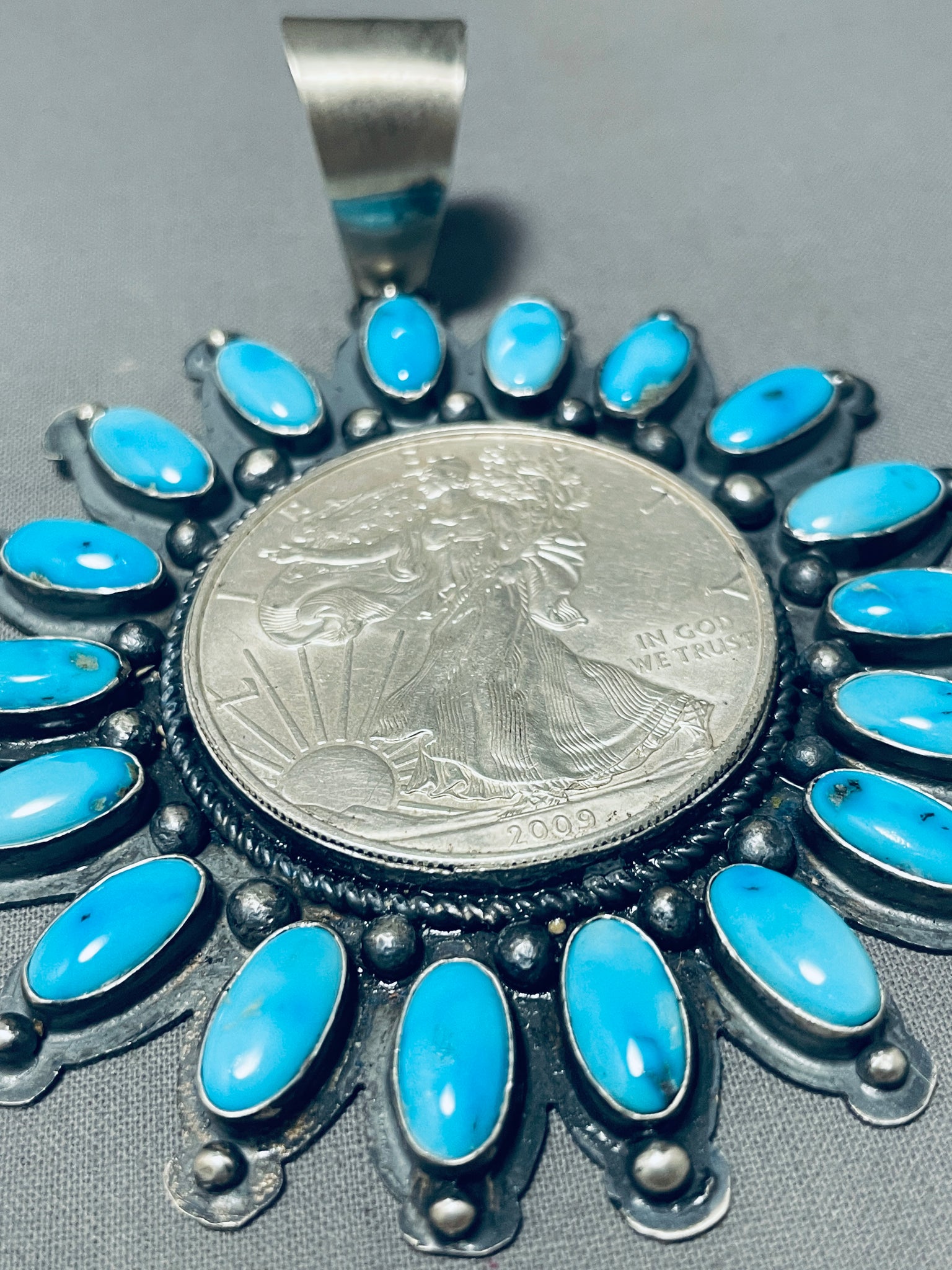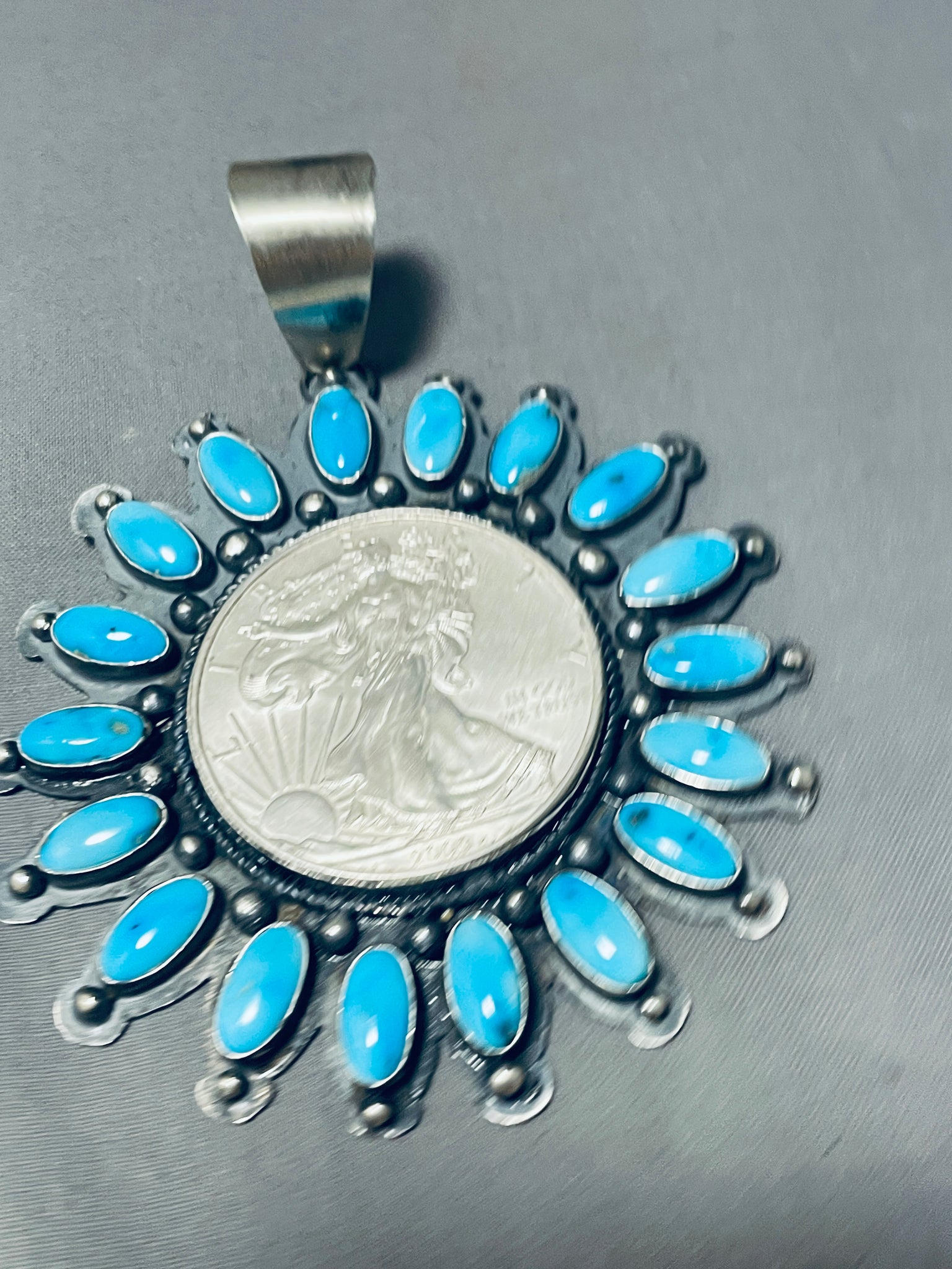 Dramatic Native American Navajo Kingman Turquoise & Coin Sterling Silver Pendant Signed