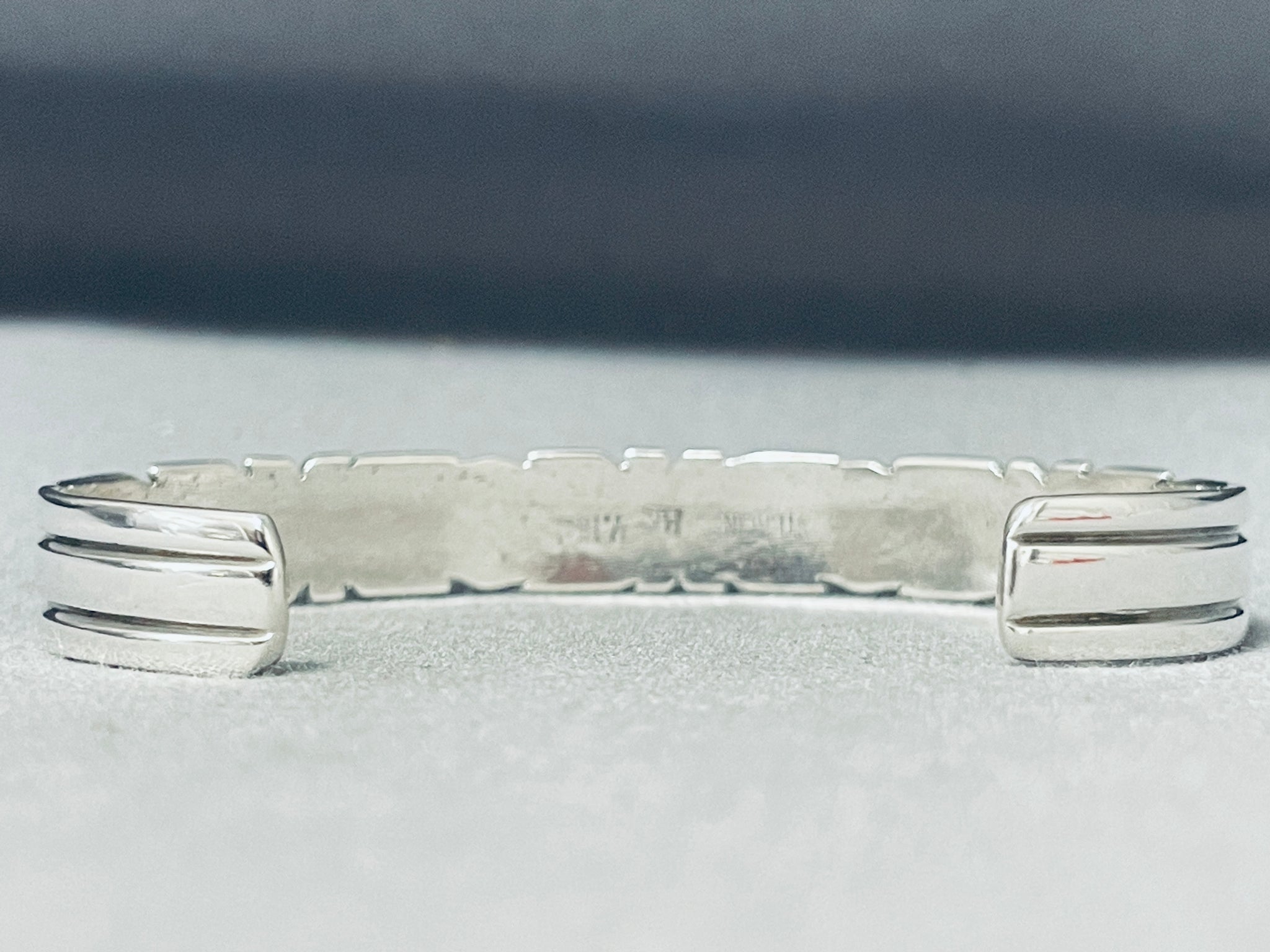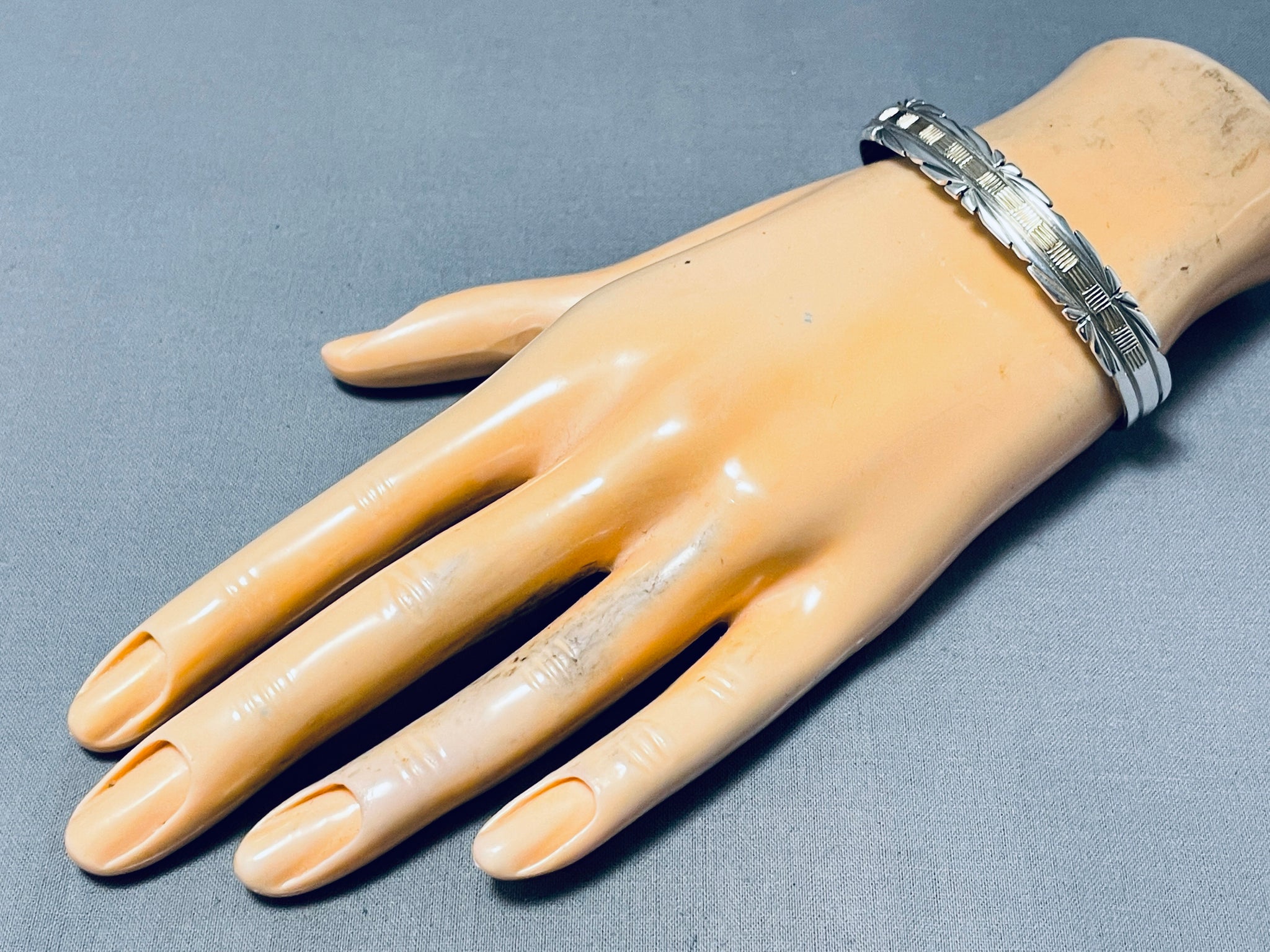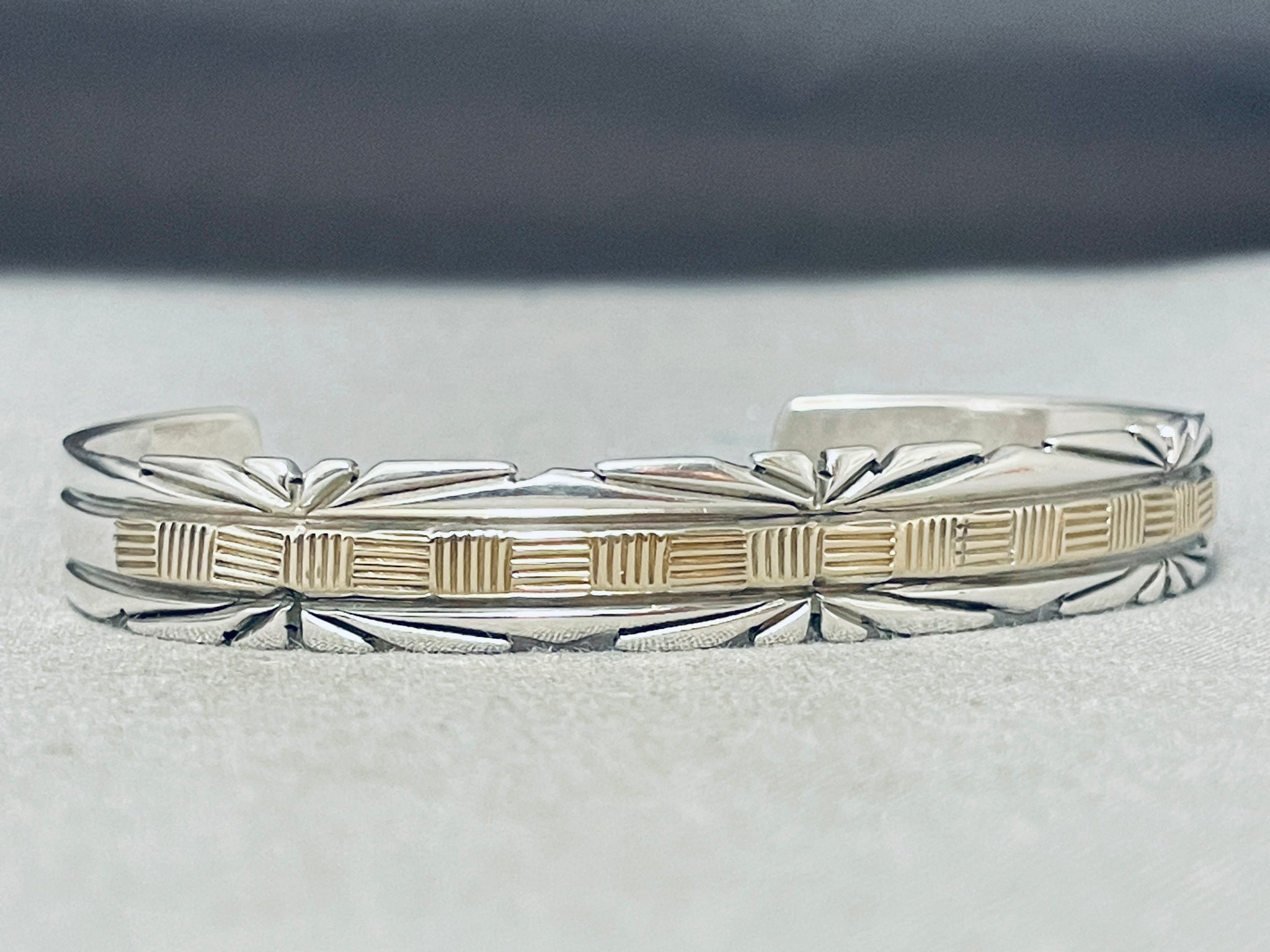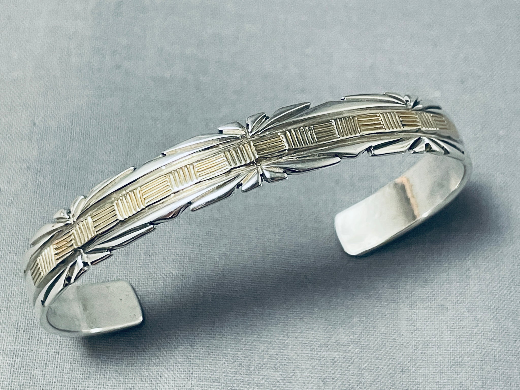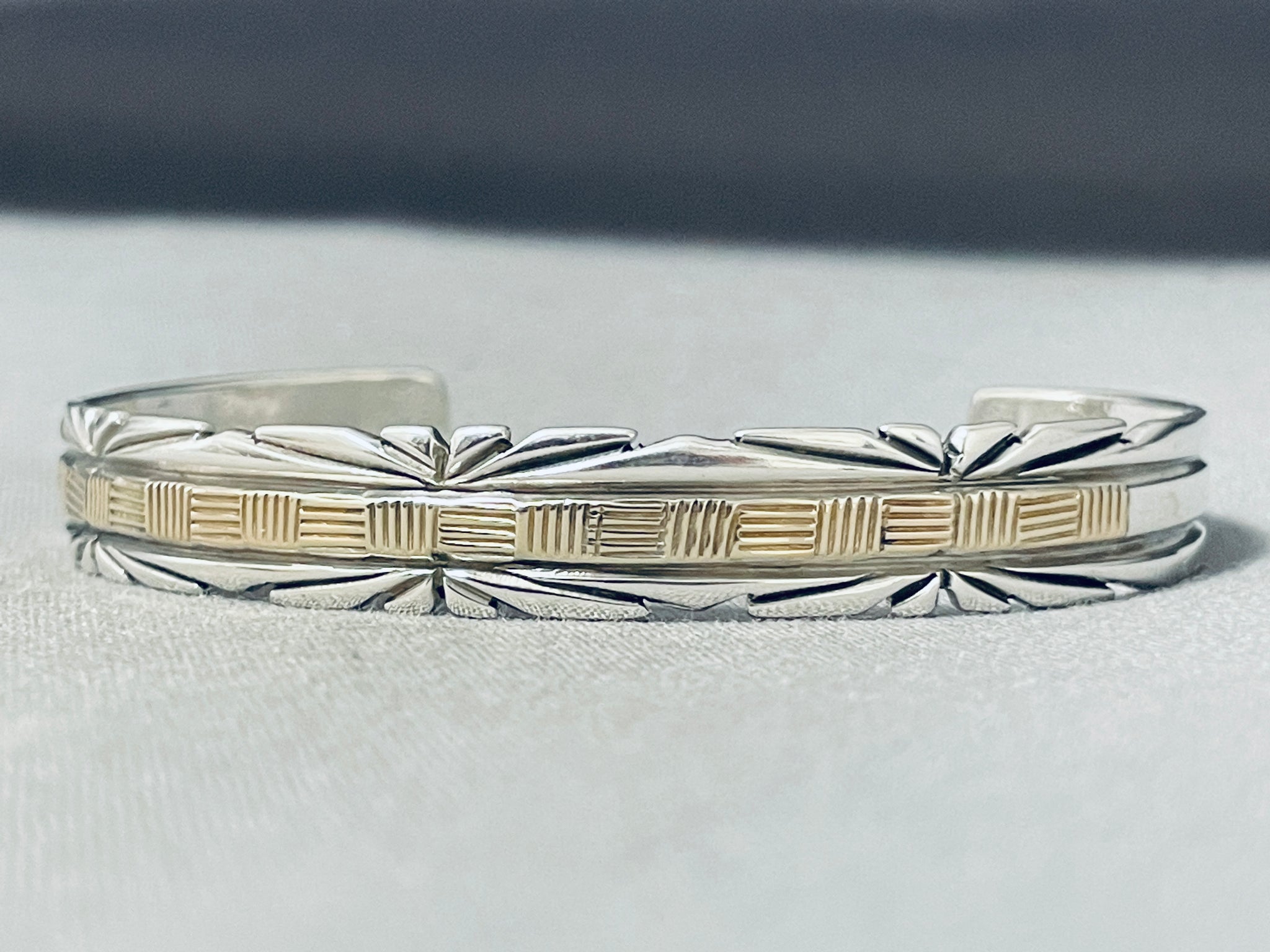 Dramatic Native American Navajo Sterling Silver And 14k Gold Signed Bracelet
