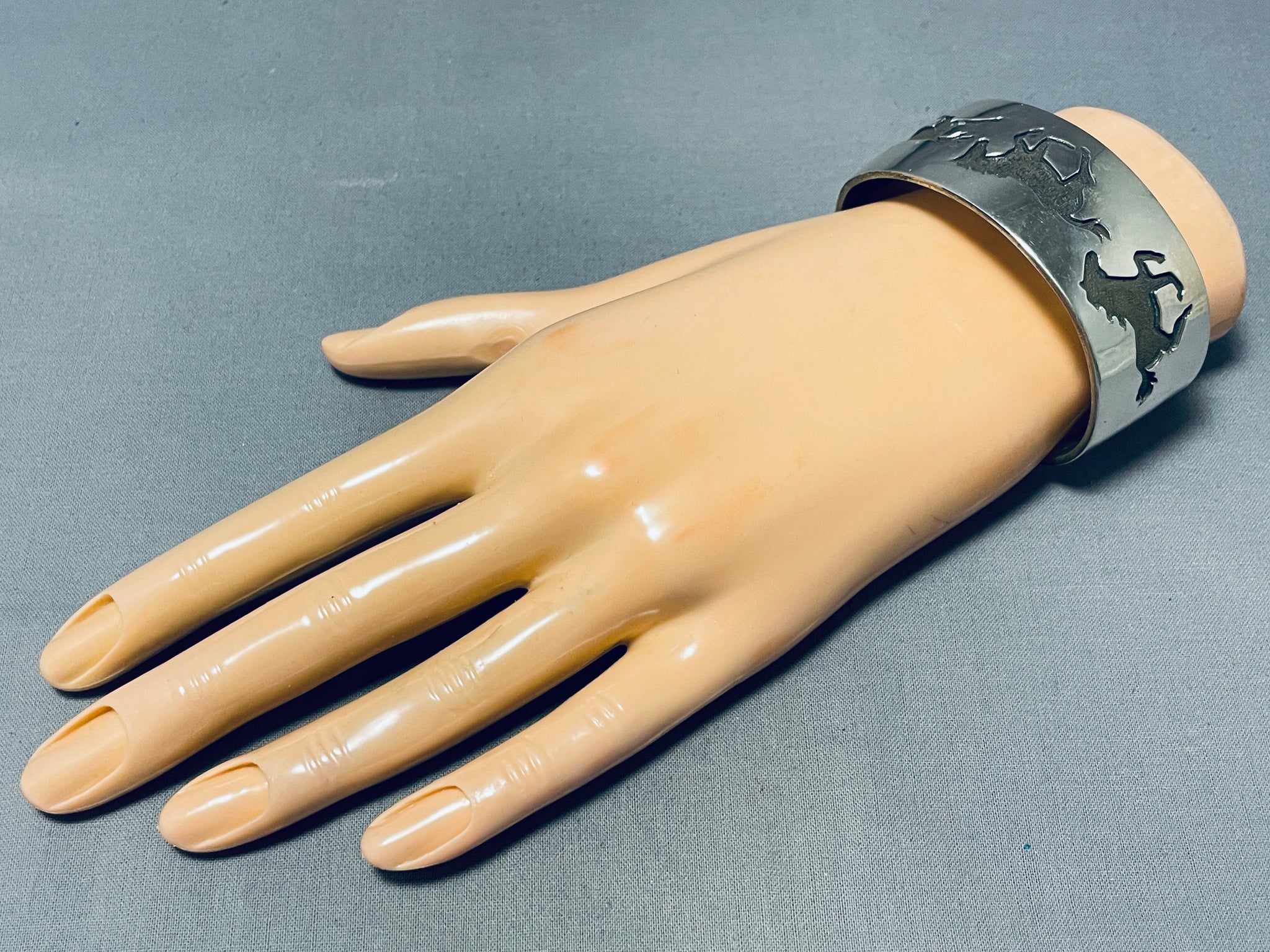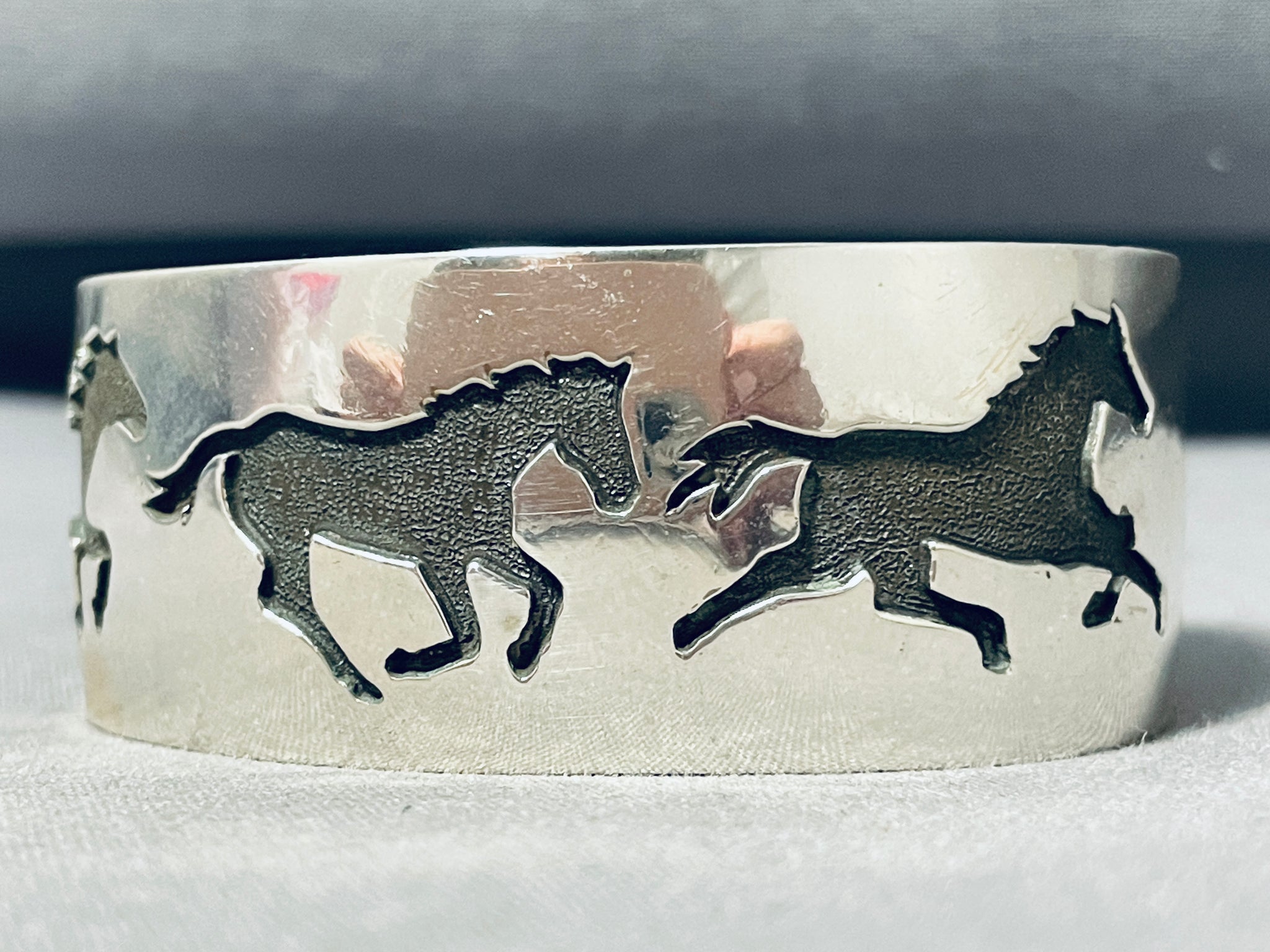 Dramatic Native American Navajo Sterling Silver Horses Bracelet Fred Douglas Signed
