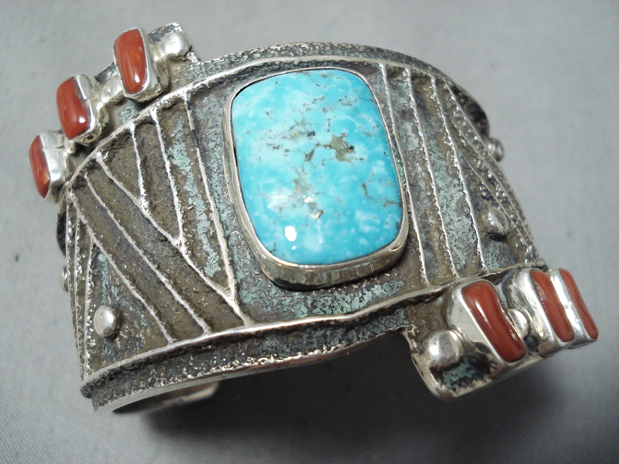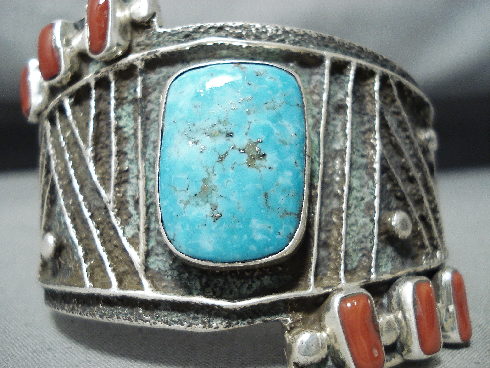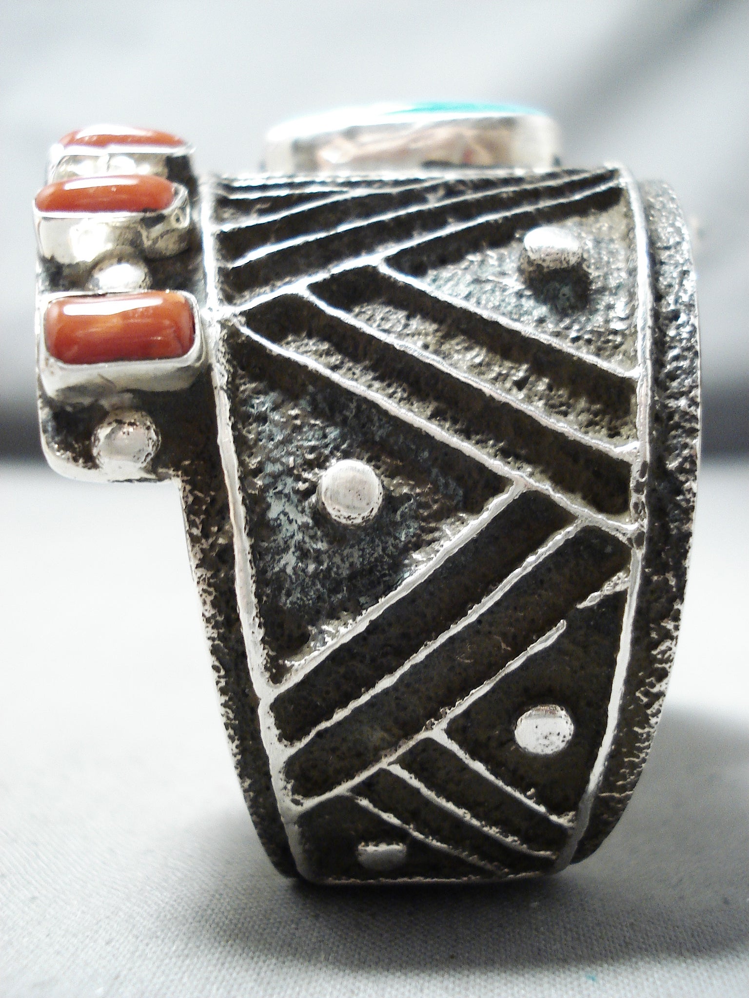This is an exceptional Navajo silver bracelet. The raised lines and beads spring forth from the textured background of the wide cuff - as your eye is drawn to the breathtaking huge southwestern sky blue turquoise in the center! Then just to the side of center - set above and below is a colorful section of triple corals and silver beads! The center stone measures around 7/8" x 5/8". The width of the bracelet measures around 2". Signed by Navajo artist, D. Arviso. Sterling silver, marked. The inside end to end measures around 5-3/8" with an additional 1-1/4" gap. Sturdy 124 grams.
