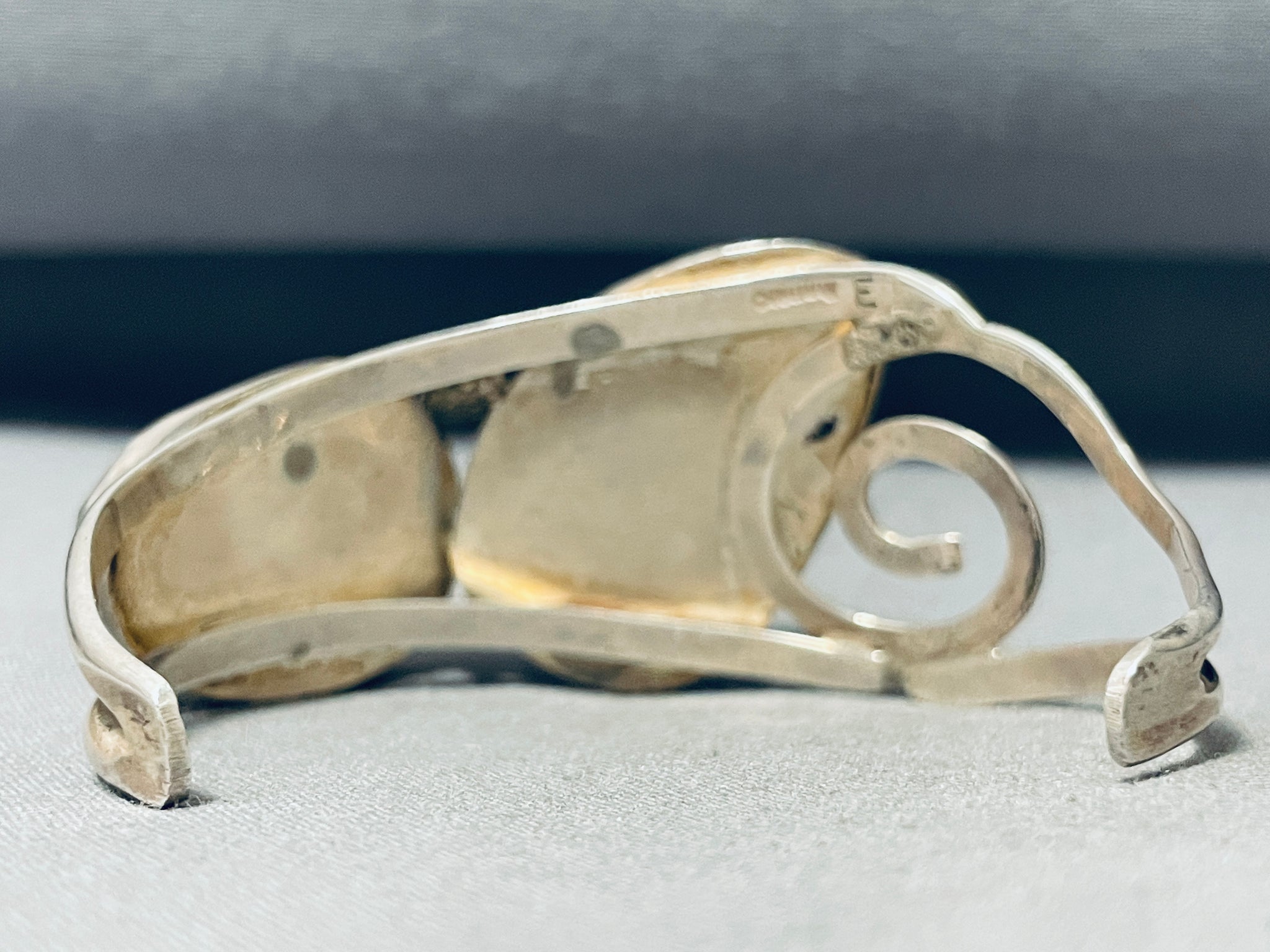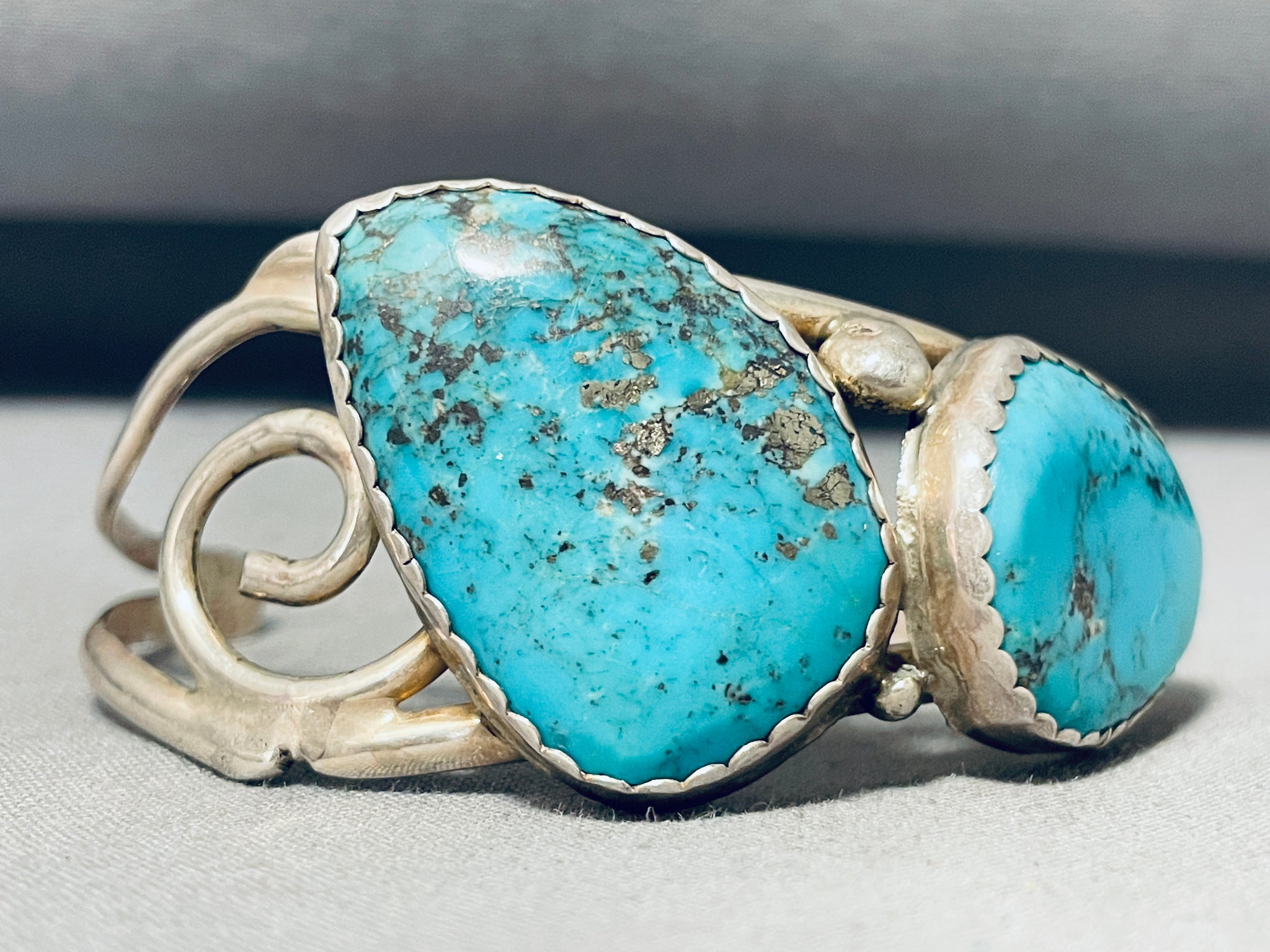 This is an astonishing vintage Navajo silver bracelet. This bracelet is a real show-stopper! These two huge Pilot Mountain turquoise stones are absolutely gorgeous! They're set upon their unique open-swirl rails! Pilot Mountain Turquoise is a variety of turquoise mined from the Pilot Mountain Mine located in Nevada, USA. Pilot Mountain turquoise jewelry is cherished not only for its beauty but also for its connection to Native American culture and traditions. Pilot Mountain turquoise, with its vibrant blue and green hues and intricate matrix patterns, is highly sought after by Native American jewelry artisans. It is known for its unique and often dramatic veining, which adds character and depth to the stone. The largest stone measures around 1-1/4" x 7/8". The width of the bracelet measures around 1-1/4". Sterling silver, marked. The inside end to end measures around 4-5/8" with an additional 1-3/4" gap. Sturdy 26 grams.