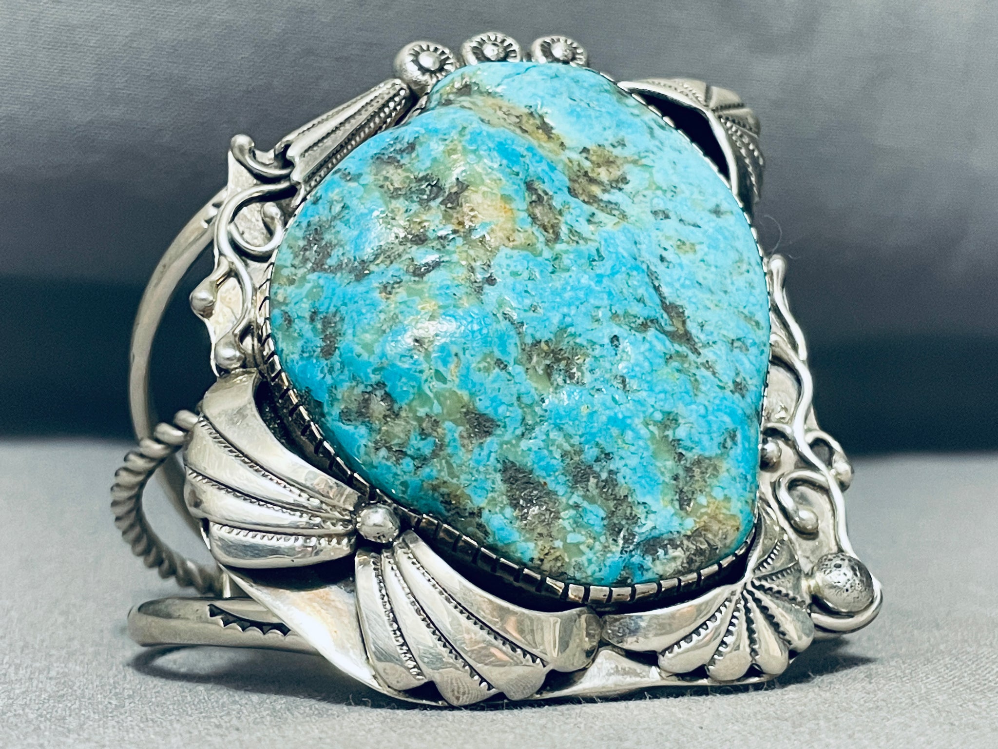 This is a magnificent Navajo large single stone silver bracelet. This remarkable bracelet contains a large chunky Pilot Mountain turquoise stone, one of the largest we have collected in a while. Surrounding the stone are impeccable silver works that consist of fan patterns, shells, swirling stems and raindrops. The bezel around the stone is beautifully channeled. I just love the intricacy and detailing of the silver works around the large stone. This bracelet contains a sturdy and thick triple silver shank cuff with the center shank being coiled from one end to the other. Running down the outer shanks are beautiful sun stampings. The center stone measures around 2-1/4" x 1-3/4". The width of the bracelet measures around 2-1/2". Signed by Navajo artist, J Draper. Sterling silver, marked. Cir. 1970's+. The inside end to end measures around 5-1/4" with an additional 1-1/2" gap. Sturdy 79 grams.