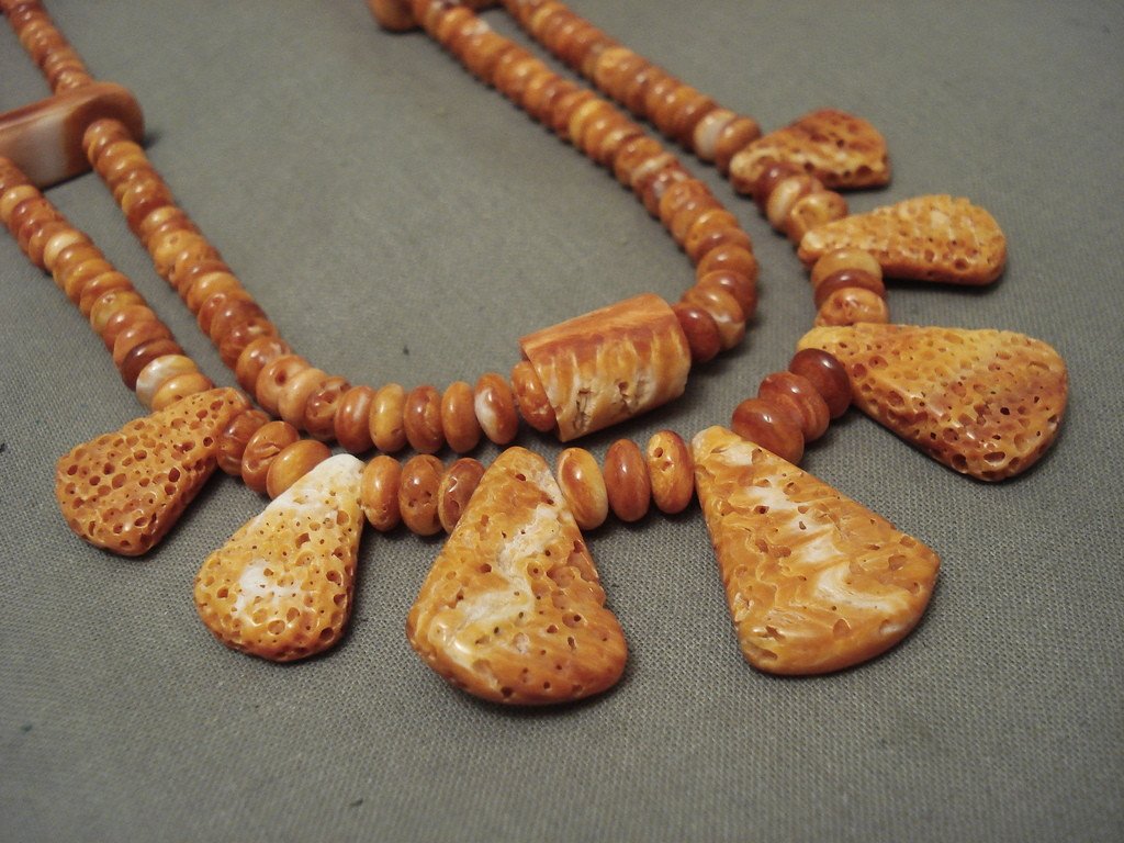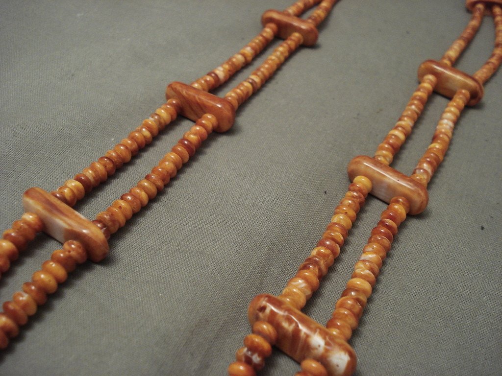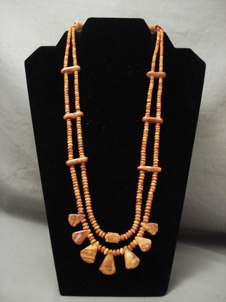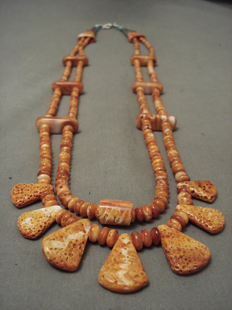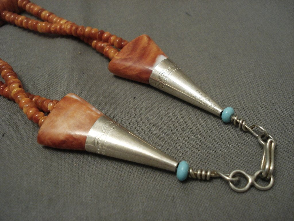This is an incredible vintage Santo Domingo/ Navajo Native American jewelry Native American jewelry spiny oyster necklace. This superior necklace contains two strands of fabulous orange spiny oyster shells that consist of multiple shapes and sizes. The shapes include graduating teardrop, rectangular, triangular and dome shapes. The largest teardrop spiny oyster shell measures around 1" X 3/4". Resting on the ends of the necklace are phenomenal silver cones with accenting turquoise stones and a traditional silver clasp. Sterling silver. Possibly handmade by the Adakai family . The length of the necklace measures around 27". Sturdy 74 grams. LAYAWAYS- We are happy to work with you and are more flexible than anyone on the net. Simply send us an email for more information.
