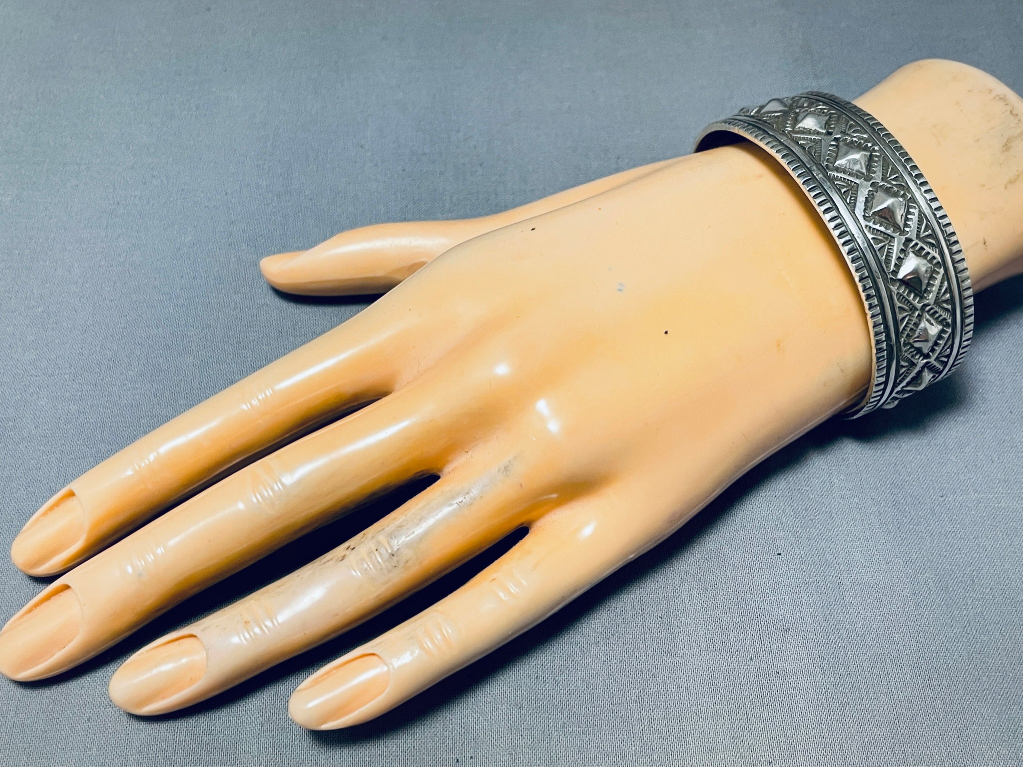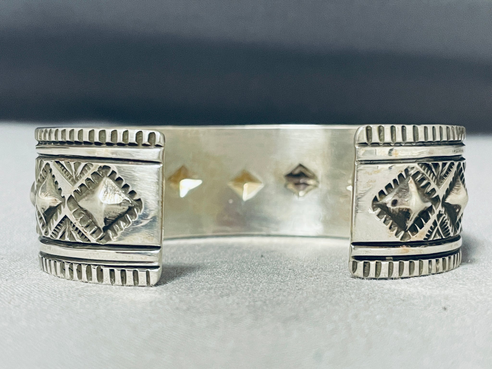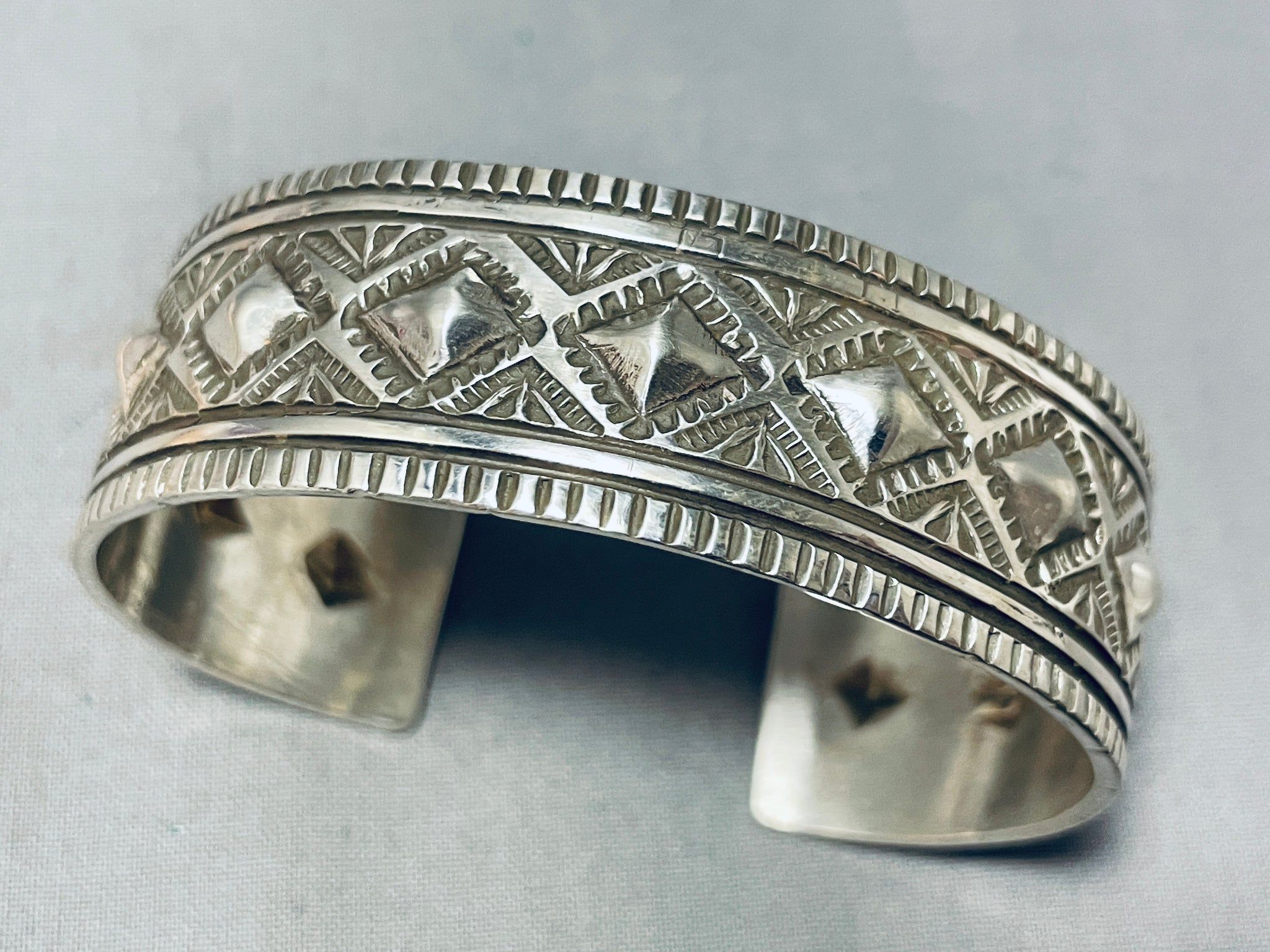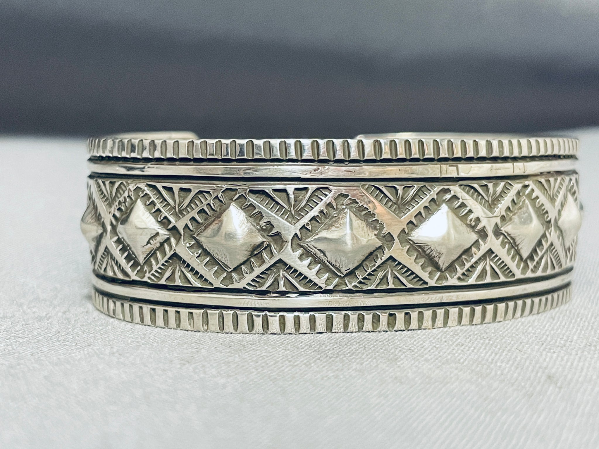 This is a fascinating Choctaw silver bracelet. The center repousse spine of diamond shapes are beautifully nestled among fabulous handstampings and handcarvings from end to end! The width of the bracelet measures around 13/16". Choctaw artist S. Willis. Sterling silver, marked. The inside end to end measures around 5-7/8" with an additional 1" gap. Sturdy 48 grams.