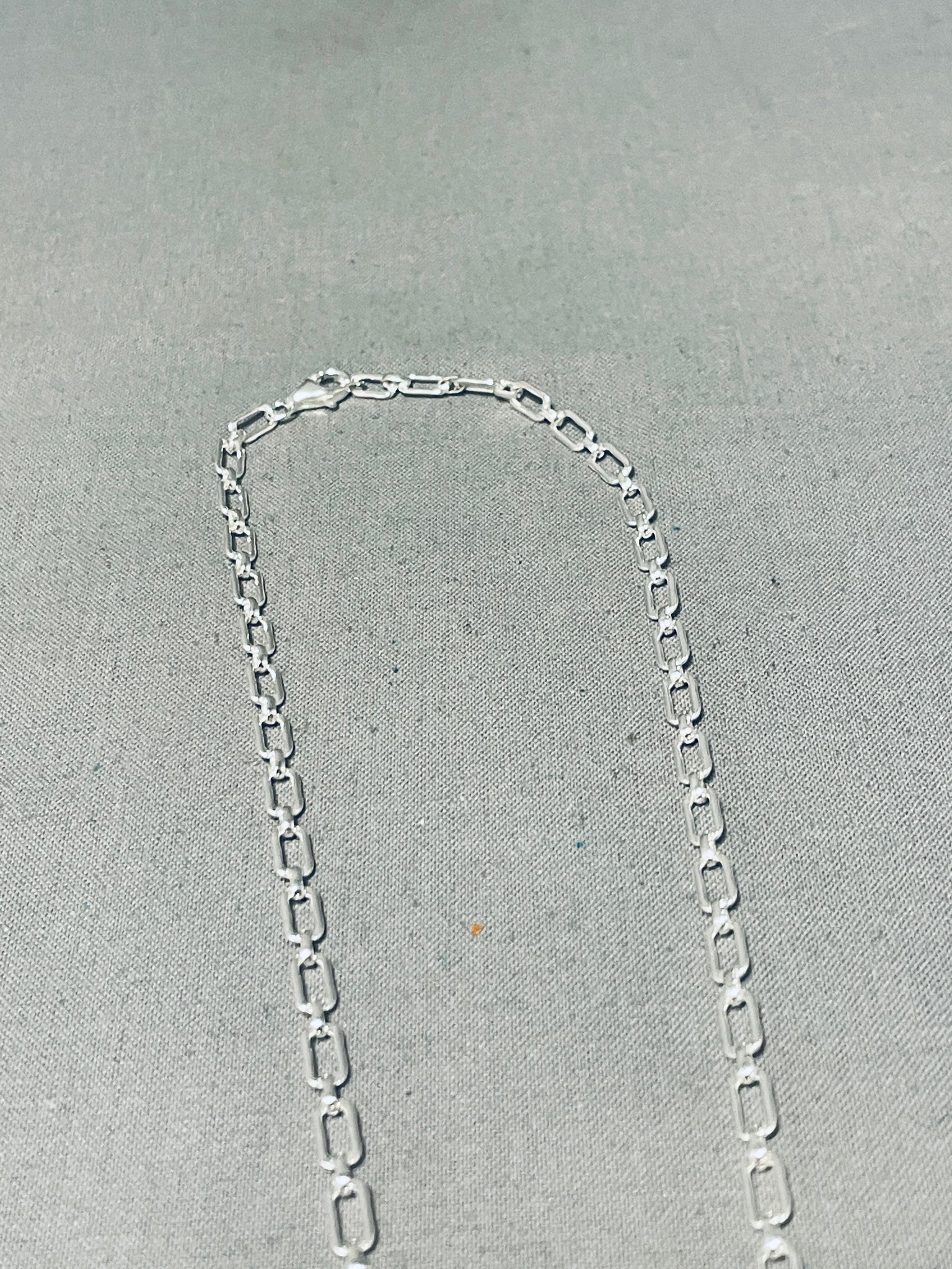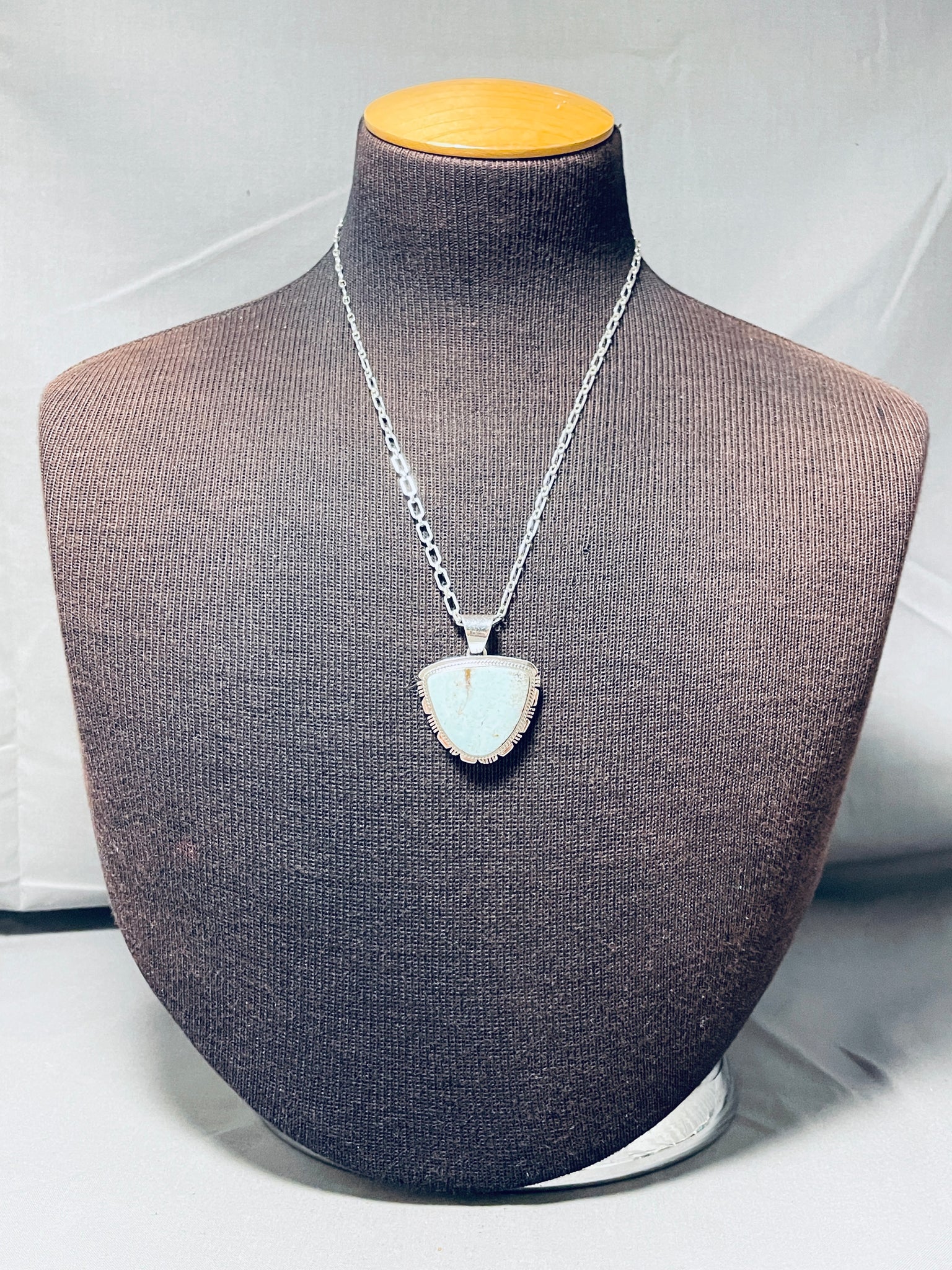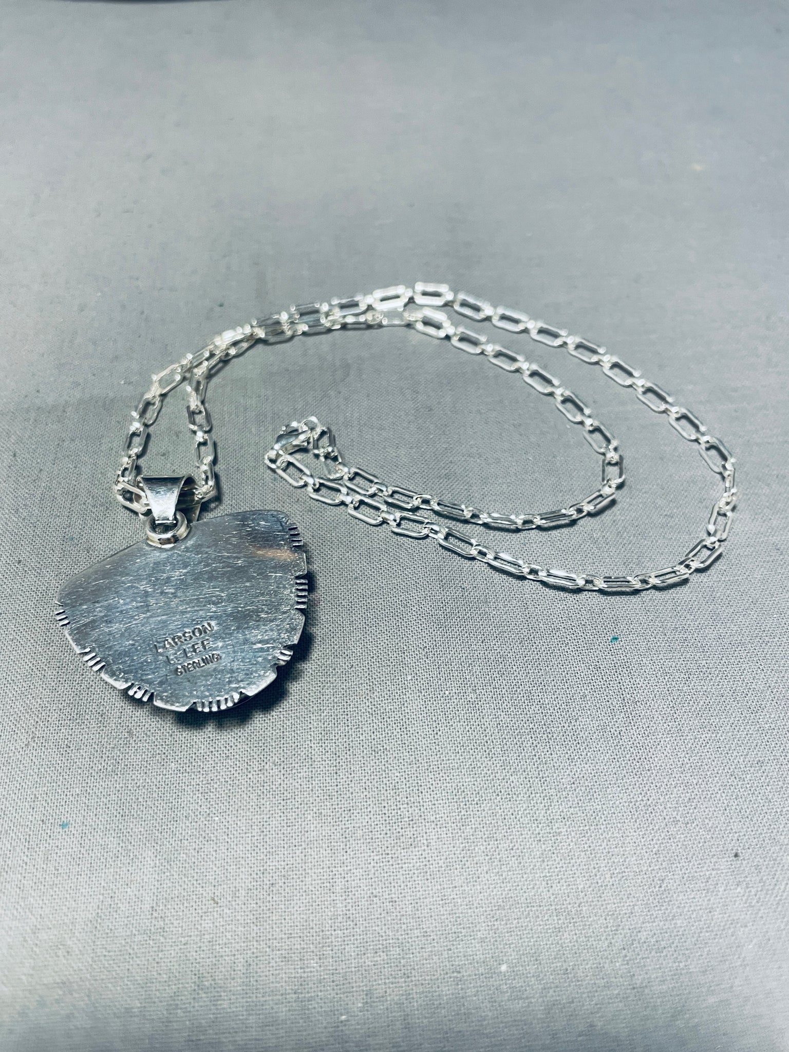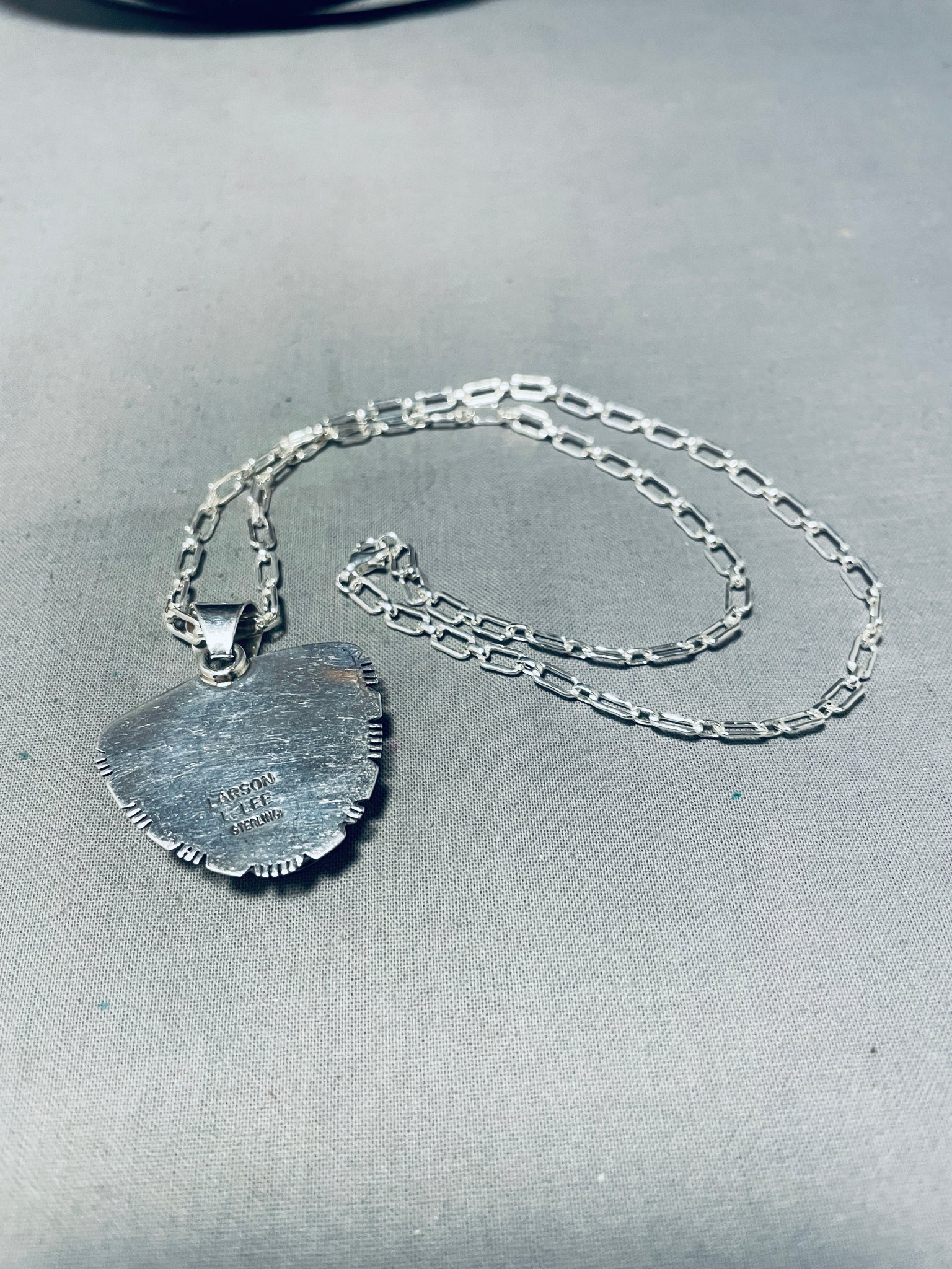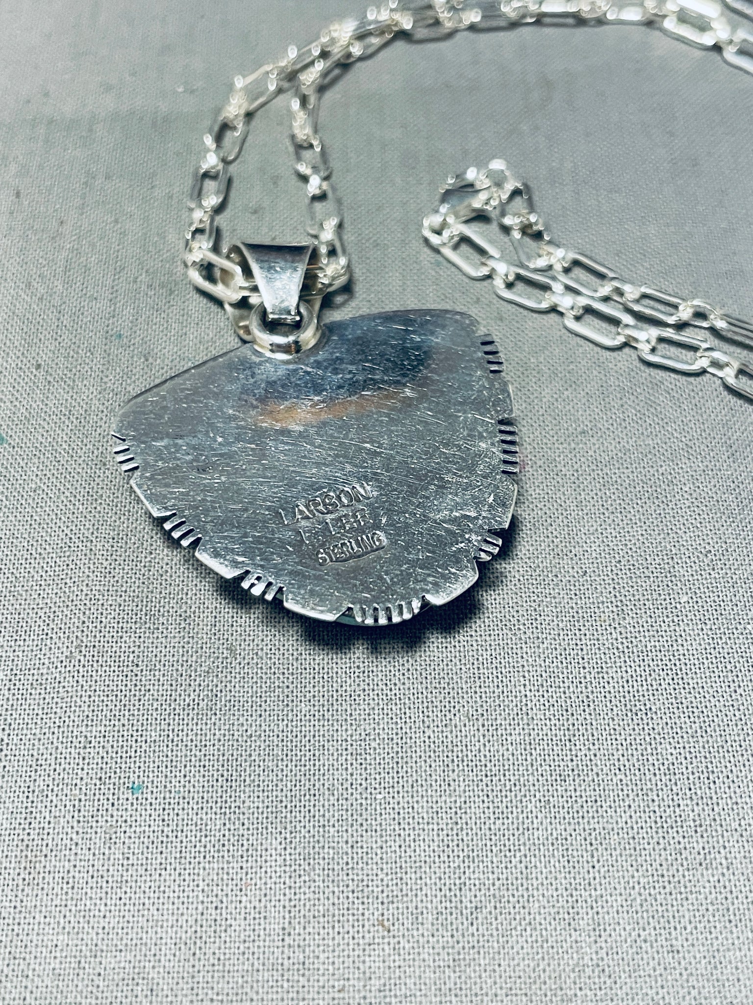 We are proud to offer this stunning Navajo silver necklace. What a noteworthy 1-5/8" x 1-1/4" pendant this large, stunning Dry Creek turquoise stone has become! The artist surrounded it with fine silver rope as it sets upon the pretty handcarved frame! It comes with this fabulous 18" silver chain. Dry Creek Turquoise is a unique and highly sought-after type of turquoise that comes from the Dry Creek Mine in Nevada, USA. Dry Creek Turquoise is known for its light blue to blue-green color, and what sets it apart is the absence of the typical dark matrix or veining found in many other types of turquoise. The lack of matrix gives the turquoise a clear, almost solid appearance, making it unique and highly prized among collectors and jewelry enthusiasts. The Dry Creek Mine is known for its limited production, and the turquoise is considered rare. The mine's production is finite, and as with many turquoise mines, the supply of high-quality material may become more scarce over time. Sterling silver, marked. Signed by Navajo artist, Larson Lee. Sturdy 20 grams.