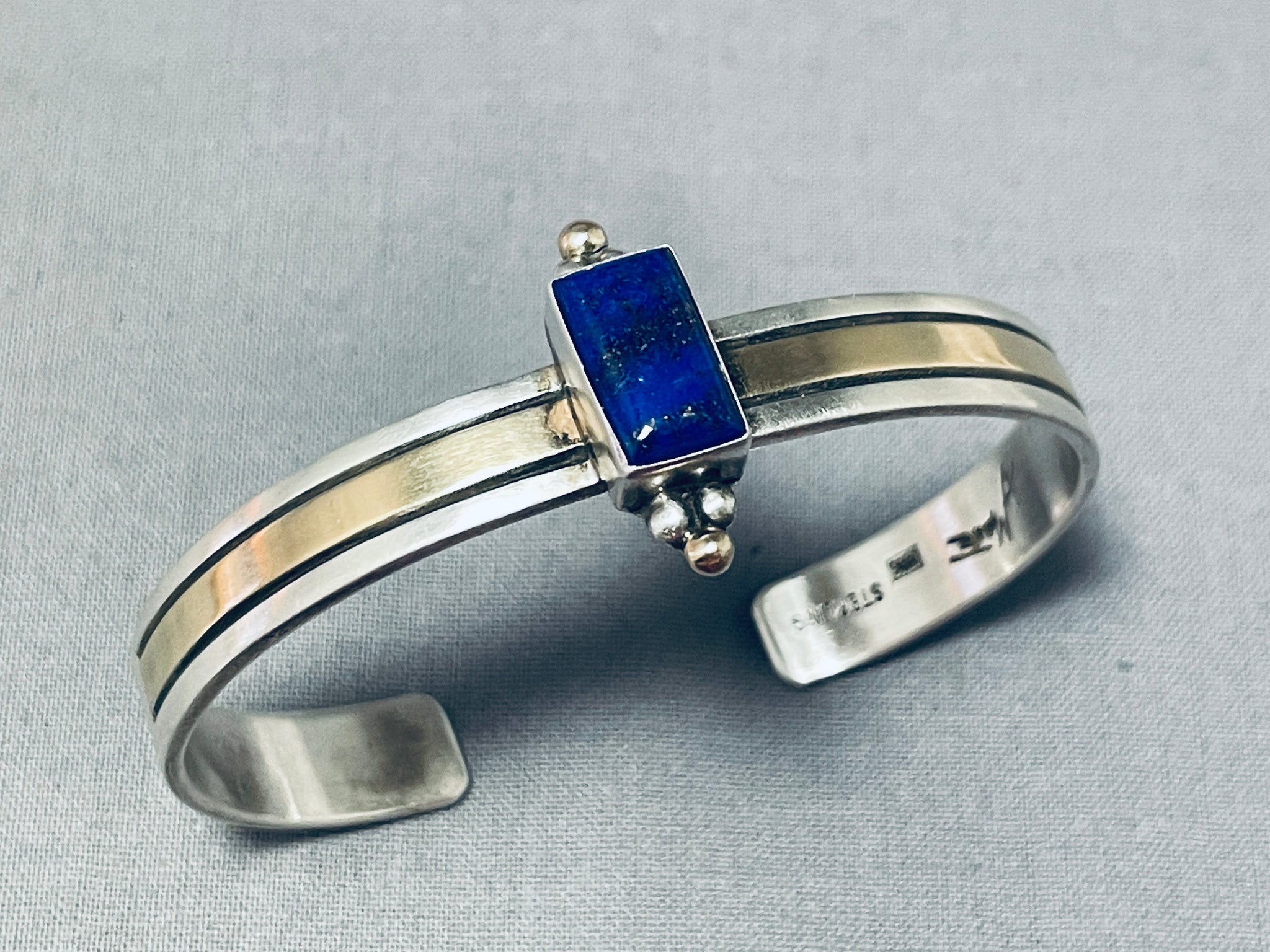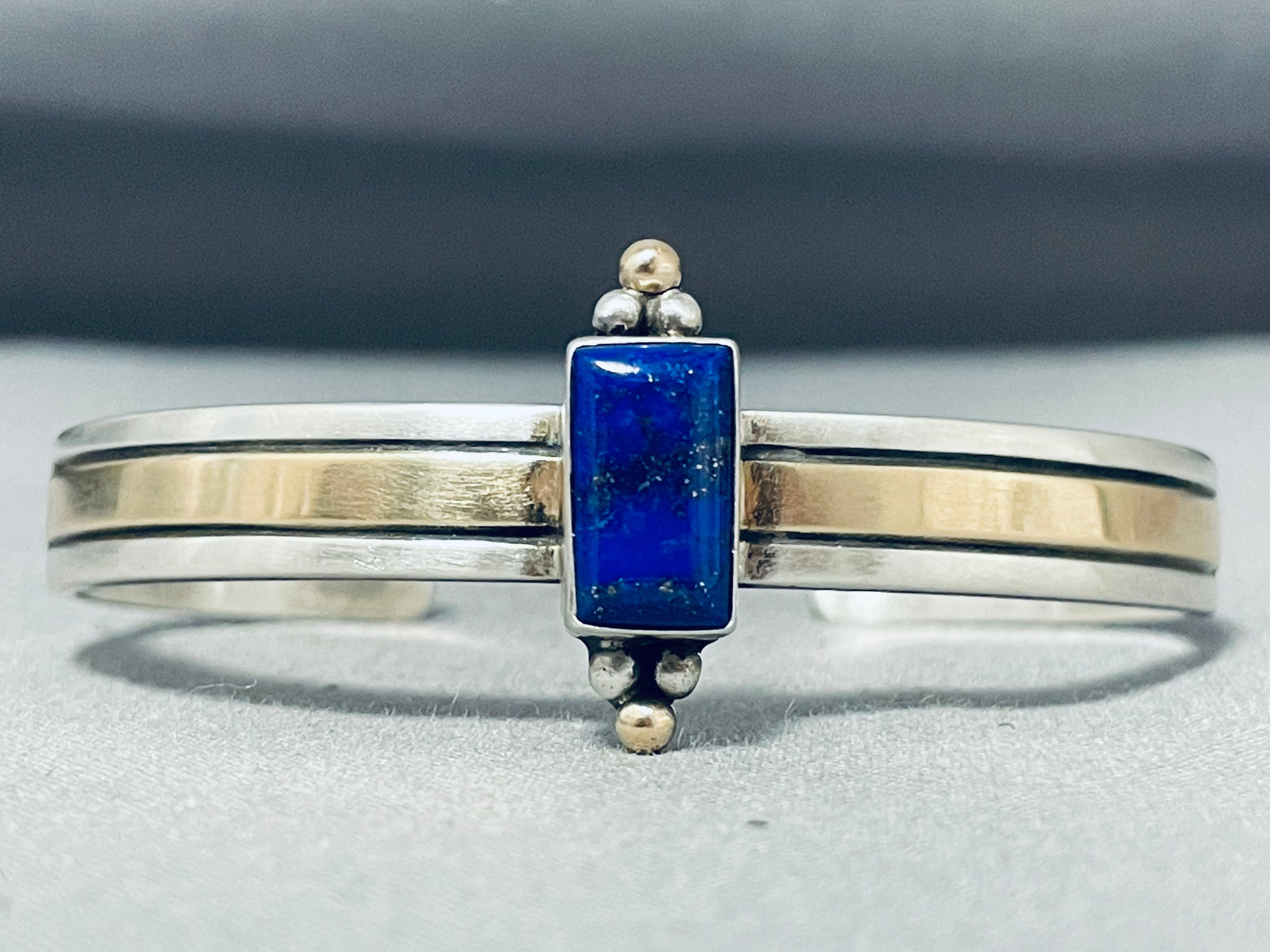We are proud to offer this striking Navajo silver bracelet. From side to side, this remarkable bracelet has a 14k gold spine - just perfect for the gorgeous lapis stone that sets vertically, with its triple silver beads at the top and bottom! The center stone measures around 1/2" x 1/4". The width of the bracelet measures around 7/8". Signed by Navajo artist, Alvin Monte. Sterling silver and 14K gold. The inside end to end measures around 5-1/2" with an additional 7/8" gap. Sturdy 24 grams.