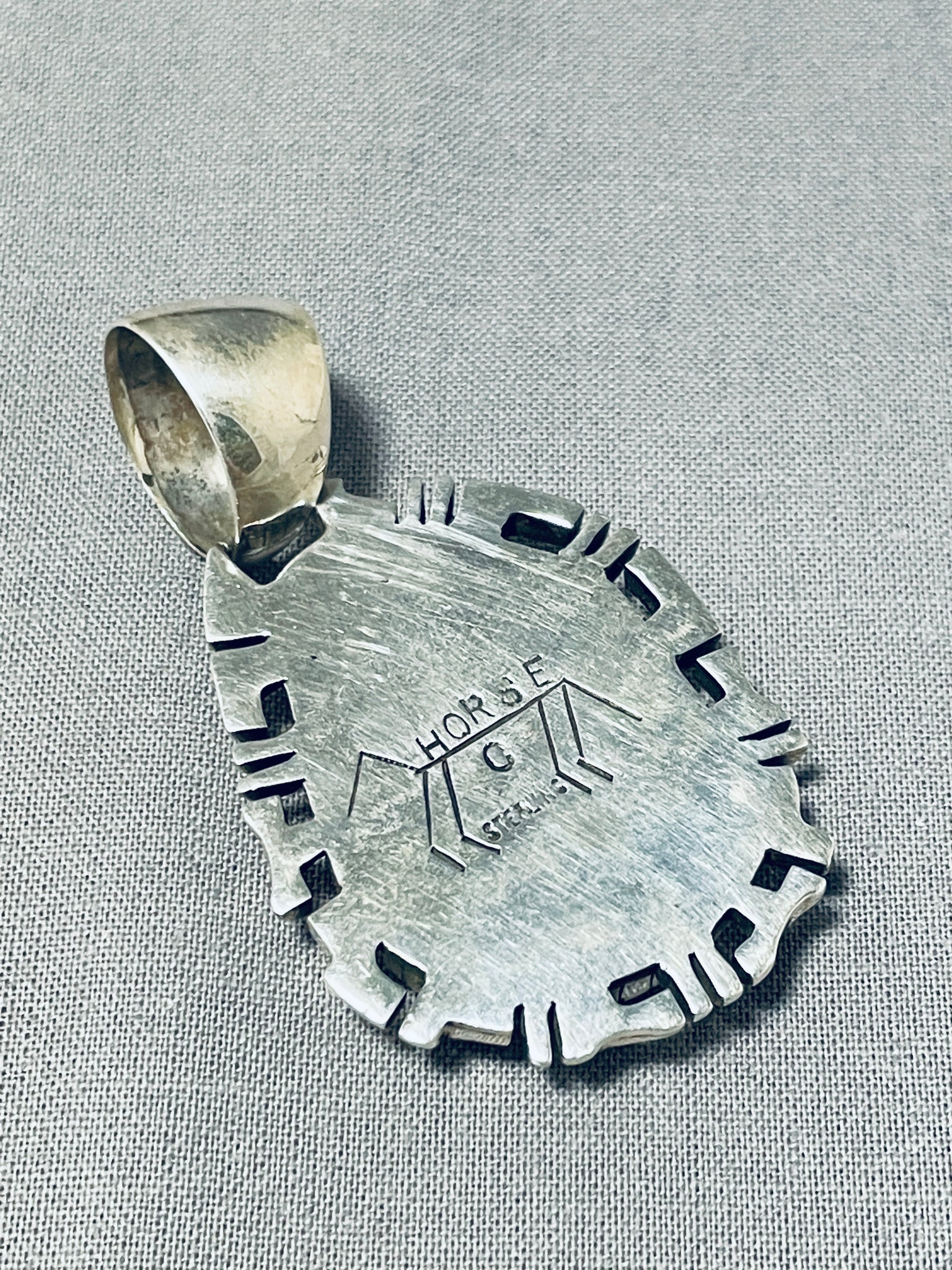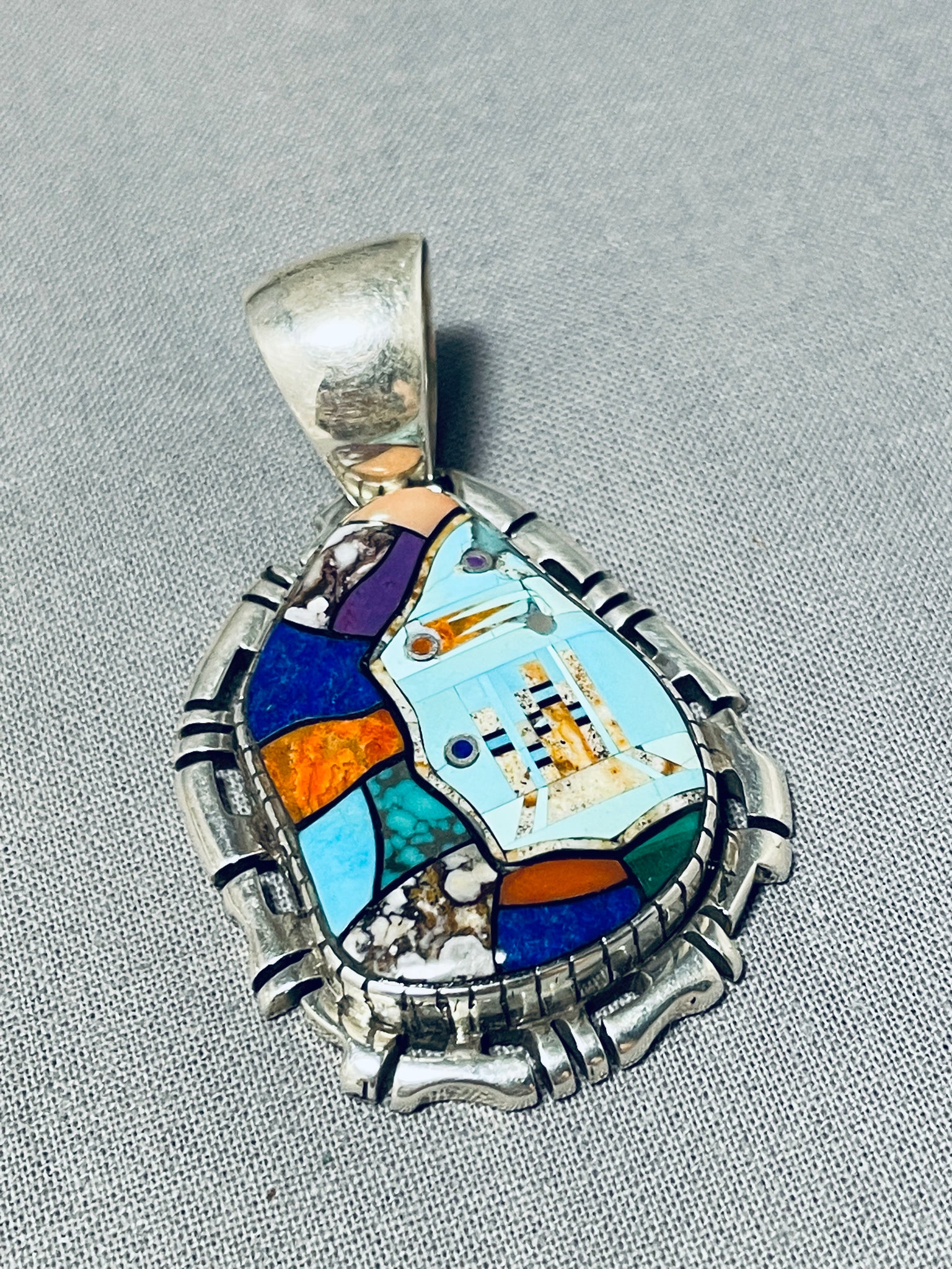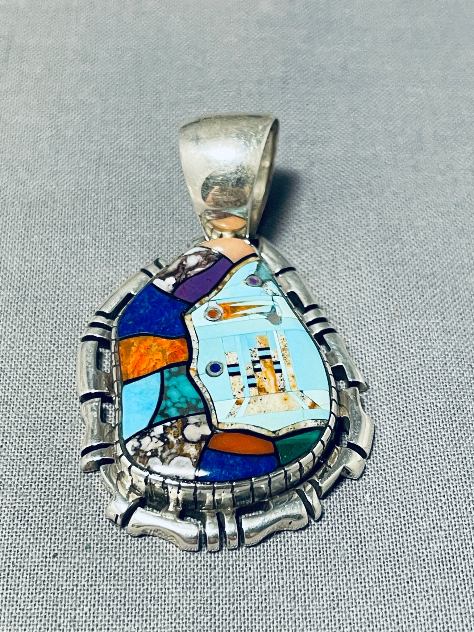 Up for sale is this striking Navajo silver pendant. Look closely to notice and appreciate the inlay work of not only the fabulous pueblo design, but all the different colorful stones that flank the left side! It has a large bail with a generous 7/16" opening to easily accommodate a necklace you may already have! Gorgeous! Sterling silver. Signed by Navajo artist, C.Horse. The pendant measures around 2-1/8" x 1-1/4". Sturdy 16 grams.