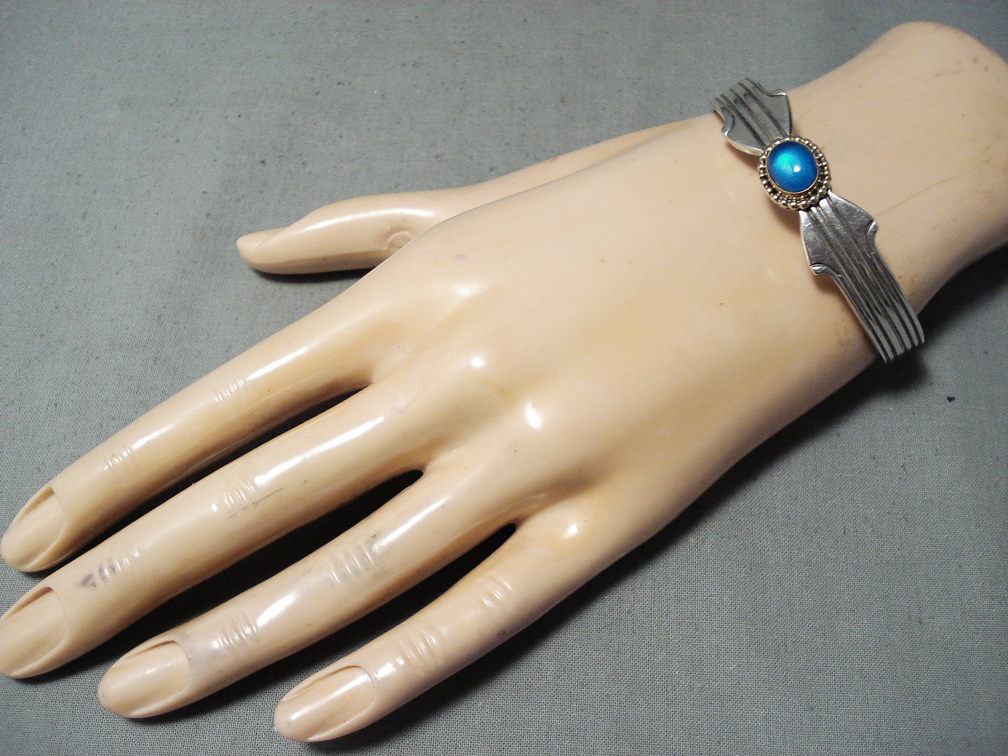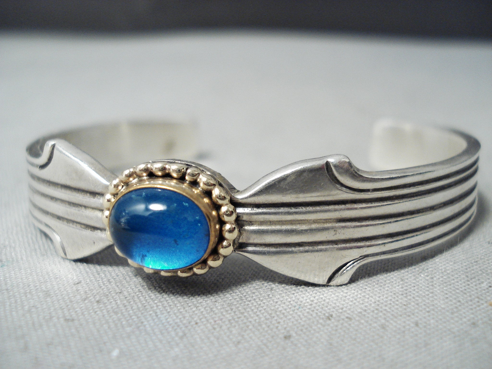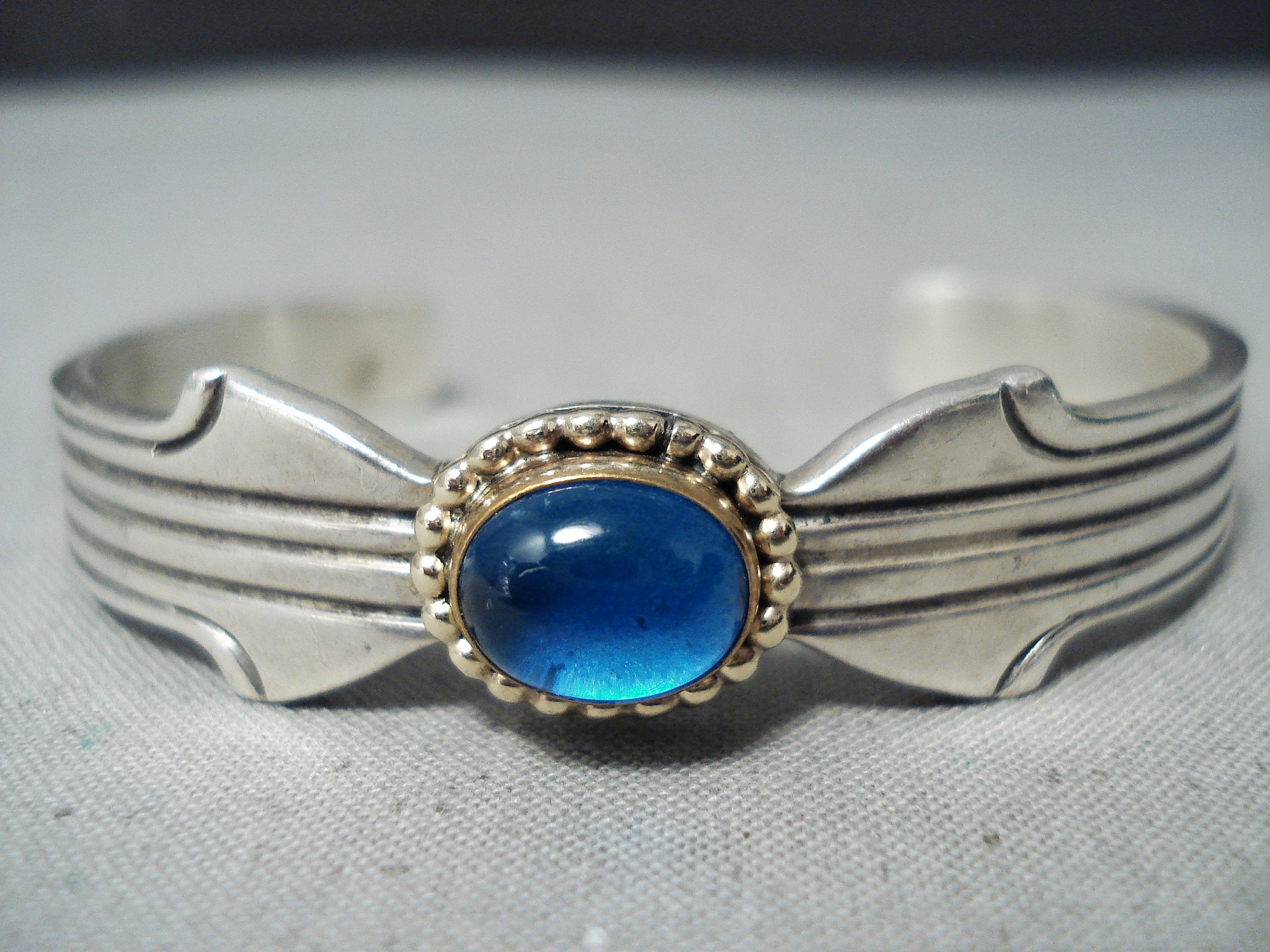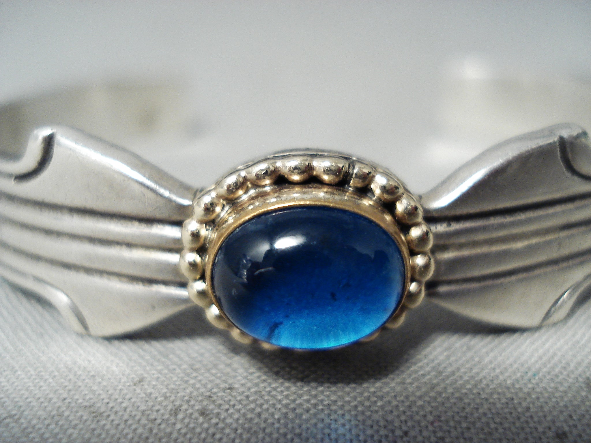 Dynamic Vintage Native American Navajo Blue Topaz Sterling Silver & 14k Gold Bracelet Old