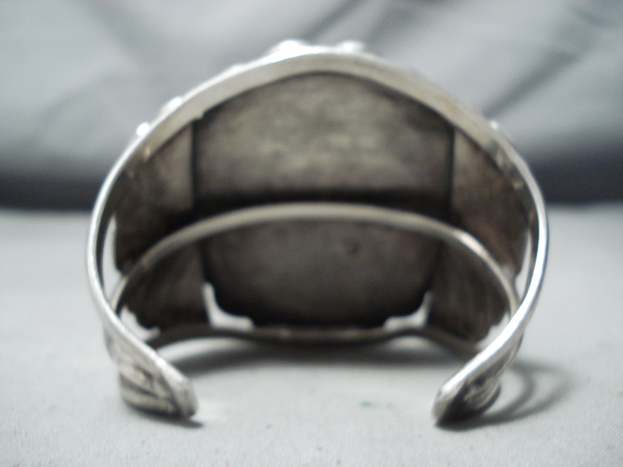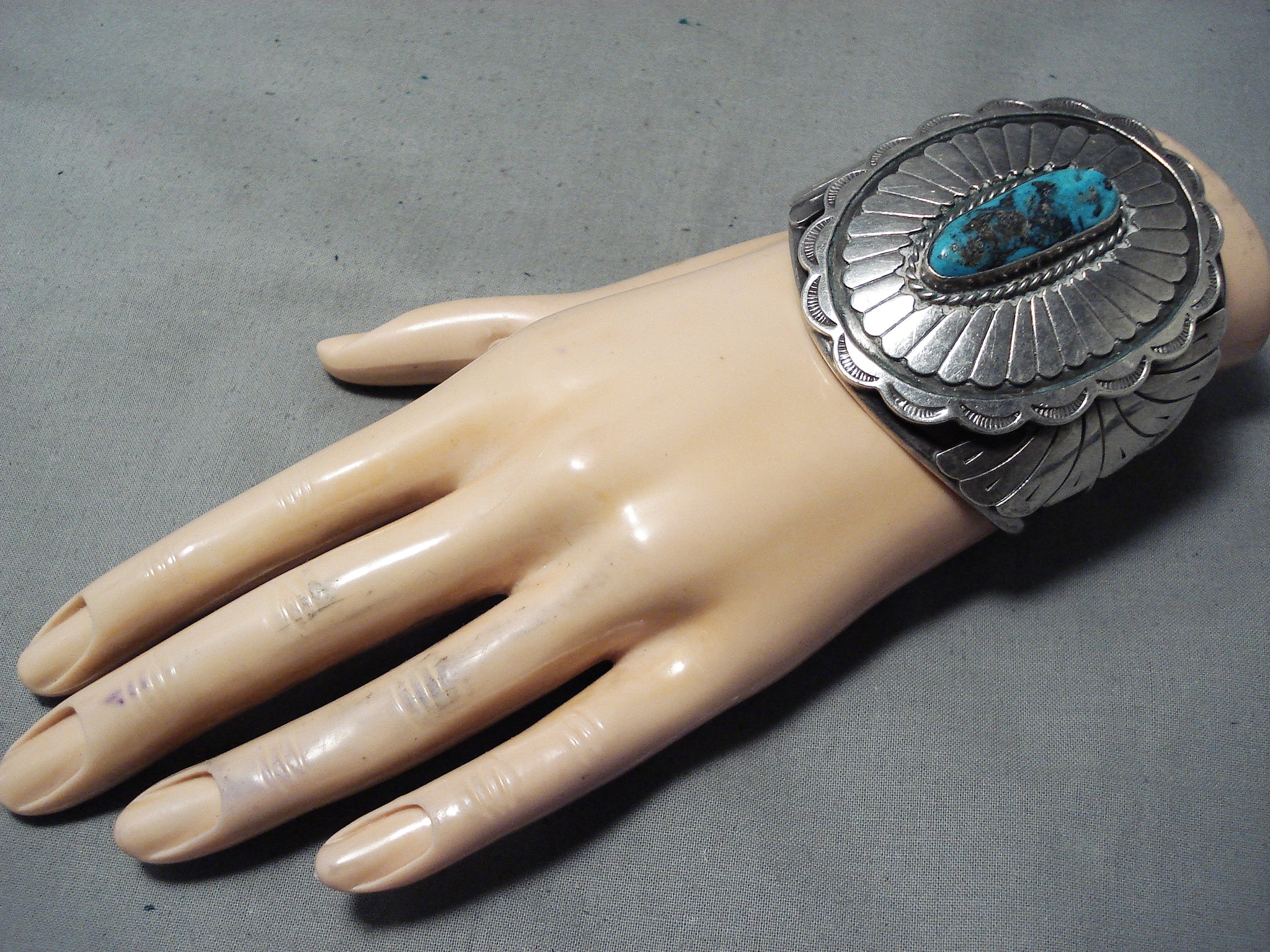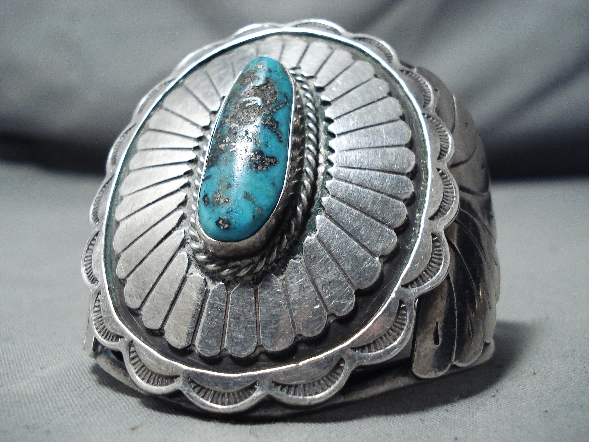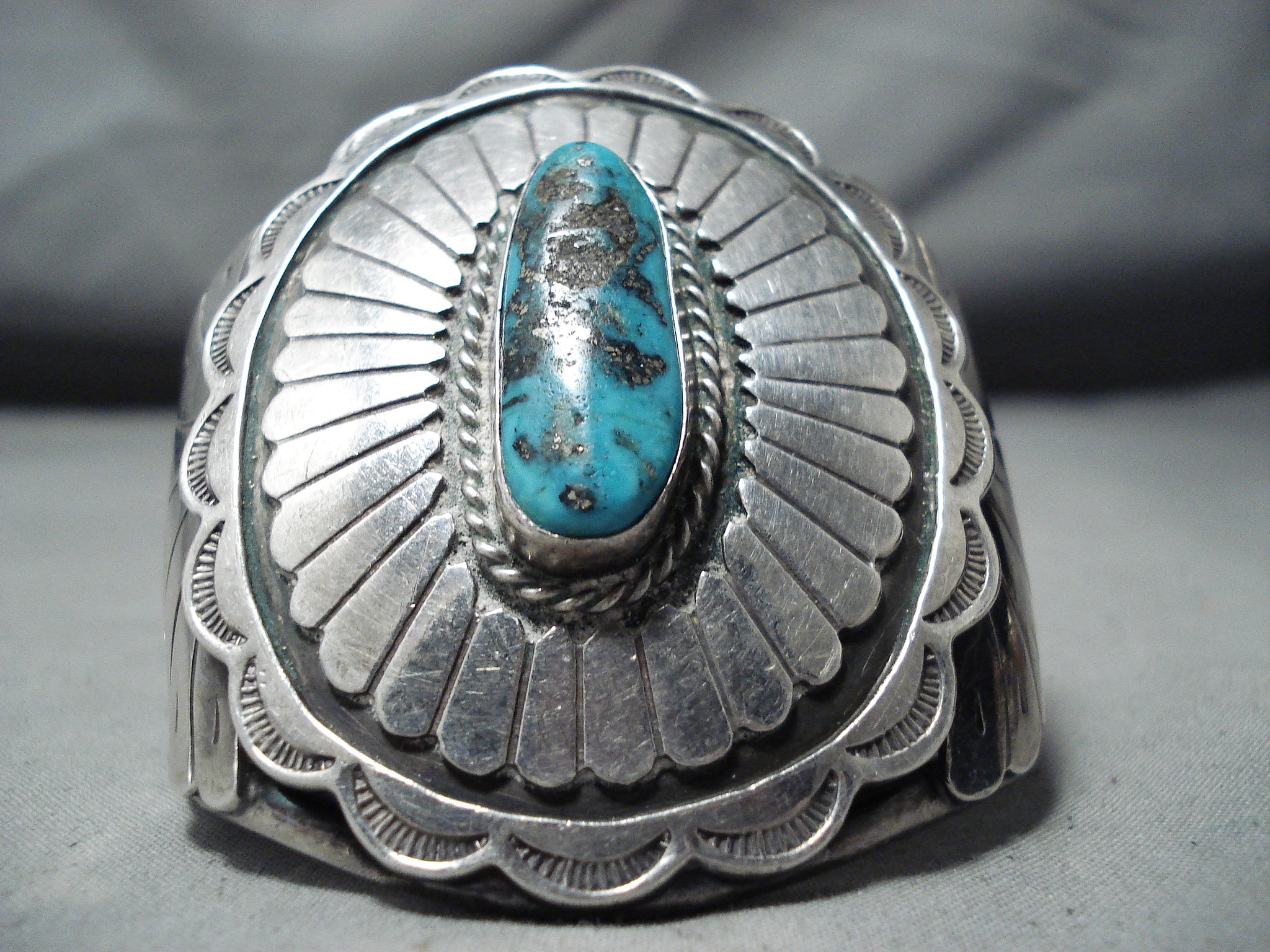 Dynamic Vintage Native American Navajo Pilot Mountain Turquoise Sterling Silver Bracelet Old