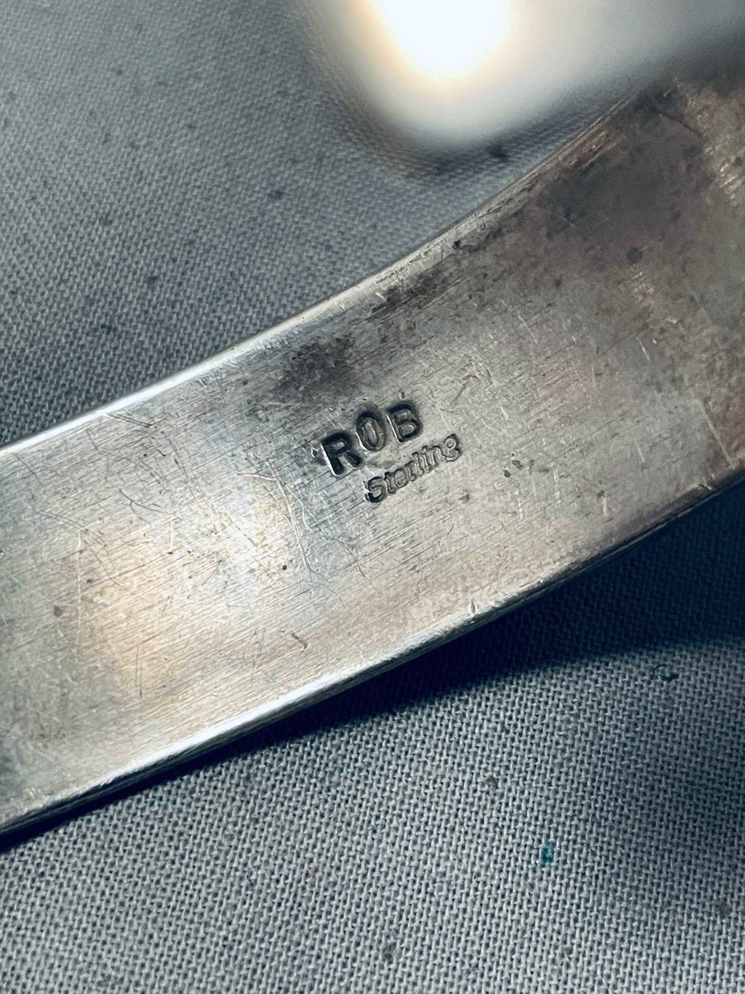 This is a tremendous vintage Navajo silver bracelet. This large oval Sleeping Beauty turquoise stone sets horizontally at the center of the bracelet - as fine, vertically ridges intensely decorate the sides of the piece - very cool! The center stone measures around 7/8" x 5/8". The width of the bracelet measures around 3/4". Signed by Navajo artist, ROB. Sterling silver, marked. The inside end to end measures around 6-3/8" with an additional 1-1/4" gap. Sturdy 46 grams.