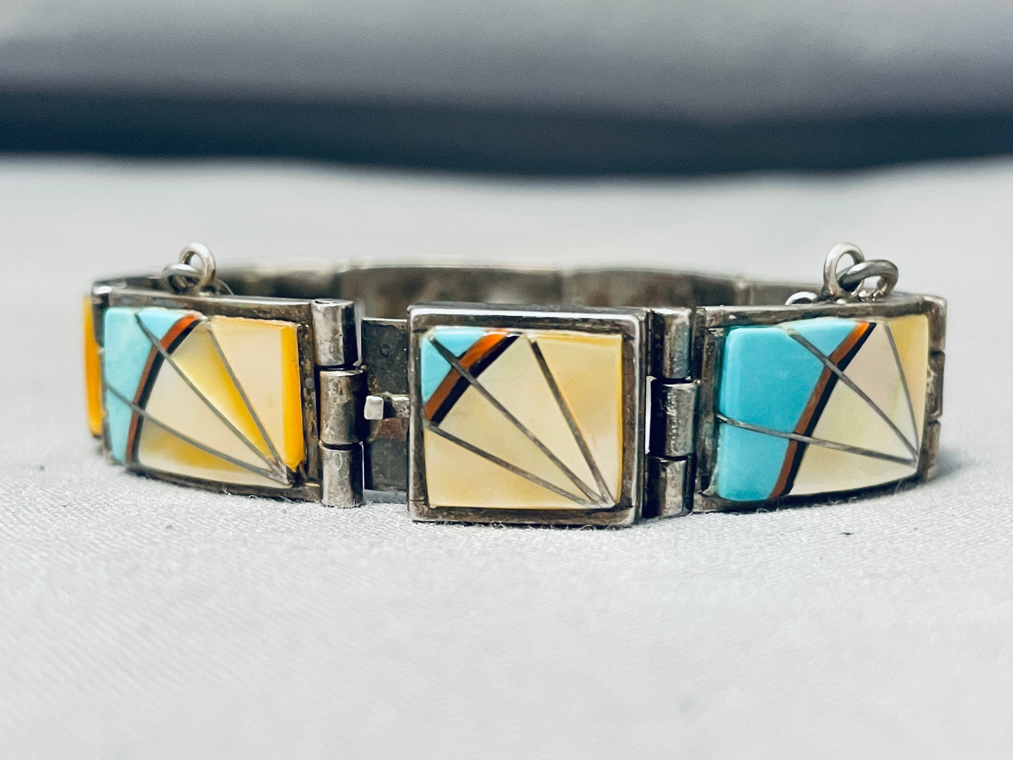 An exquisite vintage Zuni silver bracelet. Like emanating rays of the sun upon the earth, the inlay designs of Blue Gem turquoise, coral and mother of pearl all come to life on each of the seven ?" x ½" linked stations of the bracelet! It has a ½" x ½" matching push-button slide station and a nice security chain! It measures about 6-7/8" around. Pics don't do it justice! The center stone measures around 7/8" x 1/2". The width of the bracelet measures around 1/2". Signed by Zuni artist, A. Acoya. Sterling silver, marked. Sturdy 28 grams. Cir Mid Century +