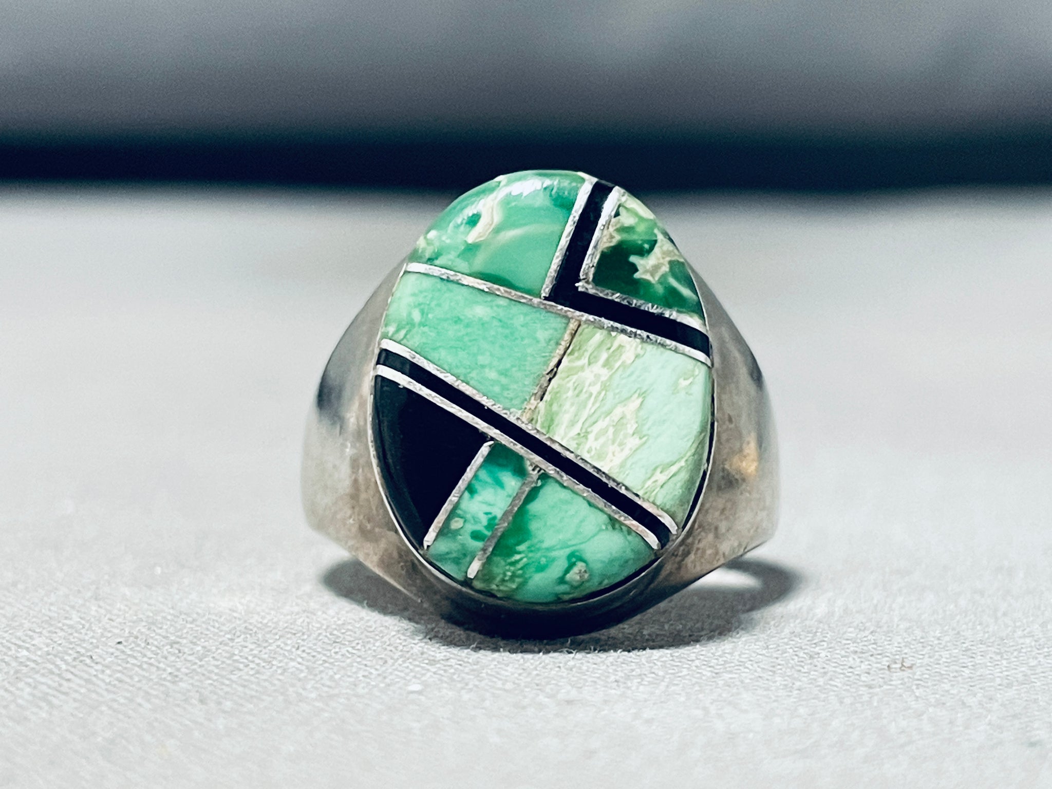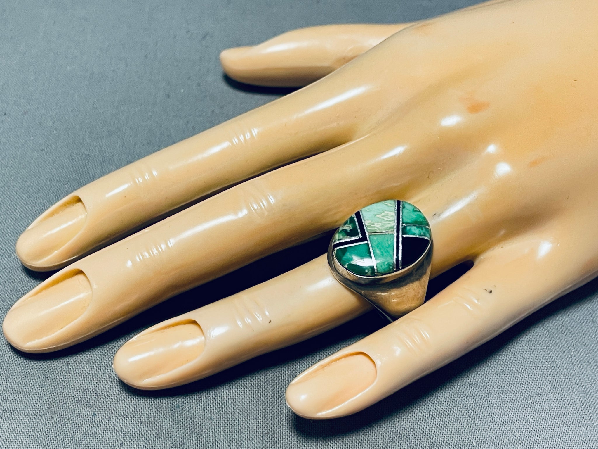 Dynamic Vintage Native American Zuni Damale Turquoise Jet Sterling Silver Ring