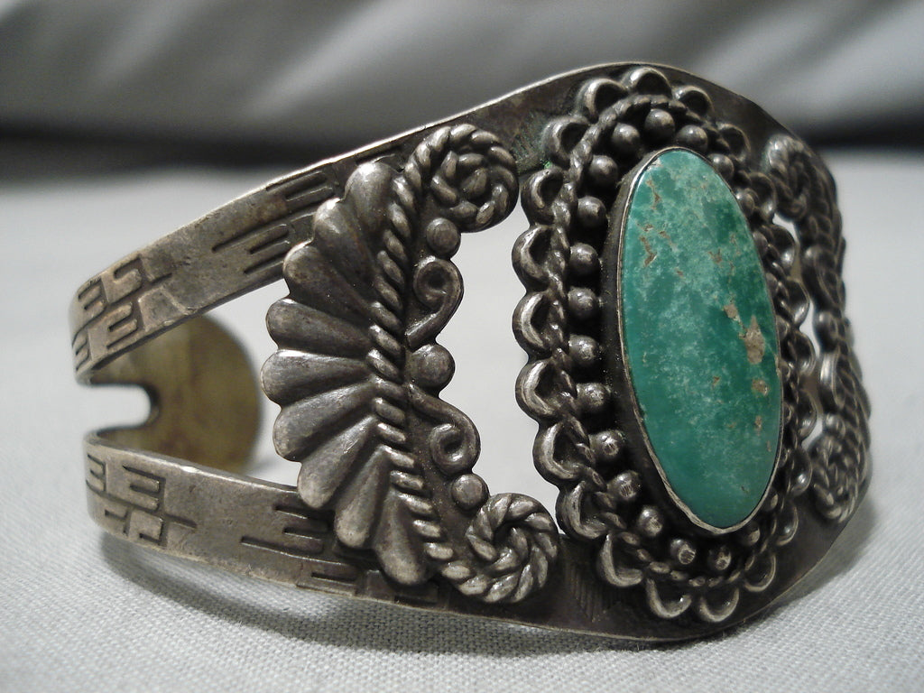 This is a marvelous vintage Navajo earlier 1900's silver bracelet. This piece contains a beautiful center Cerrillos turquoise stone. The surrounding silver works are impeccable and consist of raindrops, waving patterns, ropes and repoussed shells. The center stone measures around 7/8" x 1/2". The width of the bracelet measures around 1-3/8". Sterling silver, marked. Cir. Mid century . The inside end to end measures around 5-1/2" with an additional 1" gap. Sturdy 31 grams.