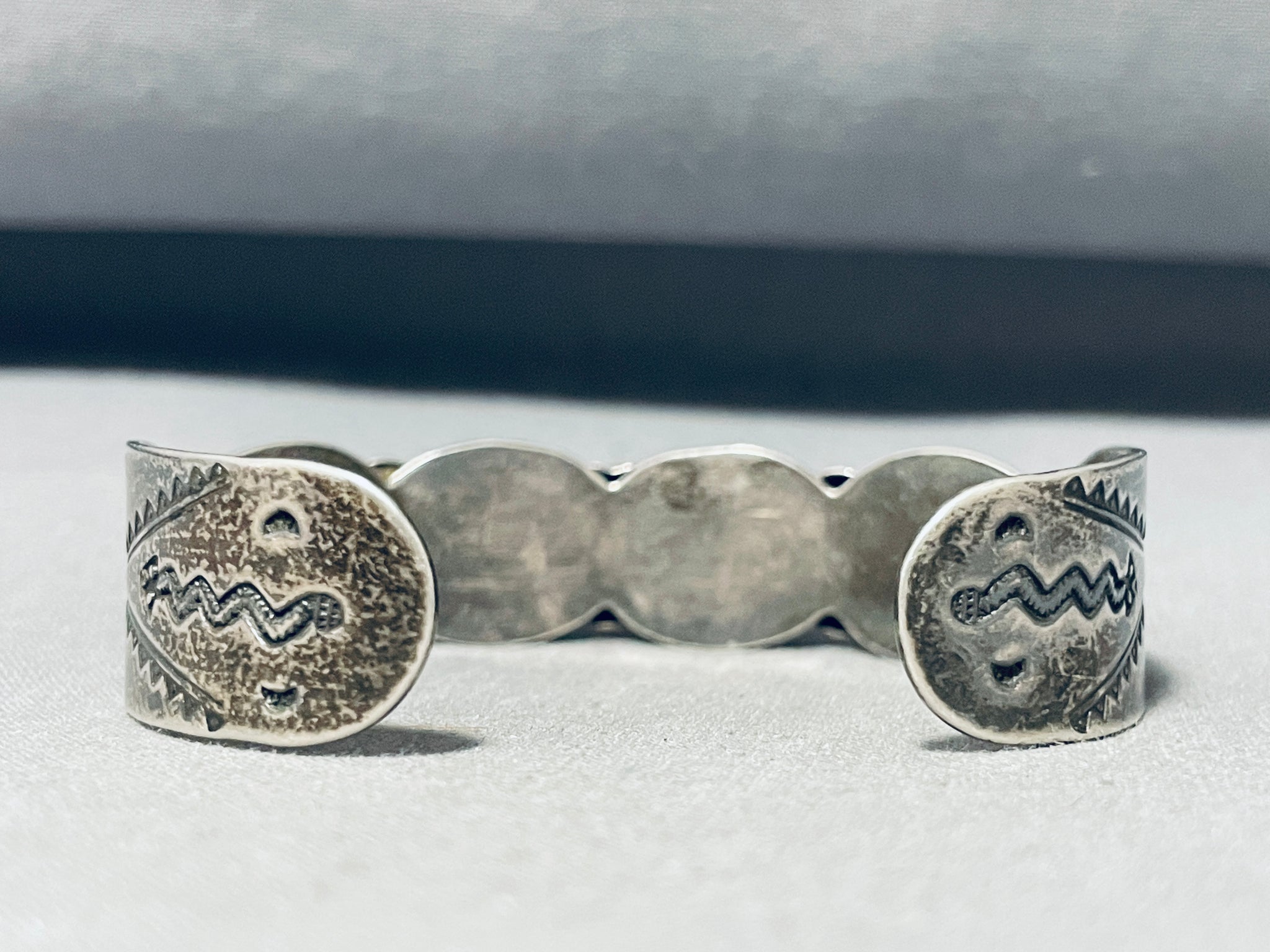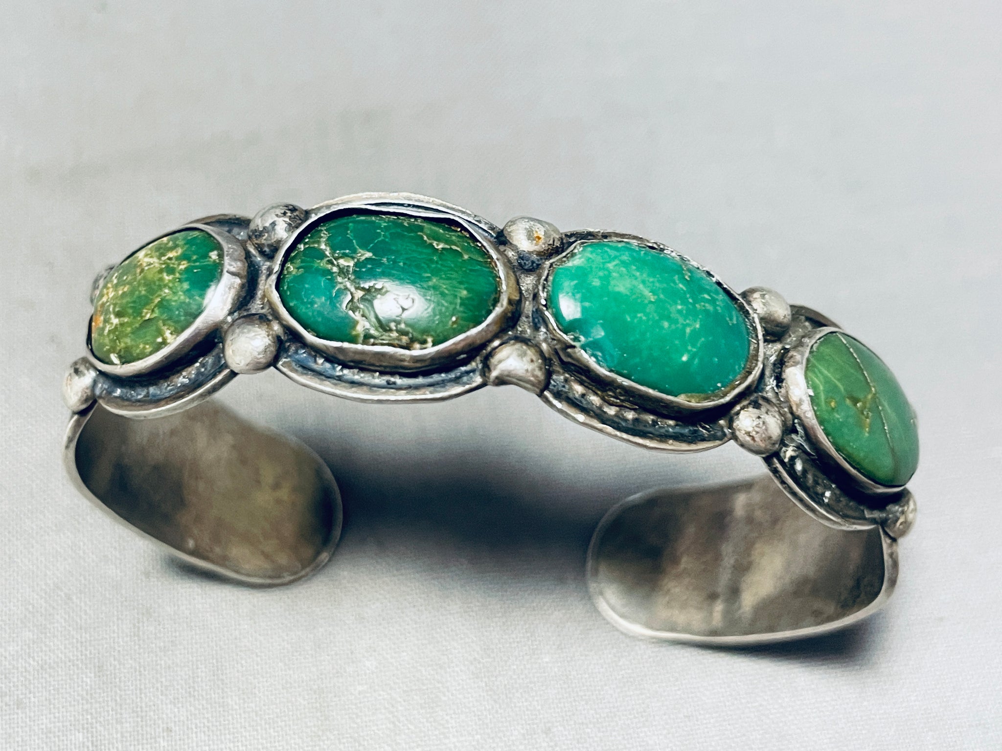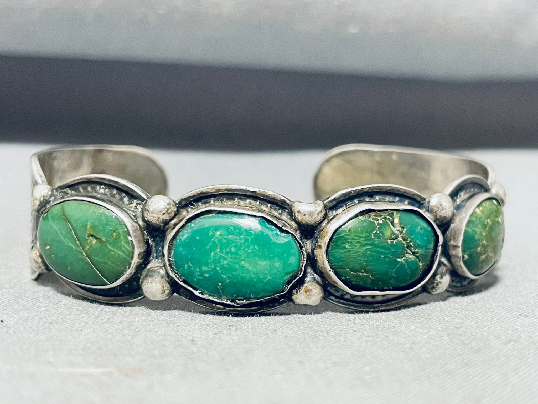 Up for sale is this tremendous vintage Navajo silver bracelet. Wow! Would love to hear the stories this unforgettable piece could tell! Separated with dual silver beads, these four fabulous oval shaped Cerrillos turquoise stones horizontally line up side by side, as the cuff follows the curves of the stones, creating the marvelous scalloped edging! Then impressive handstampings decorate the sides! So Nice! Cerrillos turquoise refers to a specific type of turquoise that comes from the Cerrillos Hills area in New Mexico, USA. It is one of the oldest and most historic turquoise mines in North America, with a rich history dating back over a thousand years. Cerrillos turquoise is known for its distinctive greenish-blue to blue-green color, often with a brown or golden matrix running through the stone. The matrix patterns can vary, ranging from fine spiderweb-like lines to bold and intricate patterns, giving each piece of Cerrillos turquoise its unique character. The stones measure around 5/8" x 3/8". The width of the bracelet measures around 9/16". Sterling silver. The inside end to end measures around 5-5/8" with an additional 7/8" gap. Sturdy 28 grams.