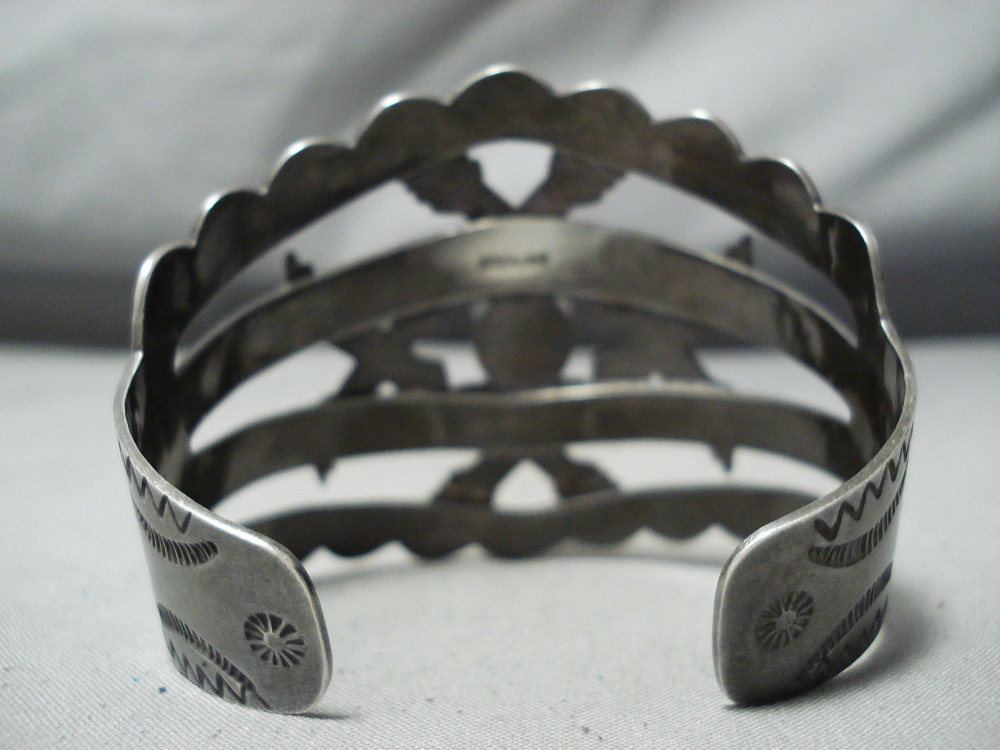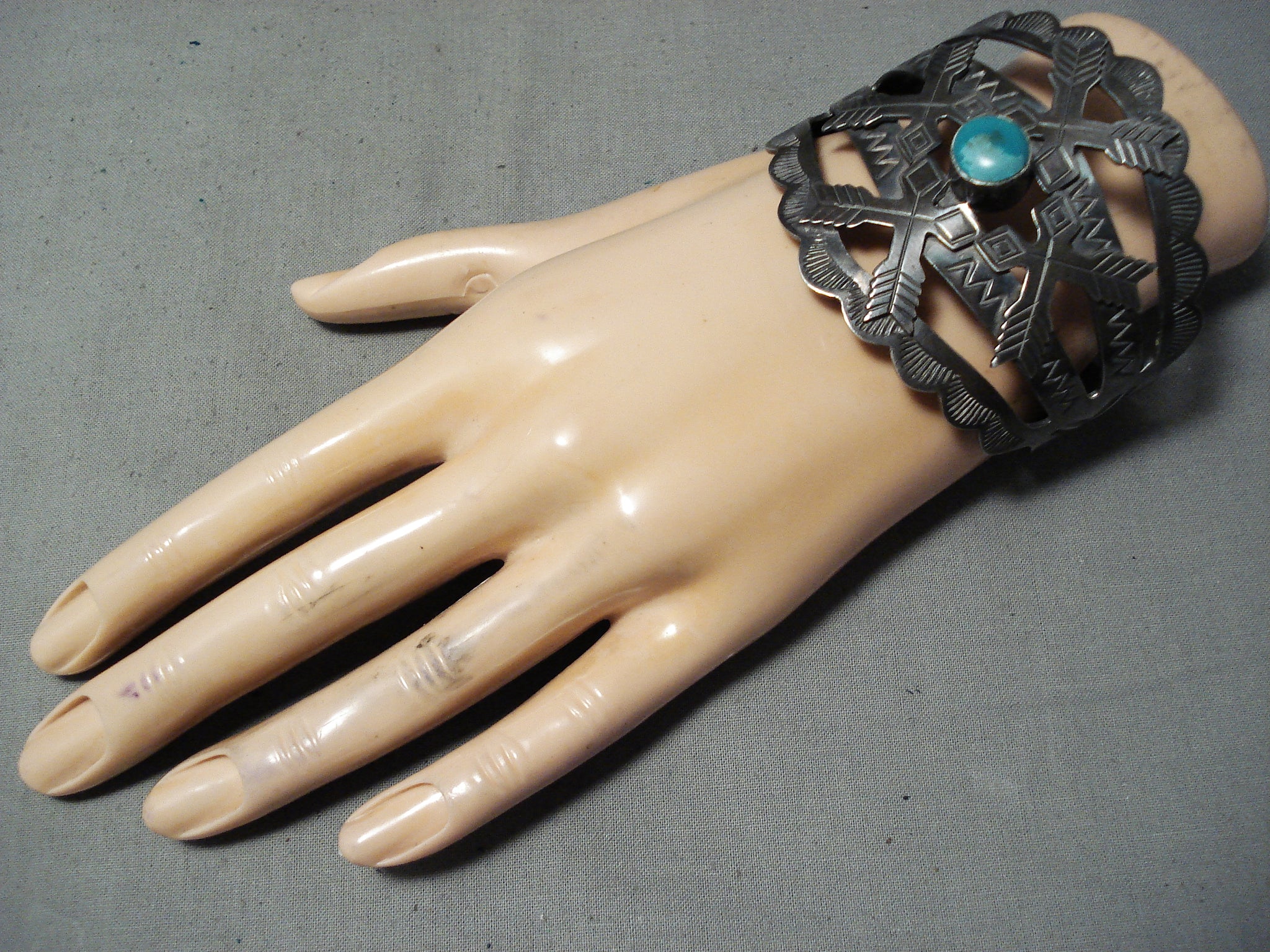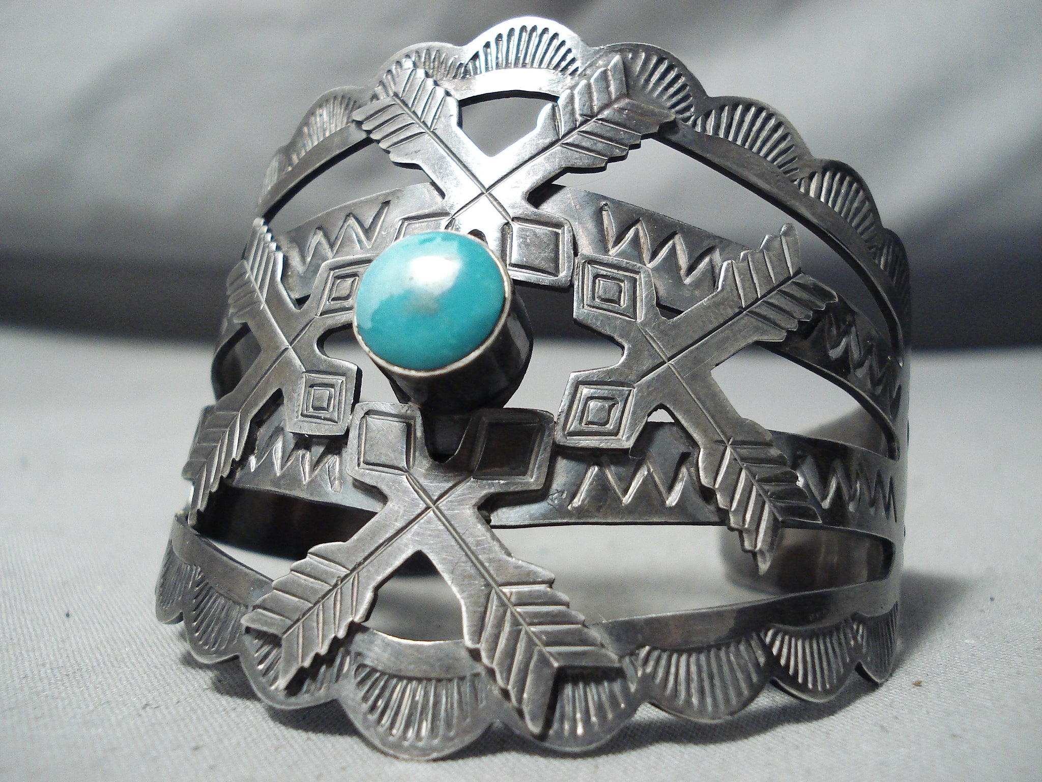 Early 1900's Vintage Native American Navajo Crossed Arrows Turquoise Sterling Silver Bracelet