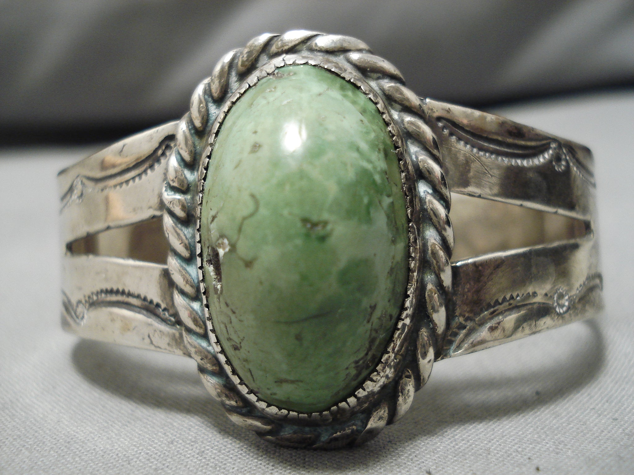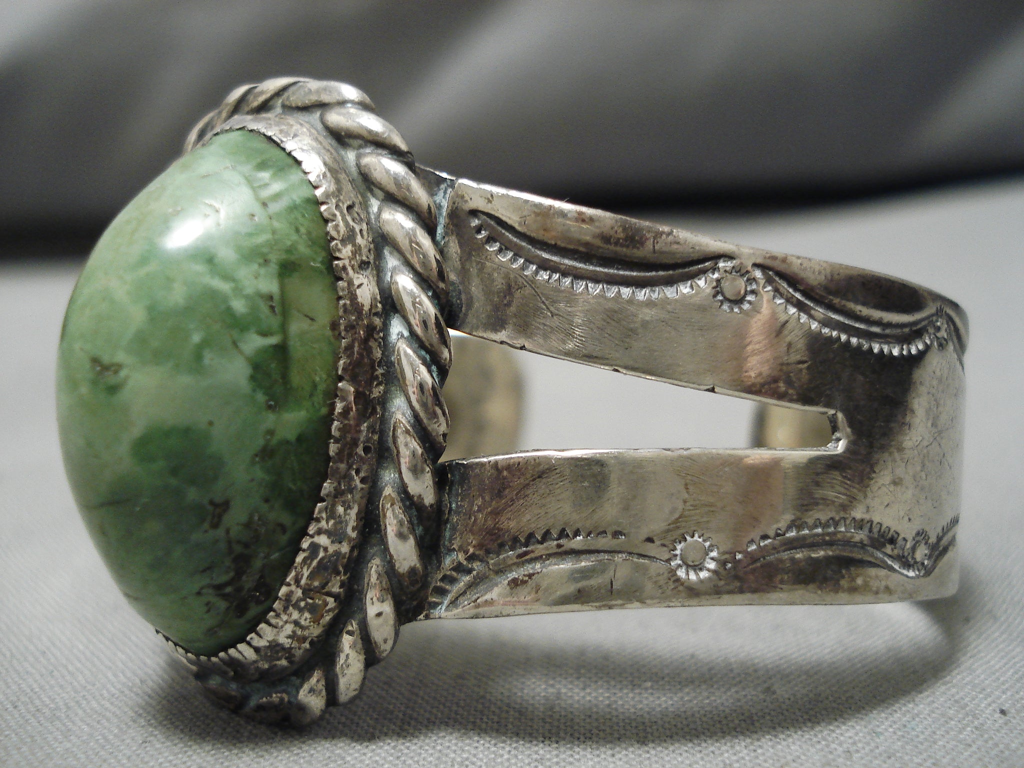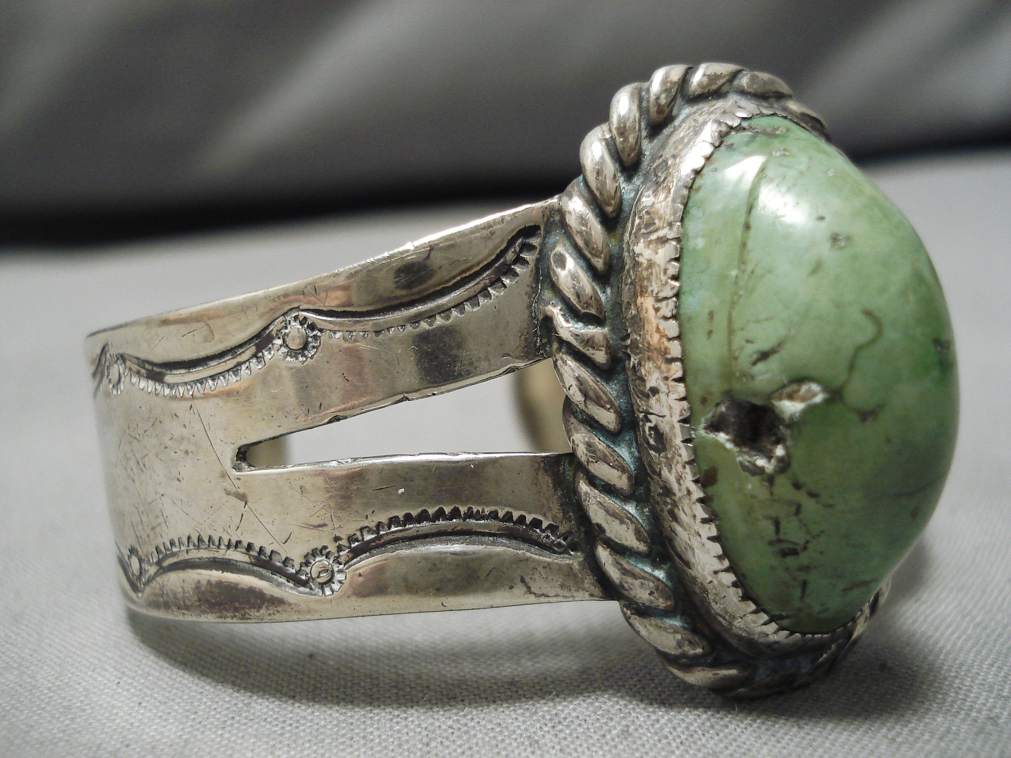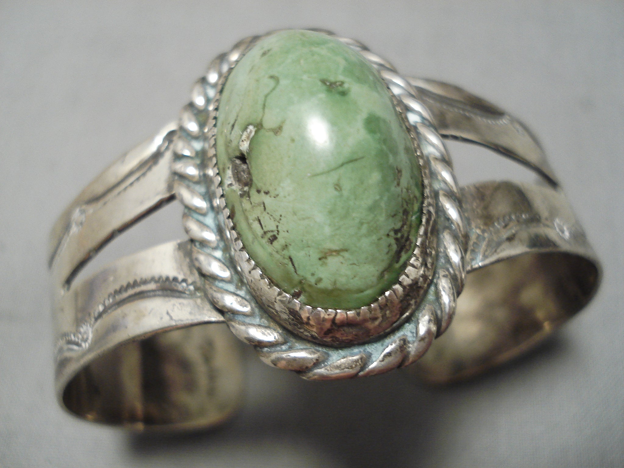 Early 1900's Vintage Native American Navajo Green Turquoise Sterling Silver Bracelet Old