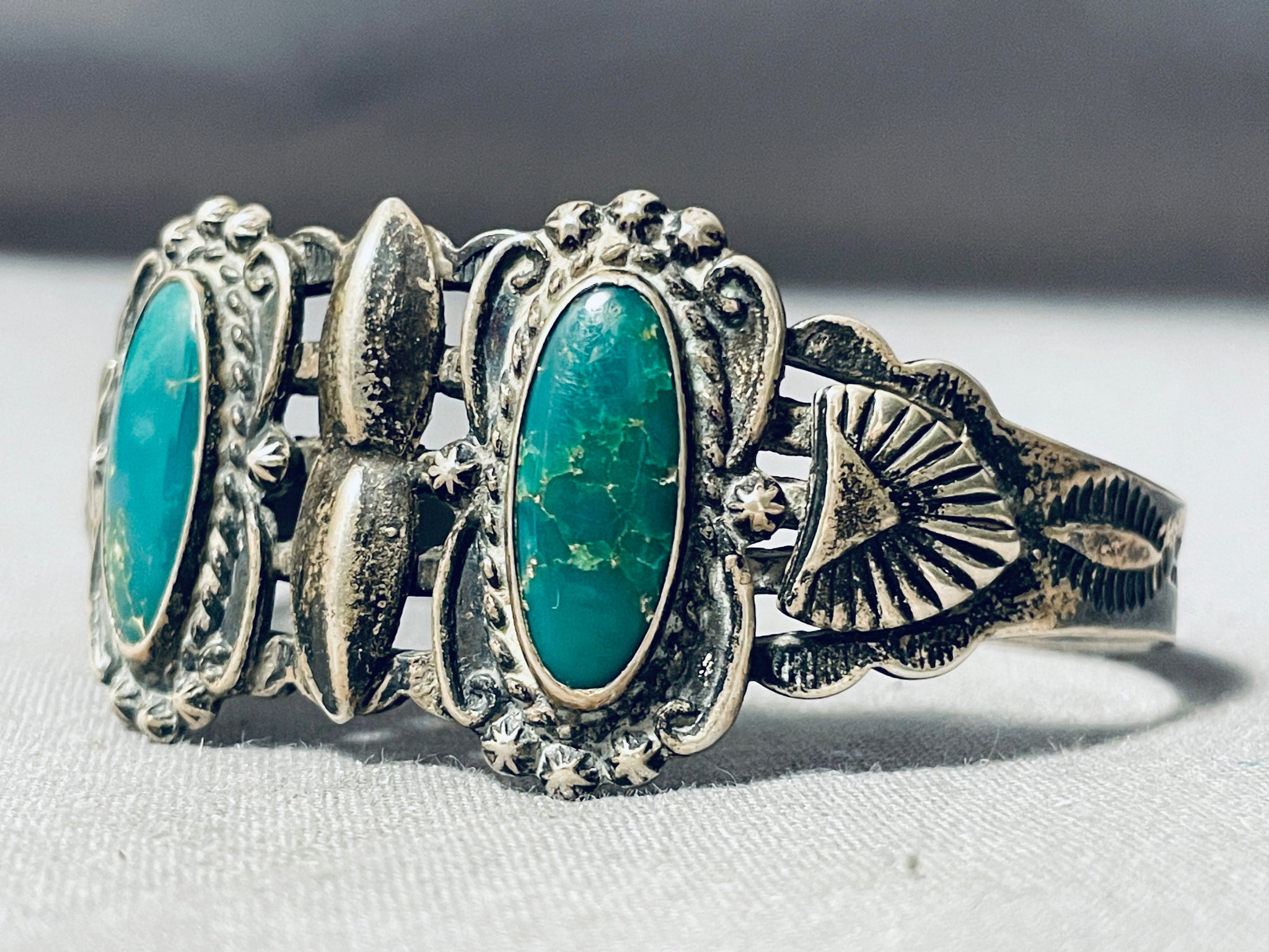 This is a fascinating vintage Navajo two stone silver bracelet. This bracelet consists of two remarkable Royston turquoise stones. The bracelet contains amazing surrounding silver works that include shells, stems, ropes, fan flanks and repoussed shells. Running down the ends of the shank are wonderful silver cloud stampings with arrows and thunderbirds. The stones measure around 3/4" x 1/4". The width of the bracelet measures around 7/8". Sterling silver. Cir. Mid century . The inside end to end measures around 5-1/2" with an additional 1" gap. Sturdy 26 grams.