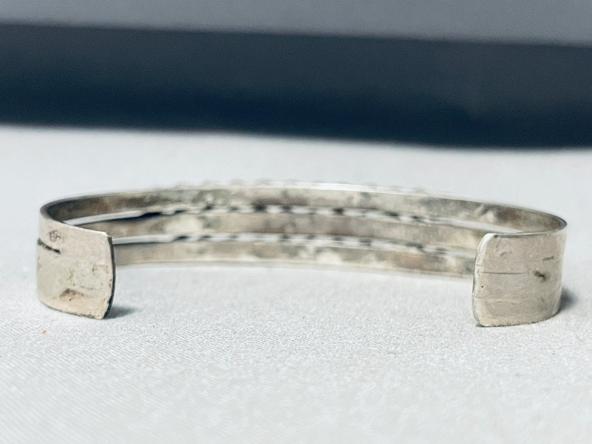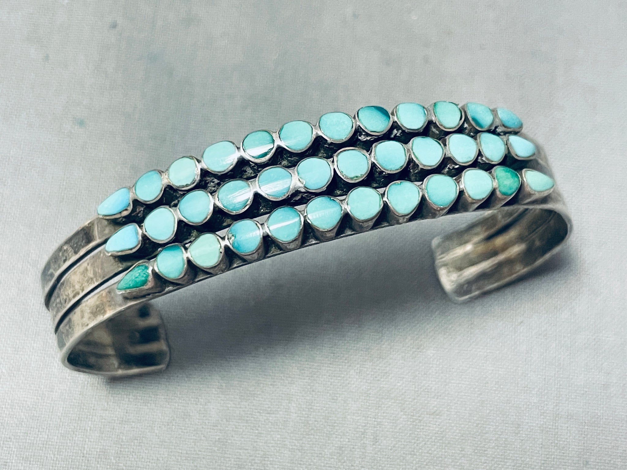This is a fabulous vintage Zuni inlaid silver cuff bracelet. This oustanding bracelet contains three beautiful rows of inlaid snake eye and teardrop shaped turquoise stones. The beauty of the placement of the stones is just beautiful. This bracelet contains a sturdy and thick triple silver shank cuff that gradually graduate in width towards the center. In this type of bracelet, the cuff is made of sterling silver, which is a popular choice for Zuni jewelry due to its durability and ability to complement the vibrant turquoise stones. The centerpiece of the bracelet is the inlaid turquoise stones. Zuni artists are renowned for their skillful techniques in cutting and fitting small pieces of turquoise. Zuni jewelry, including inlaid turquoise cuff bracelets, is highly regarded for its artistry, craftsmanship, and cultural significance. It often represents a blend of traditional techniques and contemporary design, making it a sought-after and cherished piece of Native American jewelry. The width of the bracelet measures around 1/2". Sterling silver. Cir. Mid century . The inside end to end measures around 5" with an additional 1-1/2" gap. Sturdy 19 grams.