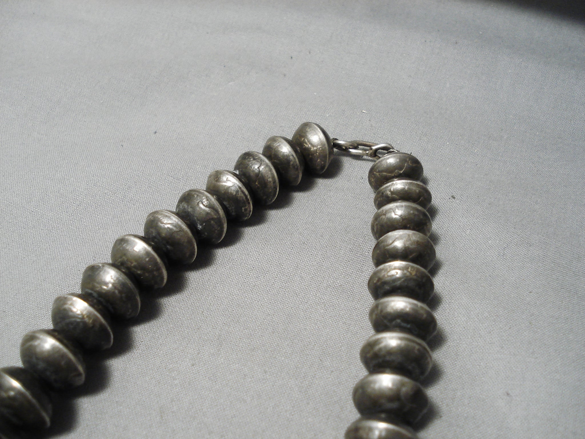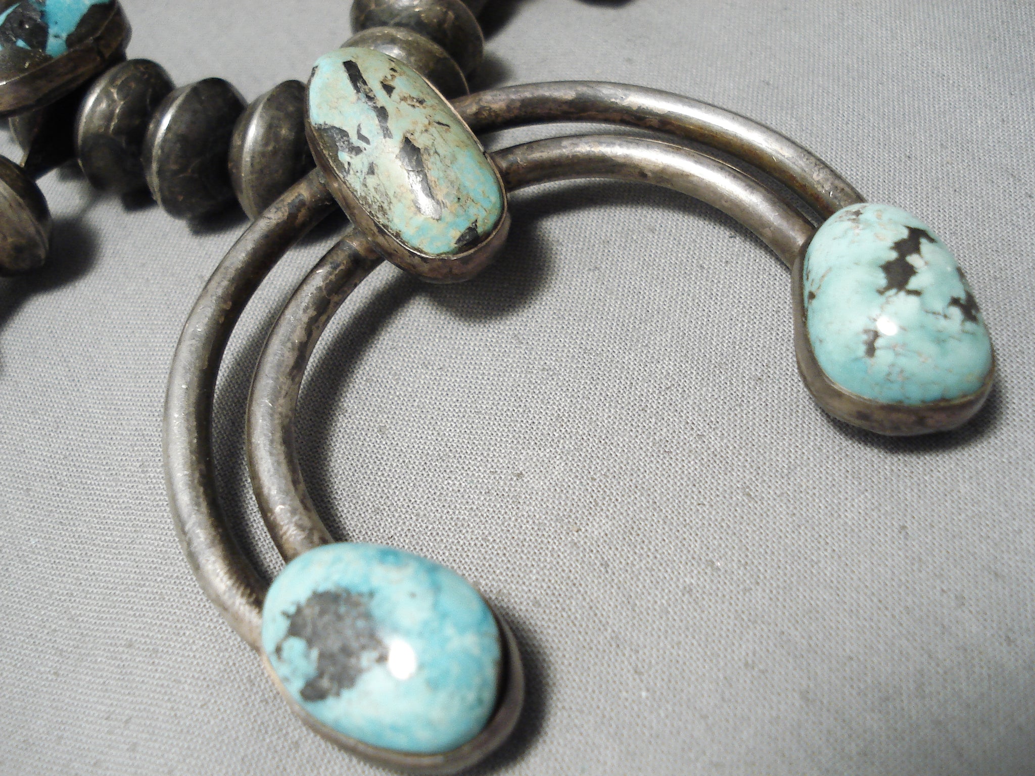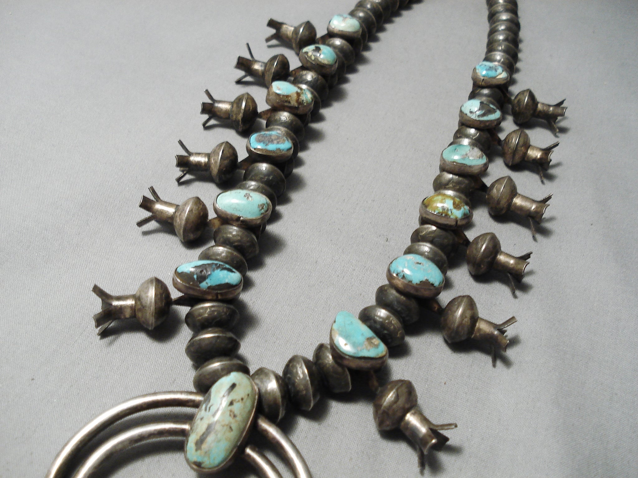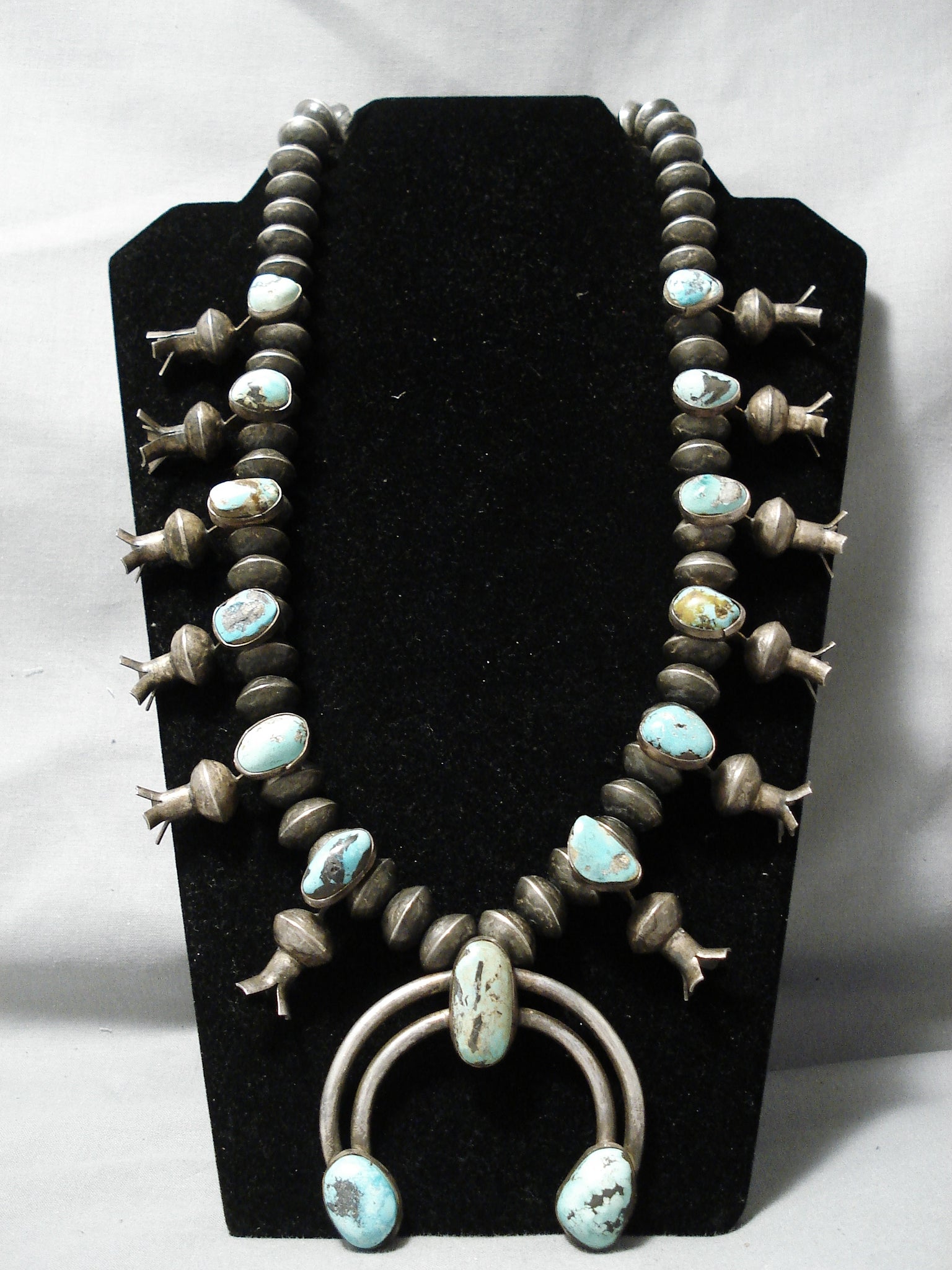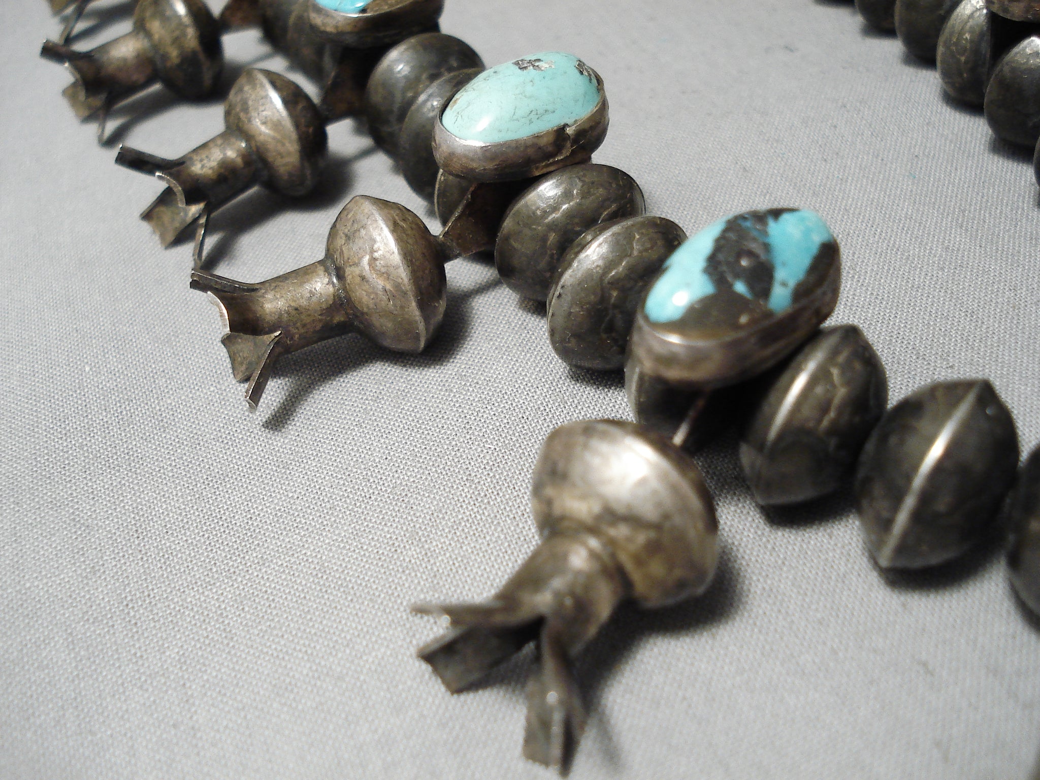 This is a museum quality vintage Navajo heavy turquoise and silver squash blossom necklace. This is one of the earliest squash blossom necklaces we have recently collected. This piece is an authentic early 1900's coin silver squash blossom necklace. Located throughout the necklace are 15 extremely rare Hachita turquoise stones with the largest measuring around 1" X 1/2". Resting throughout the necklace are phenomenal silver coins for the beads with a traditional silver clasp. The double silver shank naja pendant is absolutely phenomenal measuring around 2-1/2" X 2-1/2". The old natural patina that is situated throughout the entire necklace is just breathtaking. Coin silver. Cir. 1920's/ 30's. The length of the necklace measures around 29". Sturdy 449 grams.
