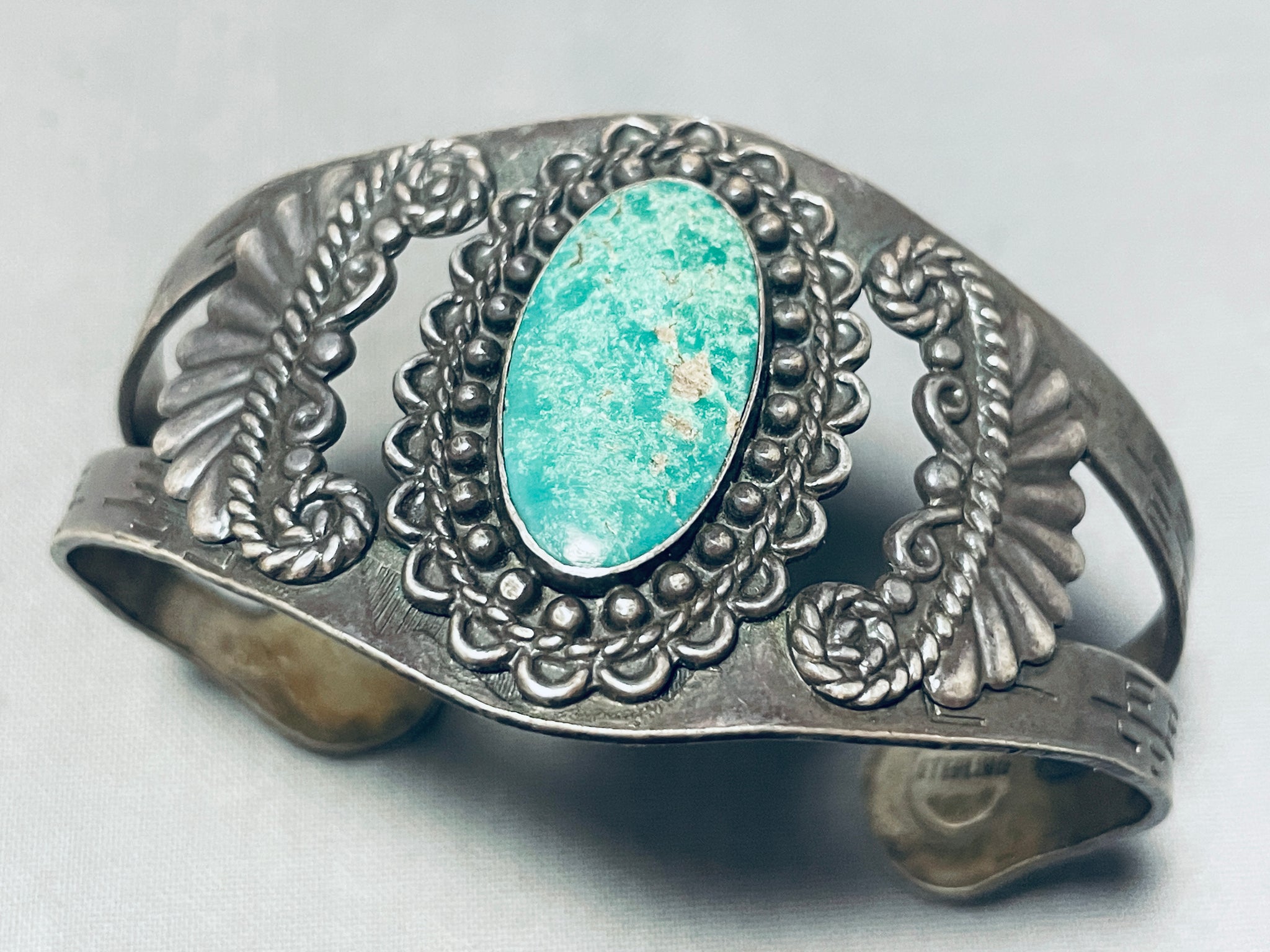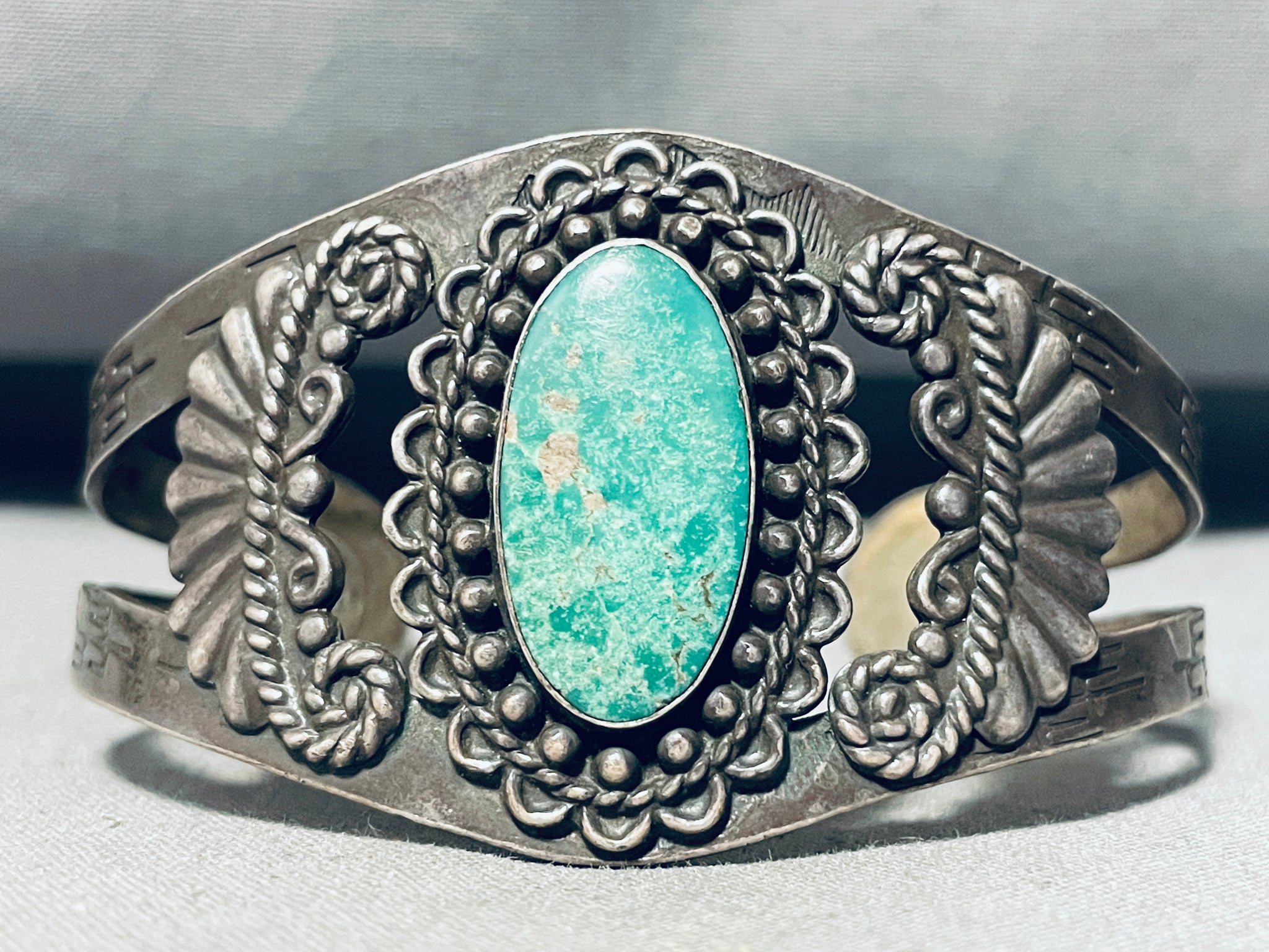 This is an exquisite vintage Navajo single stone silver bracelet. This incredible bracelet contains a center hand carved oval shaped Royston turquoise stone. Surrounding the stone are wonderful silver works that include raindrops, ropes and wave patterns. Also accenting the stone are sueprior silver flank works that include roped stems, s patterns, raindrops and repoussed shells. Thi bracelet is absolutely superior consisting of a double silver shank cuff. The center stone measures around 7/8" x 3/8". The width of the bracelet measures around 1-3/8". Sterling silver, marked. Cir. Mid century . The inside end to end measures around 5-1/2" with an additional 1" gap. Sturdy 31 grams.