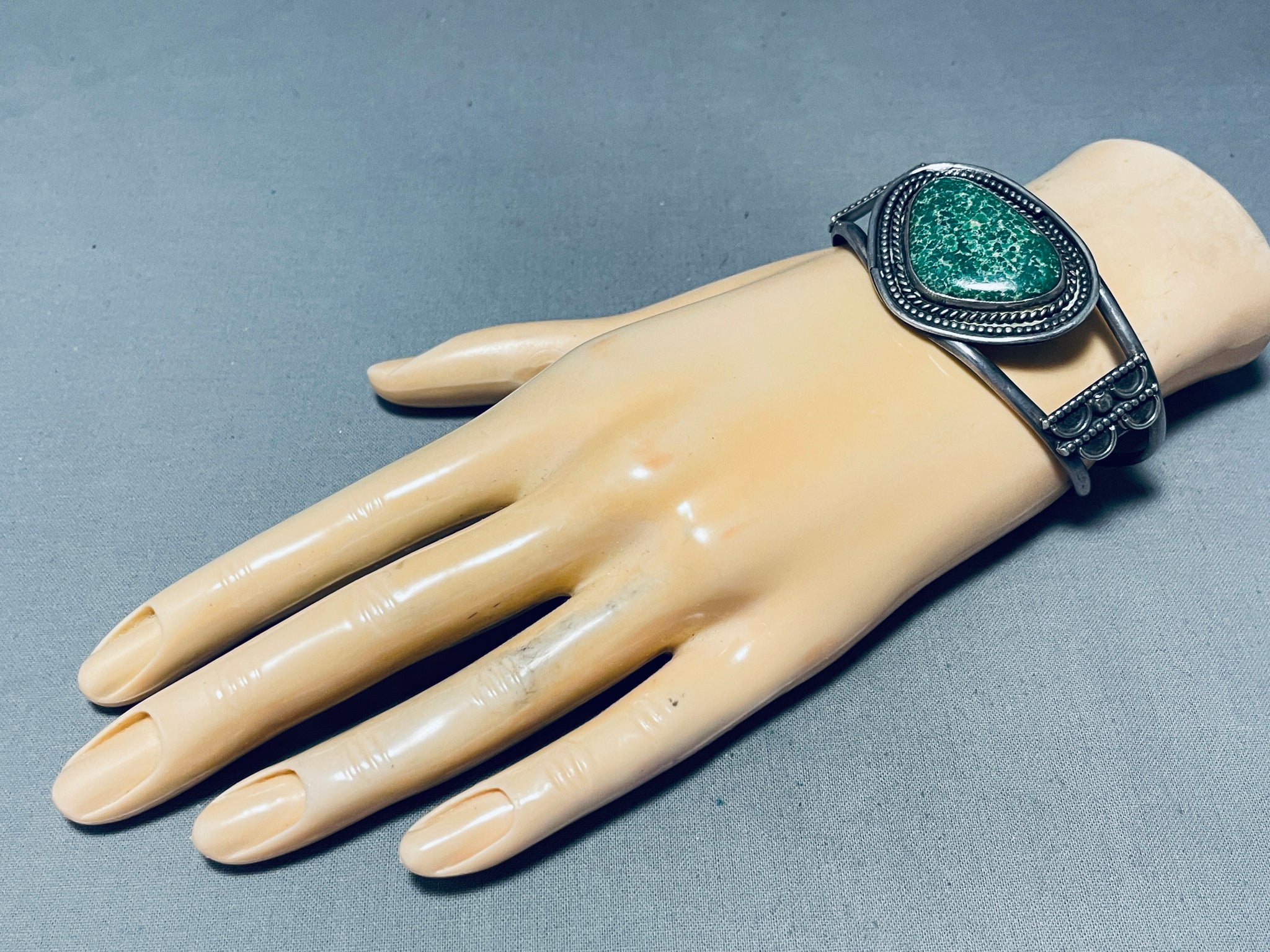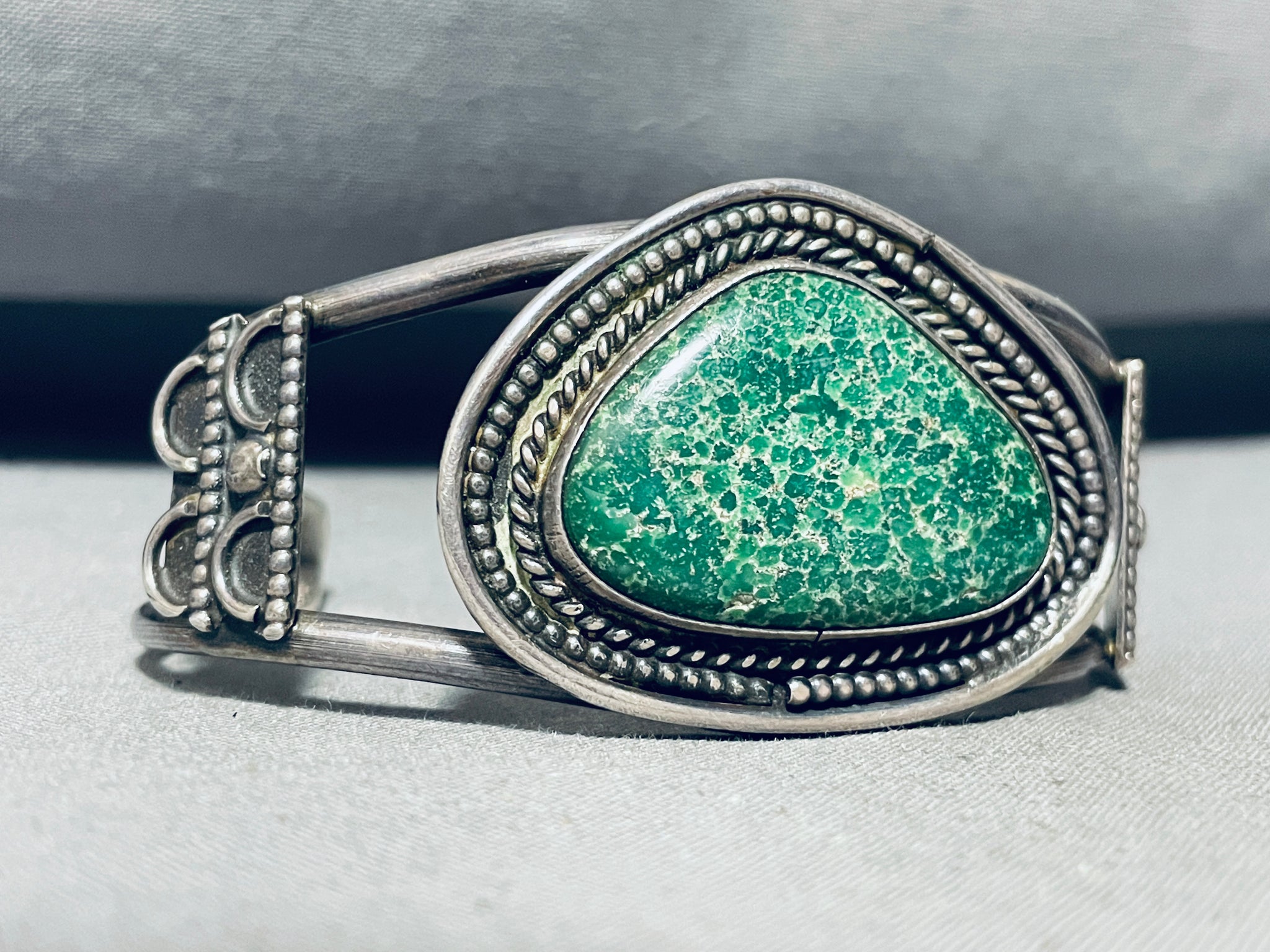 This is an incredible vintage Navajo large single stone silver bracelet. This wonderful bracelet contains a center fat triangular shaped green Damale turquoise stone. Surrounding the stone are two beautiful silver ropes. Resting at the sides of the double silver shank cuff are double tiered silver flanks that consist of wave works and raindrops. The bracelet contains a marvelous double silver shank cuff that graduates in width towards the center. The old natural patina on this bracelet is just fascinating. The center stone measures around 1-1/8" x 3/4". The width of the bracelet measures around 1-1/4". Sterling silver. Cir. Mid century . The inside end to end measures around 5-1/4" with an additional 1-1/4" gap. Sturdy 30 grams.