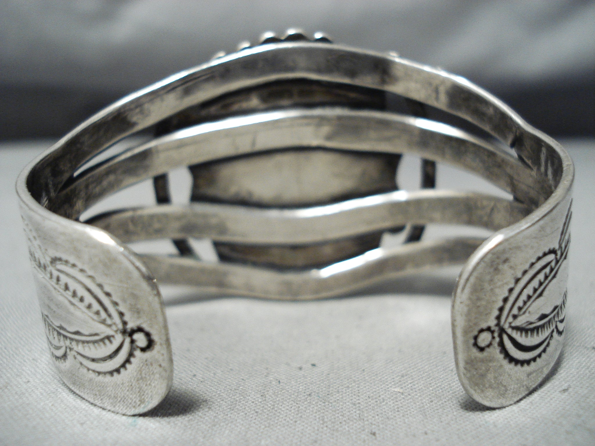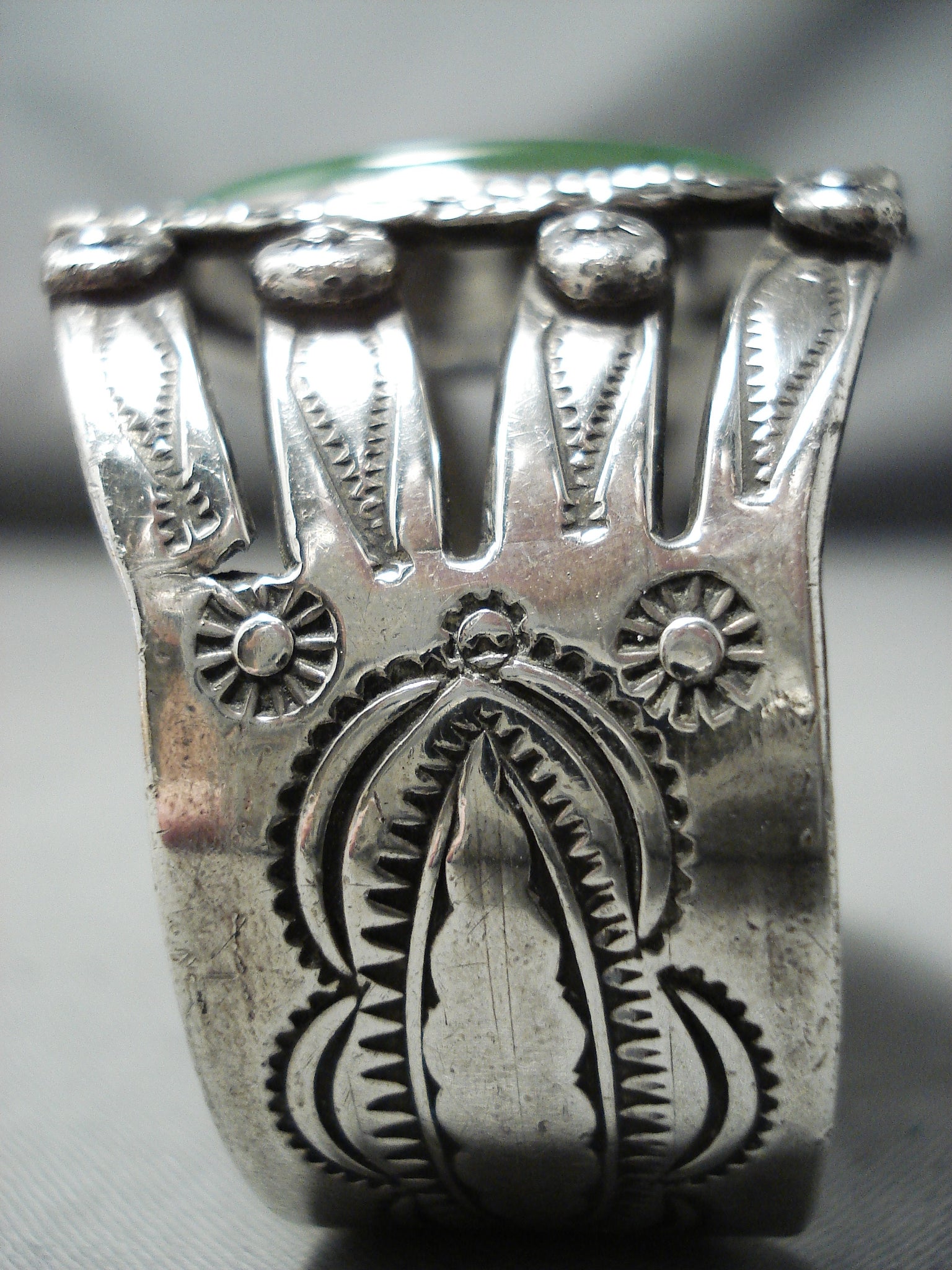 This is a fabulous vintage Navajo single stone silver bracelet. This wonderful bracelet contains a center dome shaped Cerrillos turquoise stone. Surrounding the stone are impeccable silver works that consist of raindrops, ropes, shells and curved silver flanks. This bracelet contains a superior quadruple silver shank cuff that graduates into one shank at the ends. The stampings that run down the ends are beautiful and include suns and shells. The center stone measures around 1-1/4" x 1". The width of the bracelet measures around 1-5/8". Sterling silver. Cir. Earlier 1900's . The inside end to end measures around 5-1/4" with an additional 1" gap. Sturdy 55 grams.