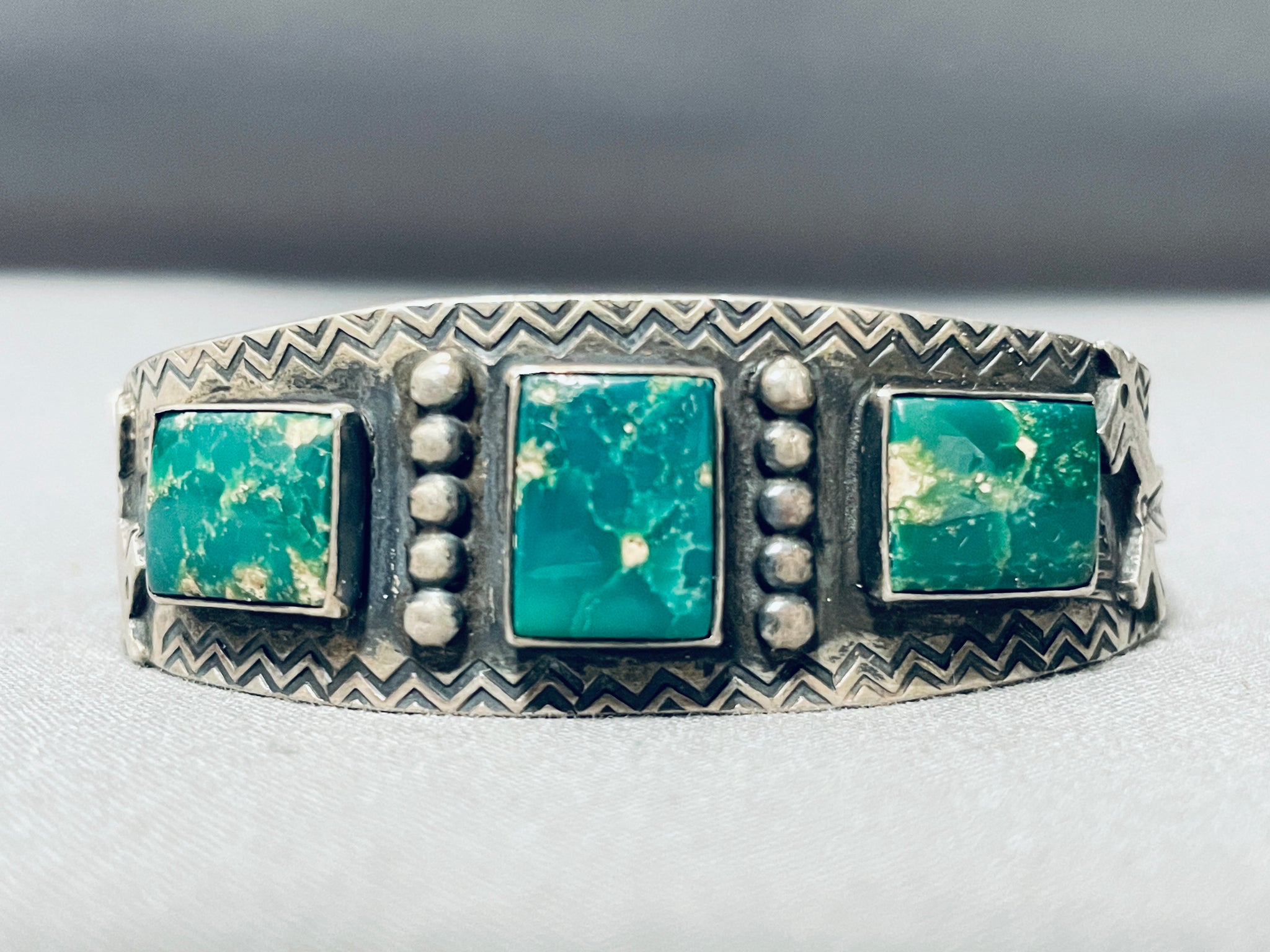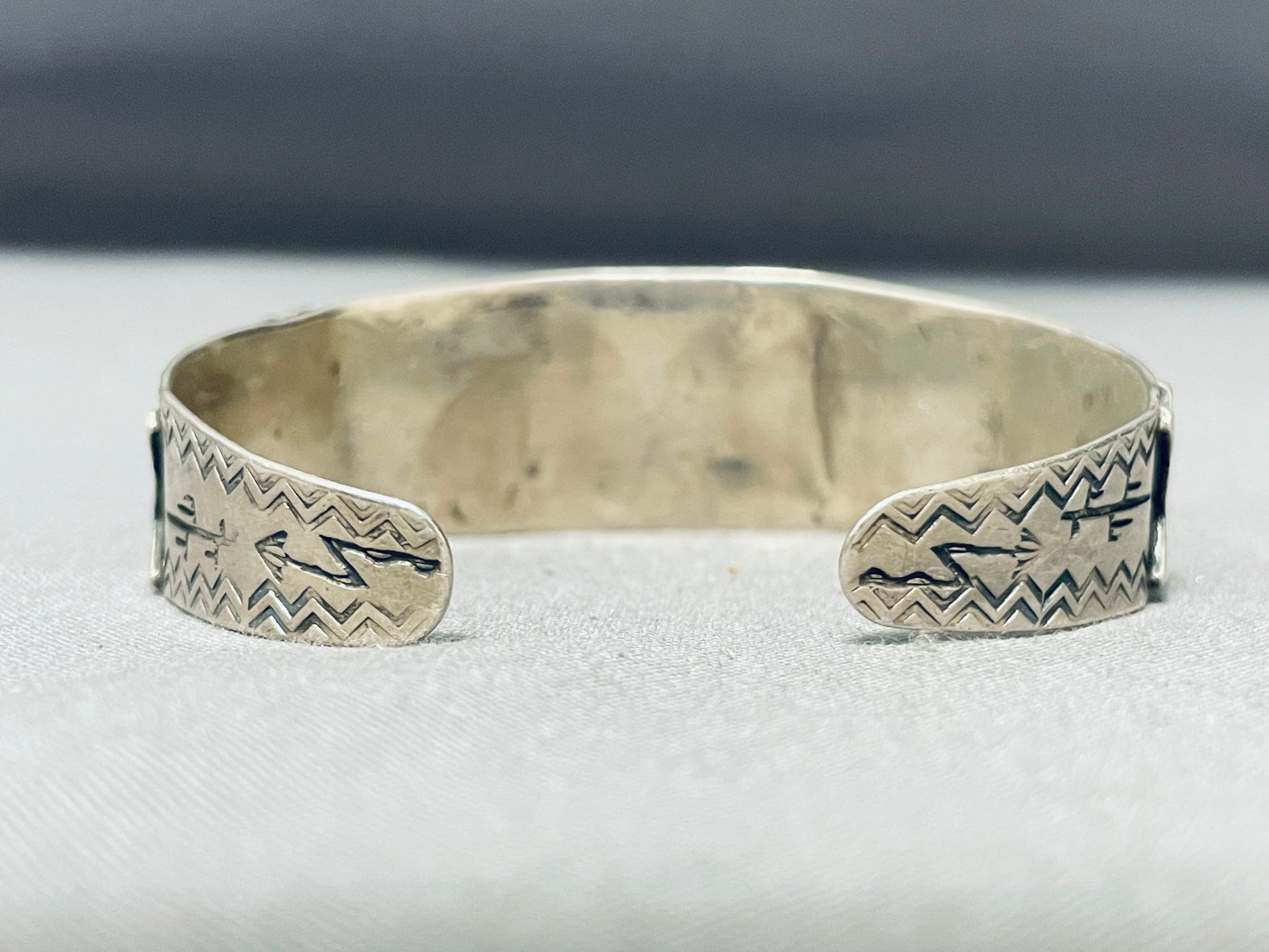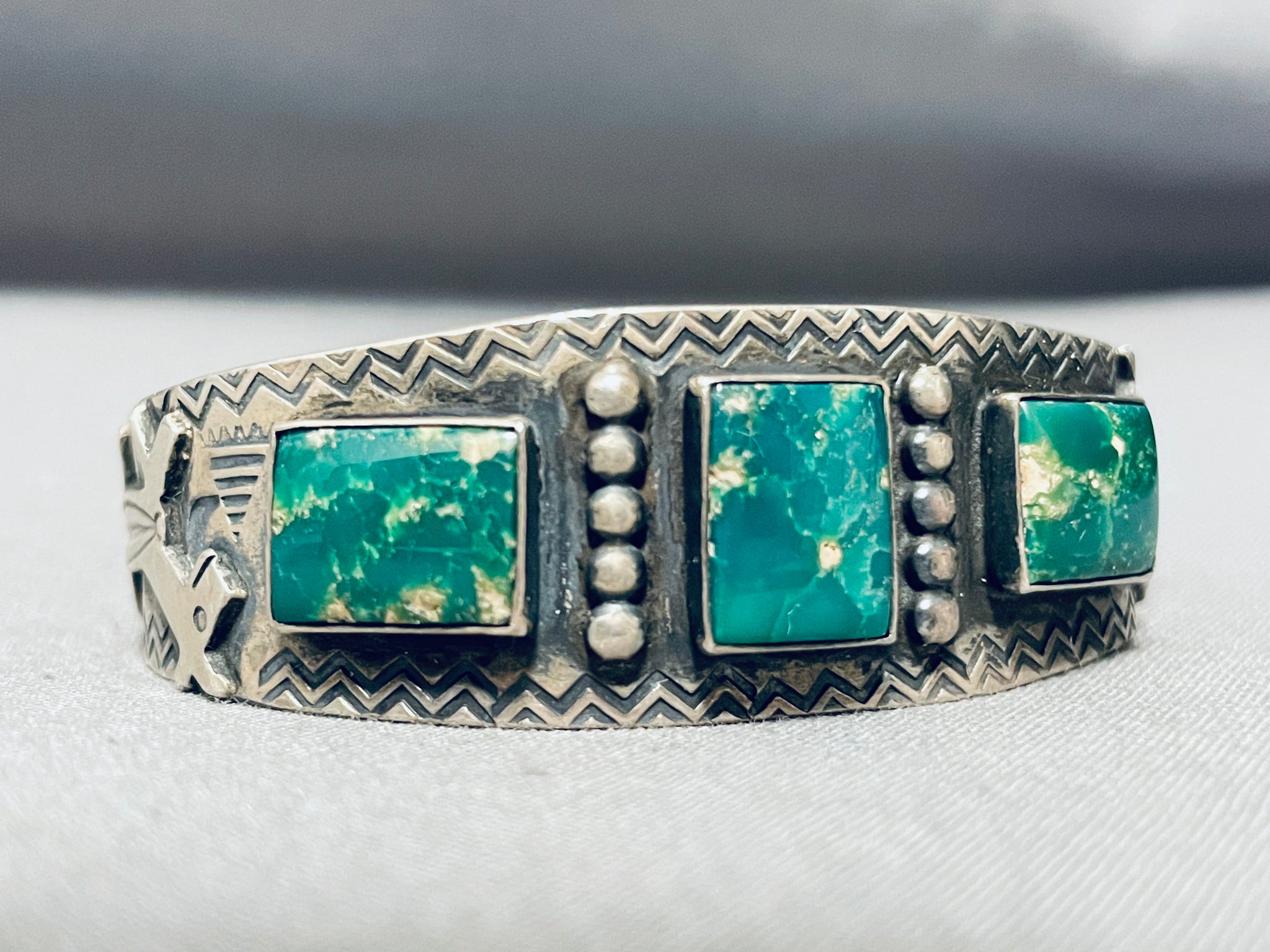 This is an exceptional vintage Navajo very old three stone silver bracelet. This impressive bracelet contains three beautiful rectangular shaped Cerrillos turquoise stones. Accenting the center stone are amazing raindrop flanks. Located throughout the entire bracelet are phenomenal stampings that include zig zag patterns, cactus stampings, arrow works and hand carved antelopes. This bracelet is absolutely phenomenal. The stones measure around 1/2" x 3/8". The width of the bracelet measures around 3/4". Sterling silver. Cir. Mid century . The inside end to end measures around 5-1/2" with an additional 3/4" gap. Sturdy 24 grams.
