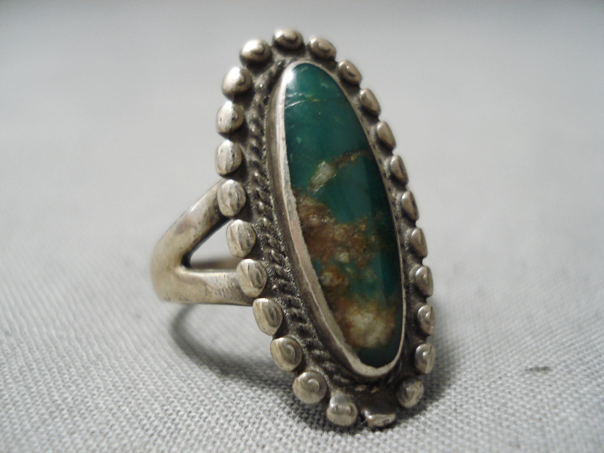 Up for sale is this striking vintage Navajo silver ring having a large Cerillos turquoise oval surrounded by handcarved silver rope and a silver bead border! The ring has a graduated handcarved double silver rail band! Very Unique! The center stone measures around 5/8" x 1/4". The ring face measures around 1" x 1/2". The ring size is around 6. Sterling silver. Sturdy 4 grams.