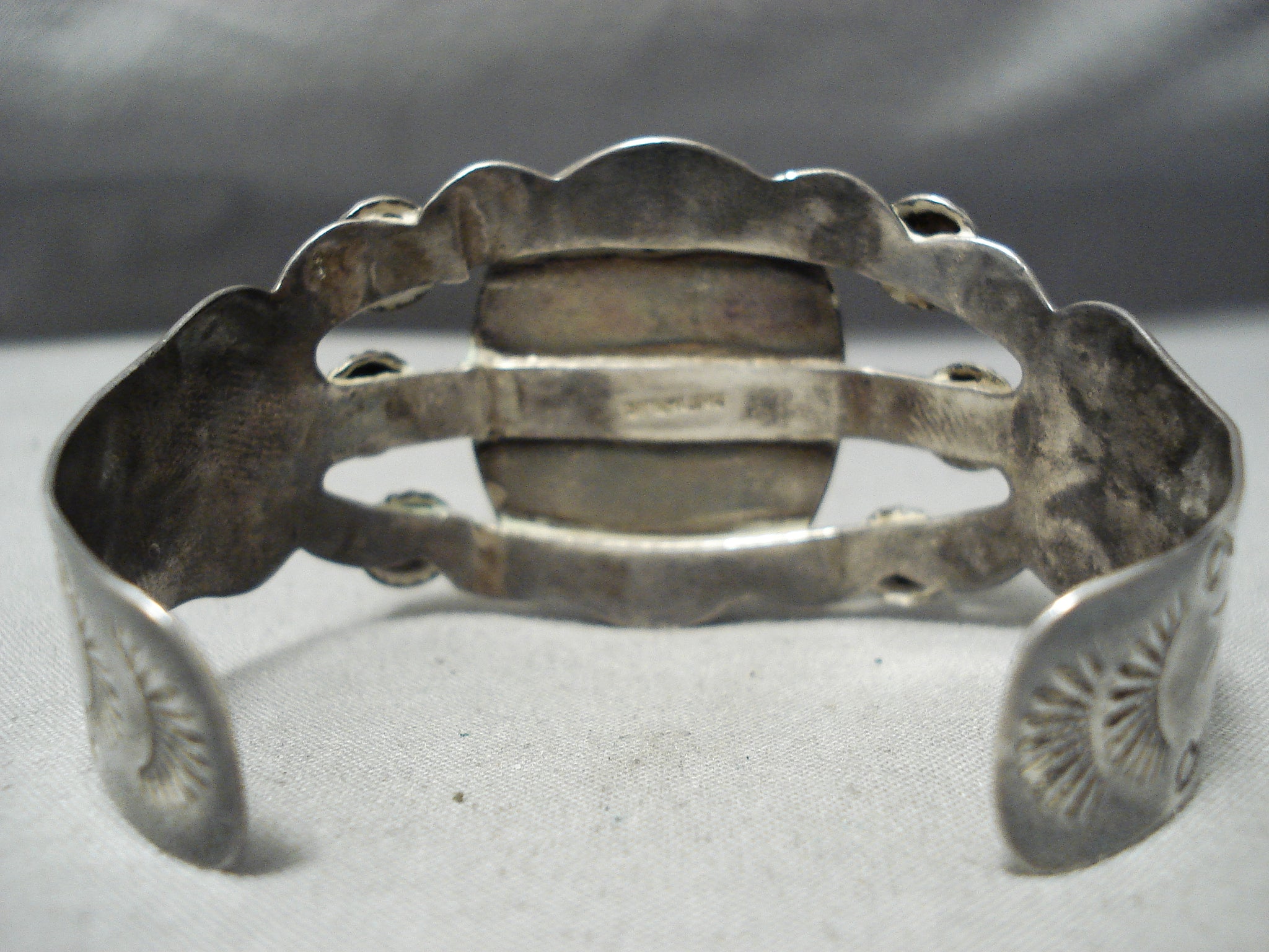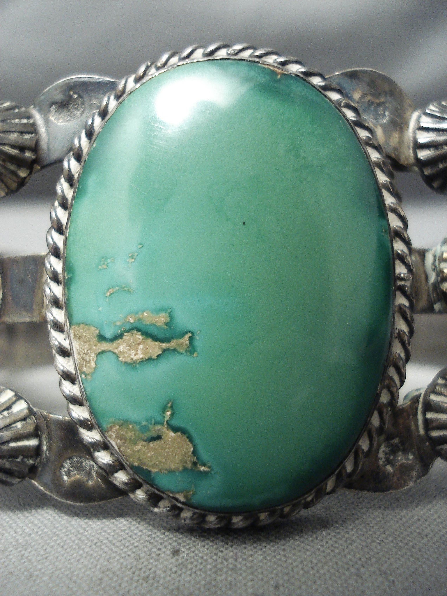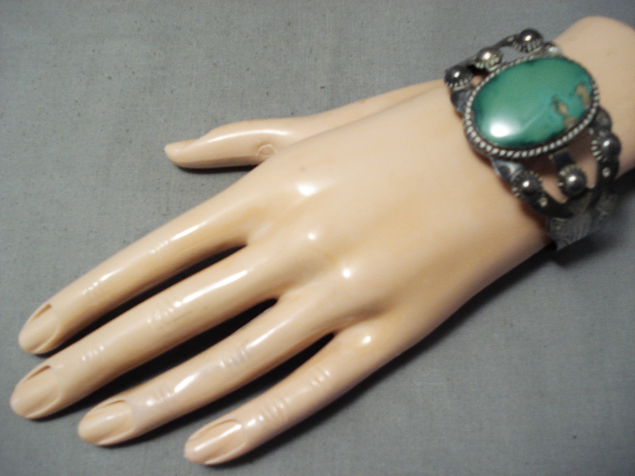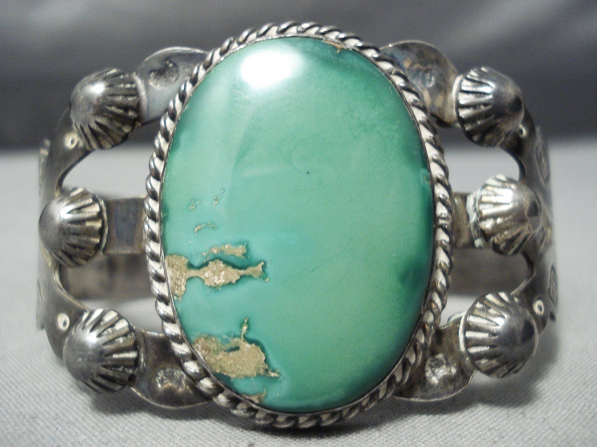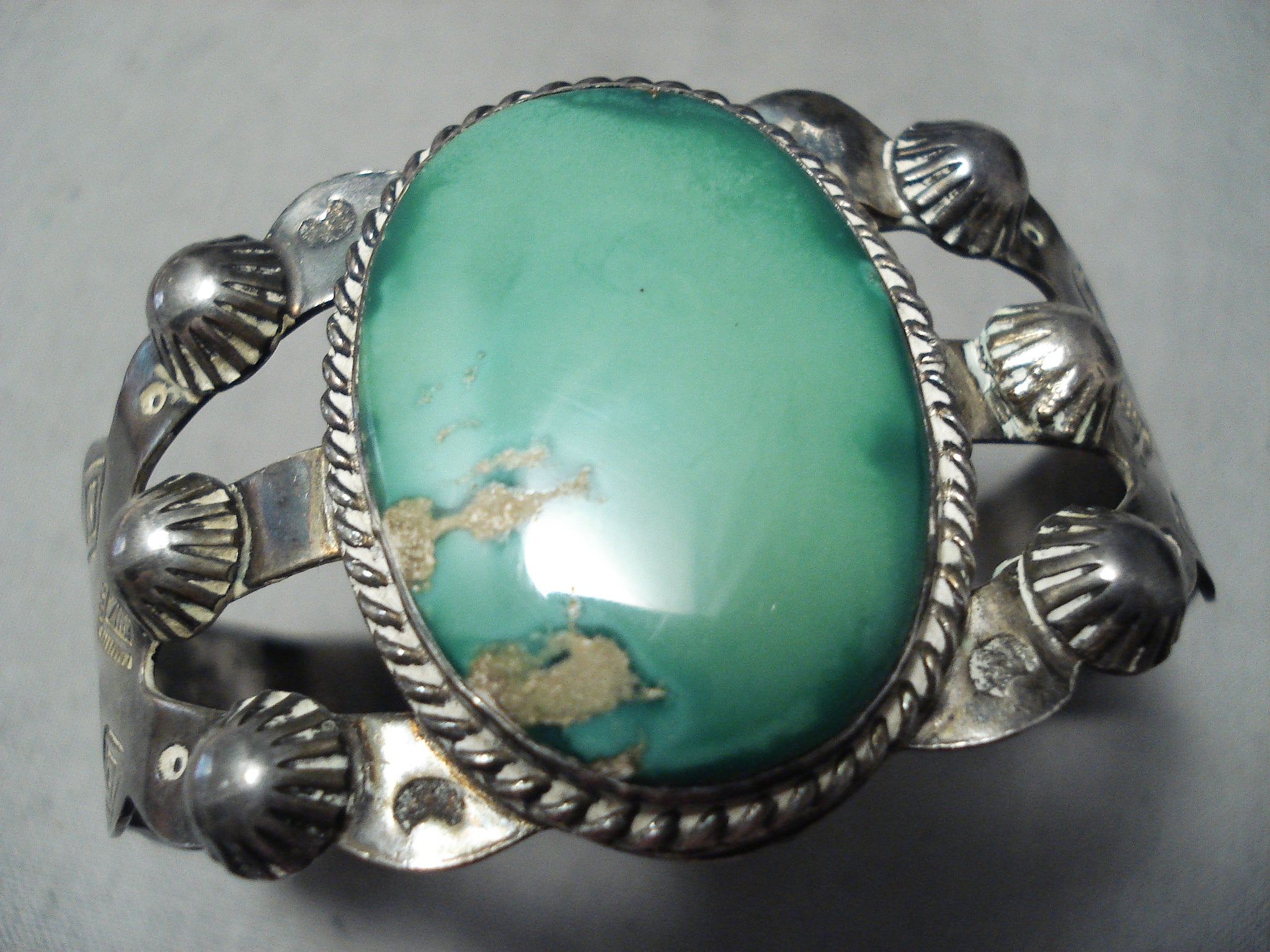 Early Vintage Native American Navajo Repoussed Sterling Silver Green Turquoise Bracelet