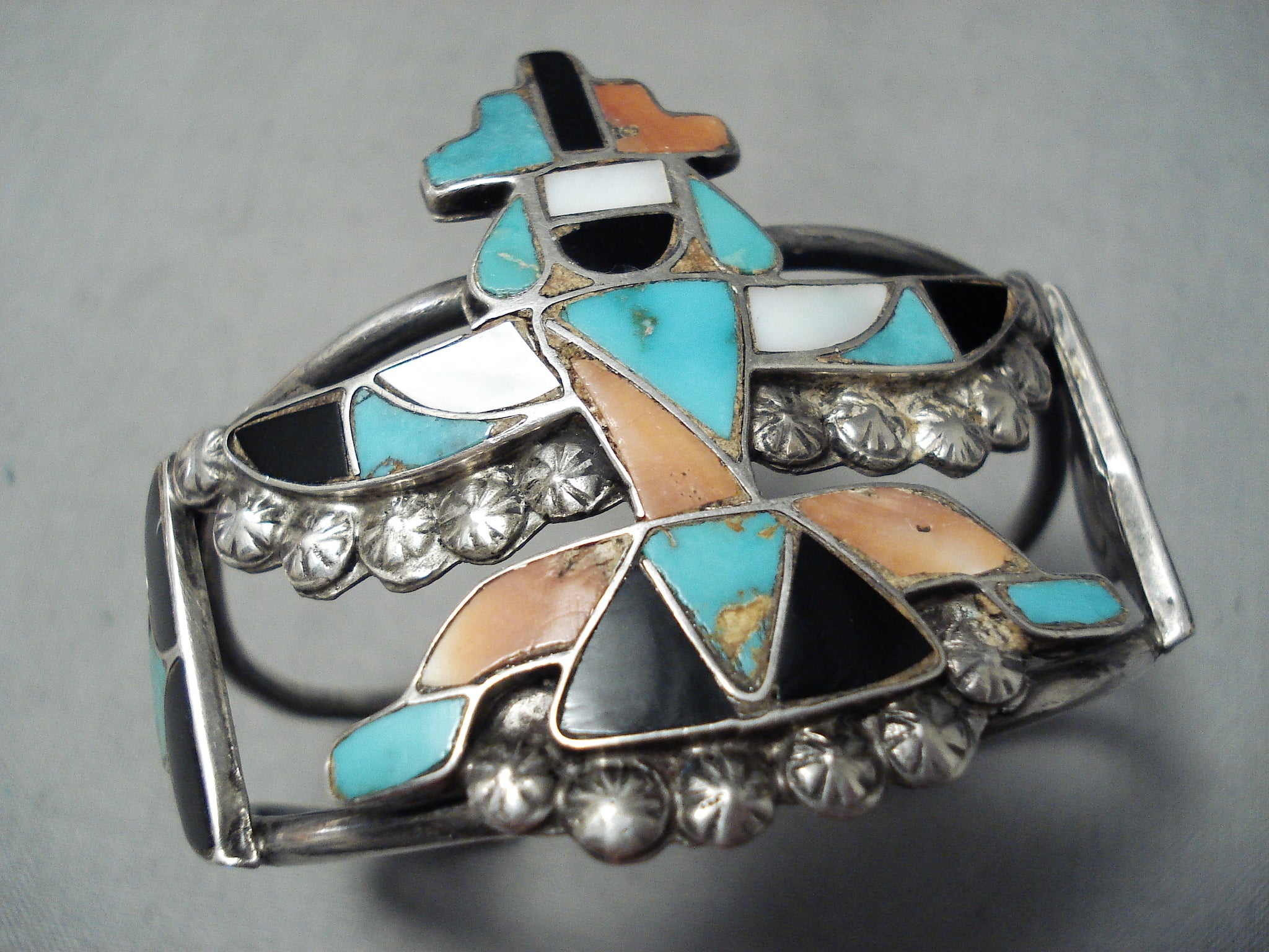 This is a fascinating vintage Zuni inlaid silver bracelet. This museum quality piece is from the earlier 1900's and contains a remarkable inlaid center dancing kachina. The inlay consists of turquoise, onyx, mother of pearl and spiny oyster. Situated throughout the bracelet are wonderful silver shells. This bracelet contains a stunning rounded double silver shank cuff. The width of the bracelet measures around 1-1/8". Sterling silver. Cir. Mid century . The inside end to end measures around 5-1/2" with an additional 1" gap. Sturdy 30 grams.