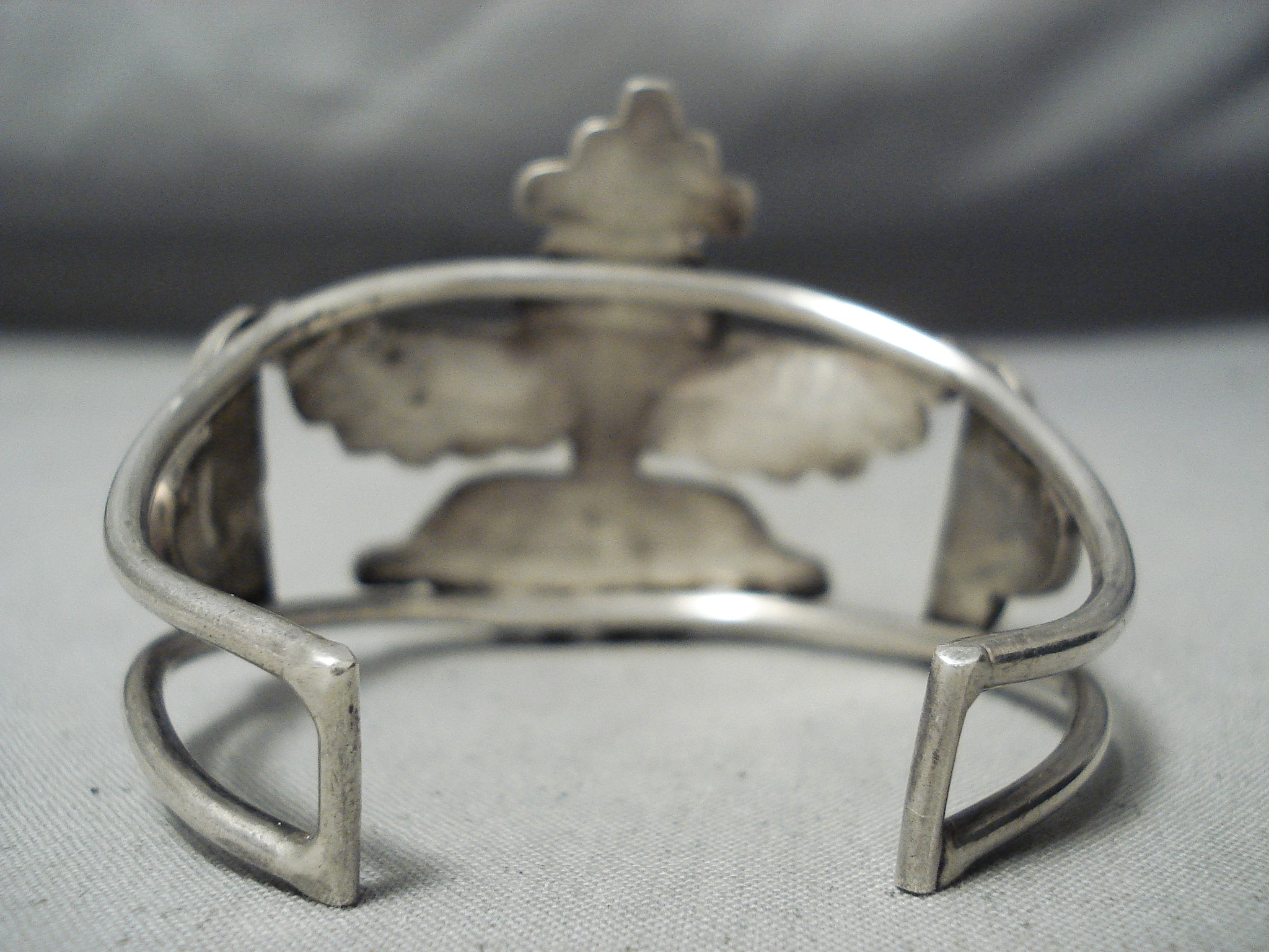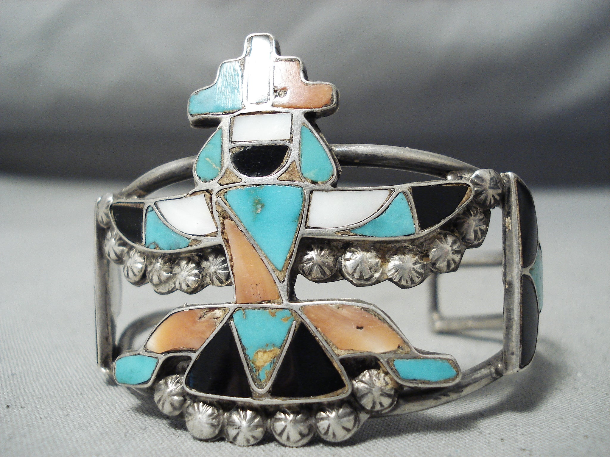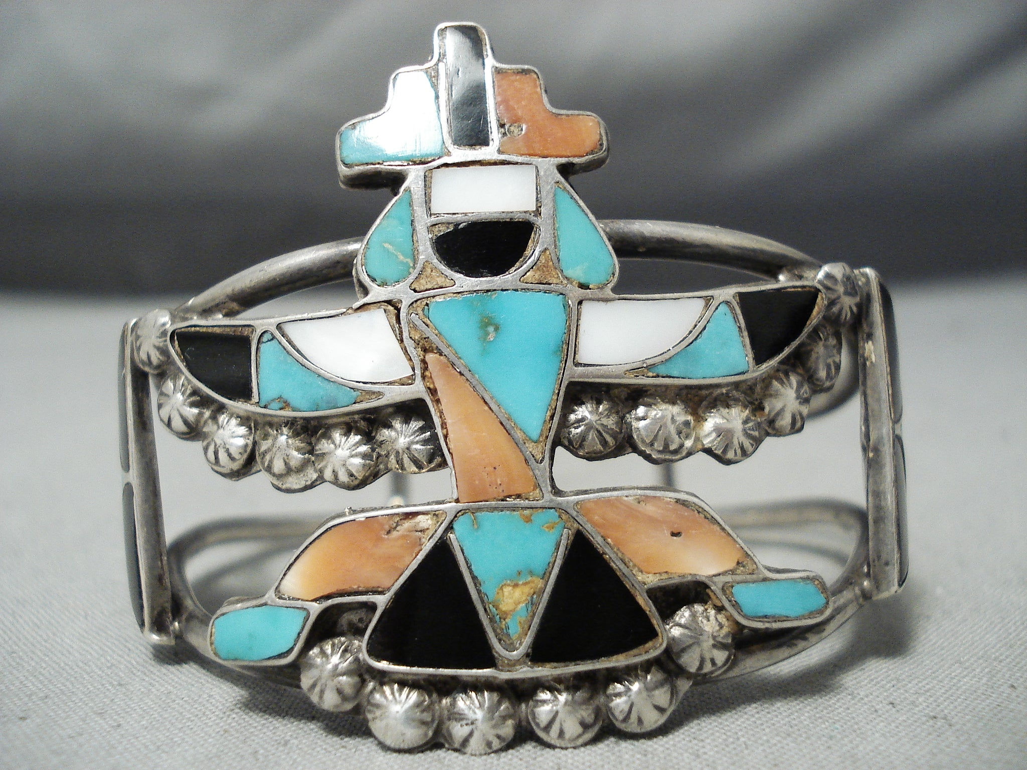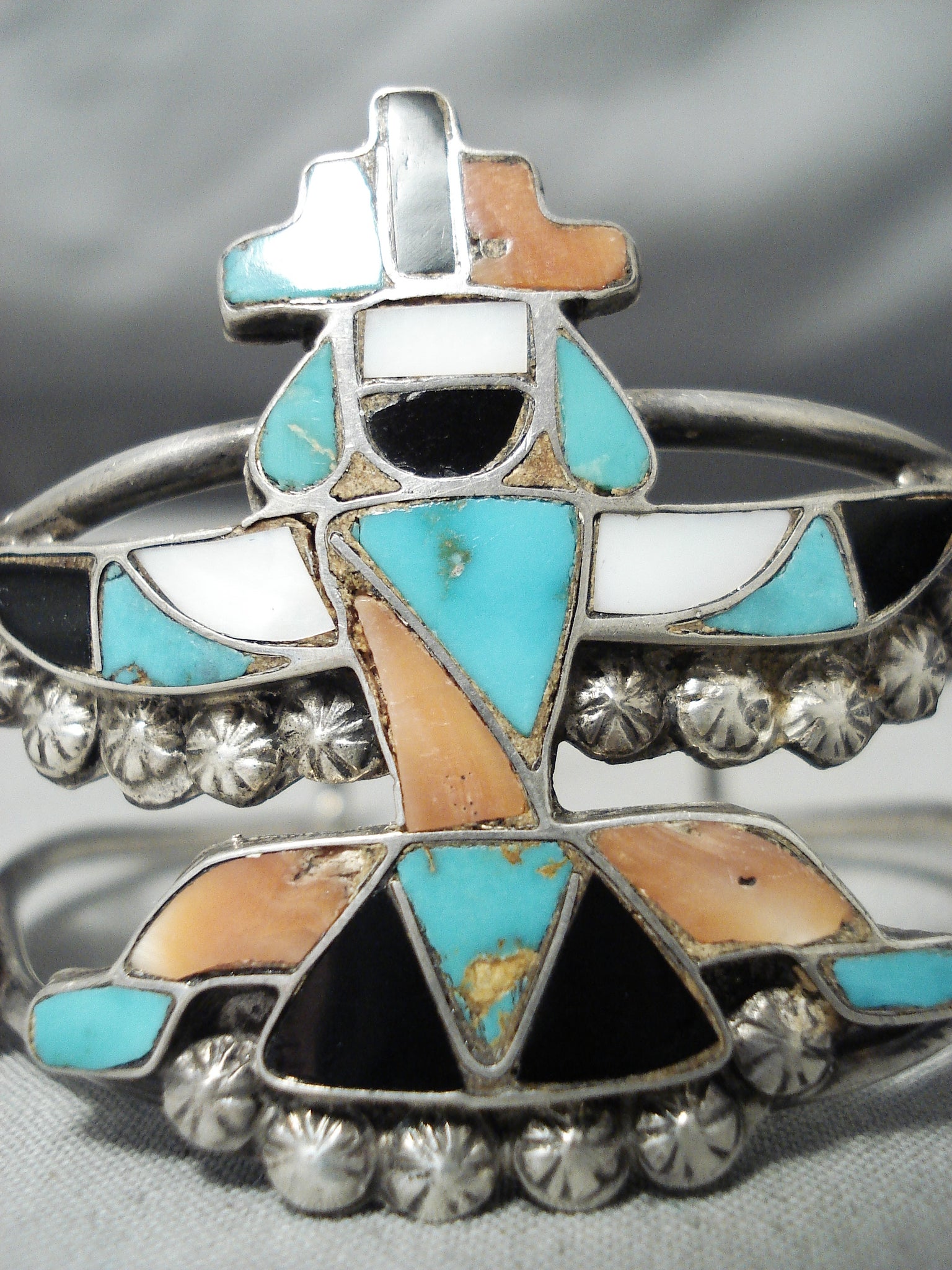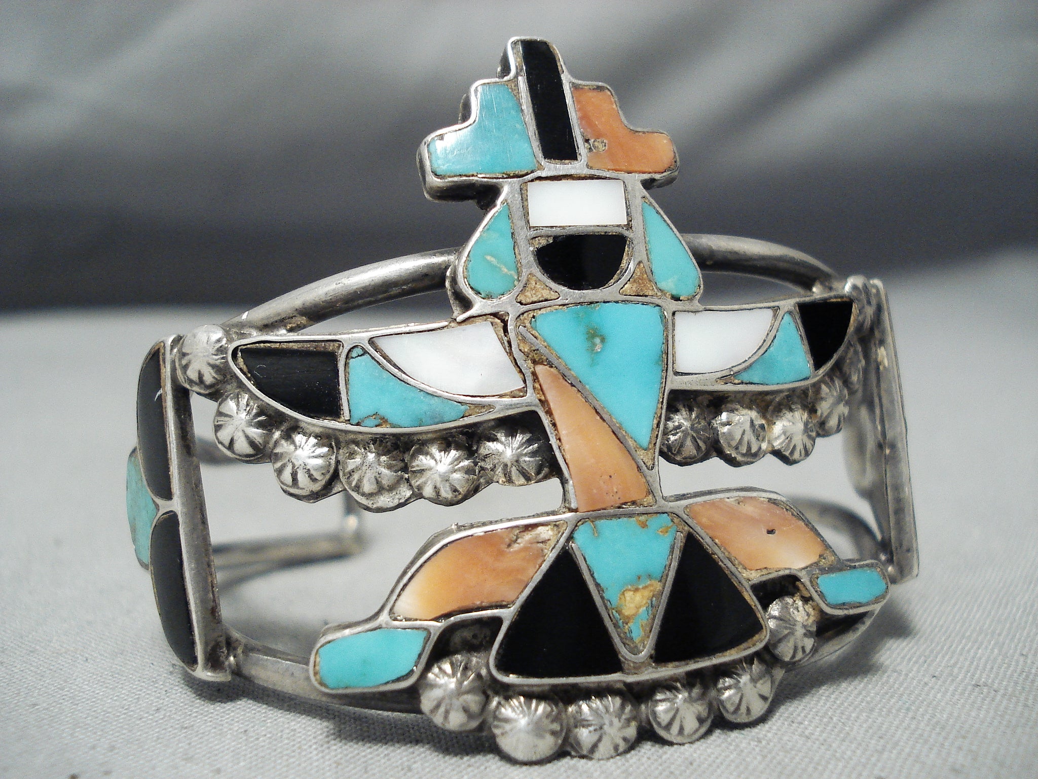Eartly 1900's Vintage Native American Zuni Turquoise Kachina Sterling Silver Inlay Bracelet Old