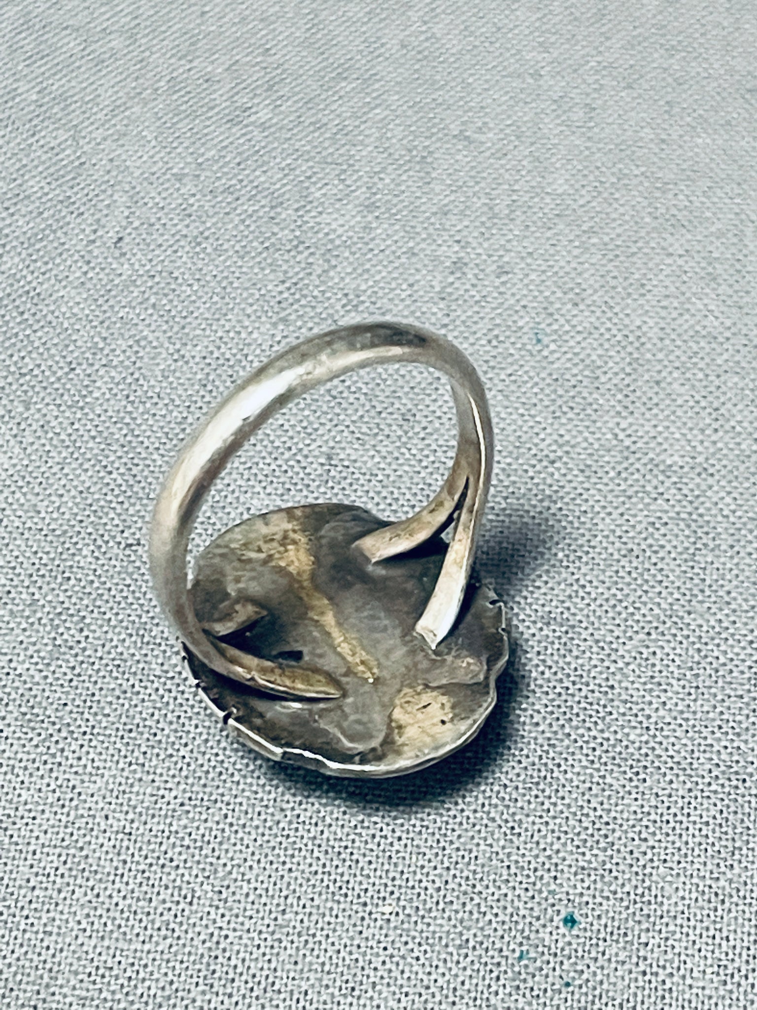 This is an exquisite vintage Navajo single stone silver ring. This wonderful ring contains a center green to blue colored turquoise stone. Surrounding the stone are amazing silver works that consist of a rope and channel patterns. The center stone measures around 1/2" x 1/4". The ring face measures around 3/4" x 5/8". The ring size is around 6.5. Cir. Mid century . Sterling silver. Sturdy 4 grams.