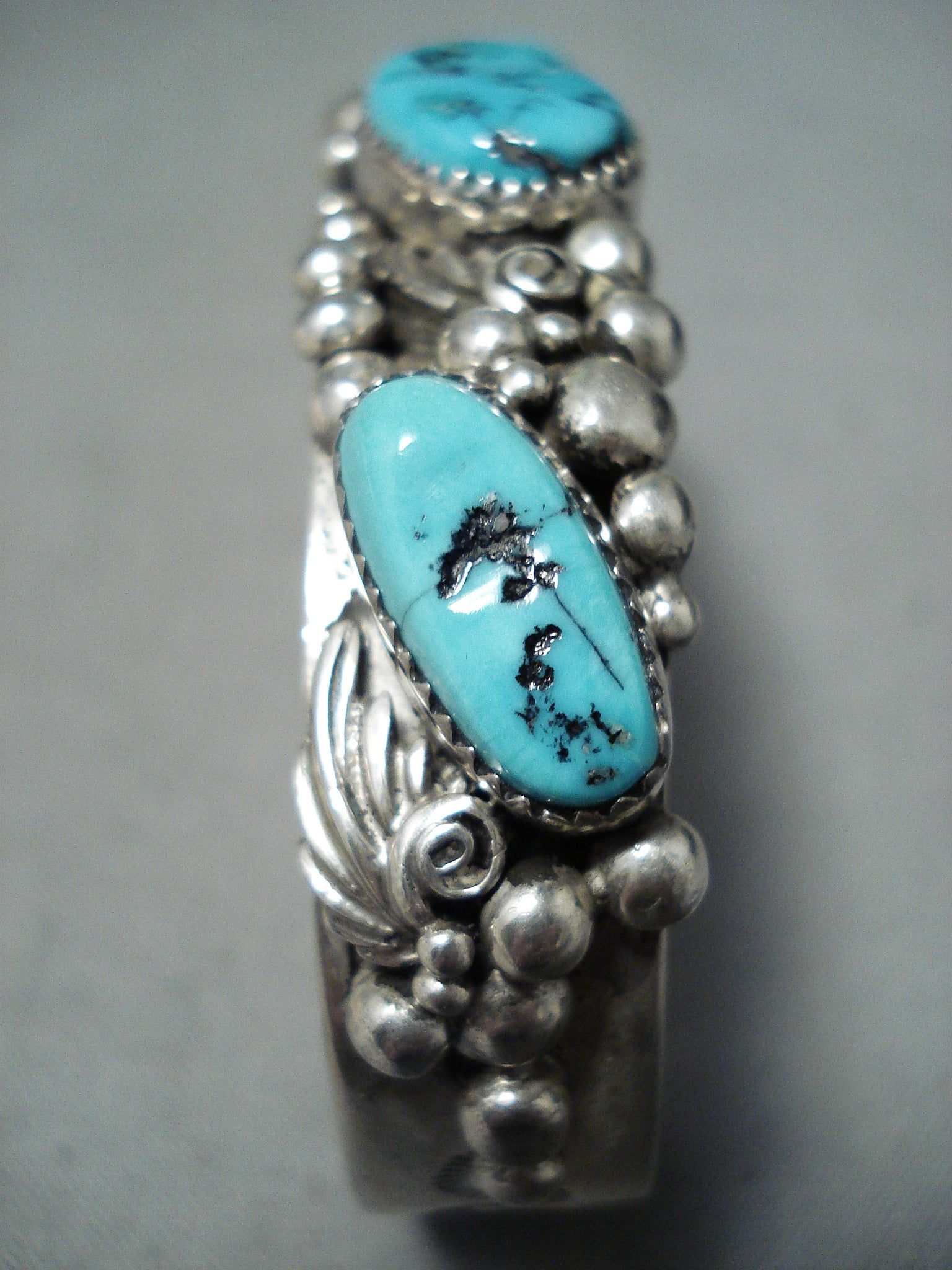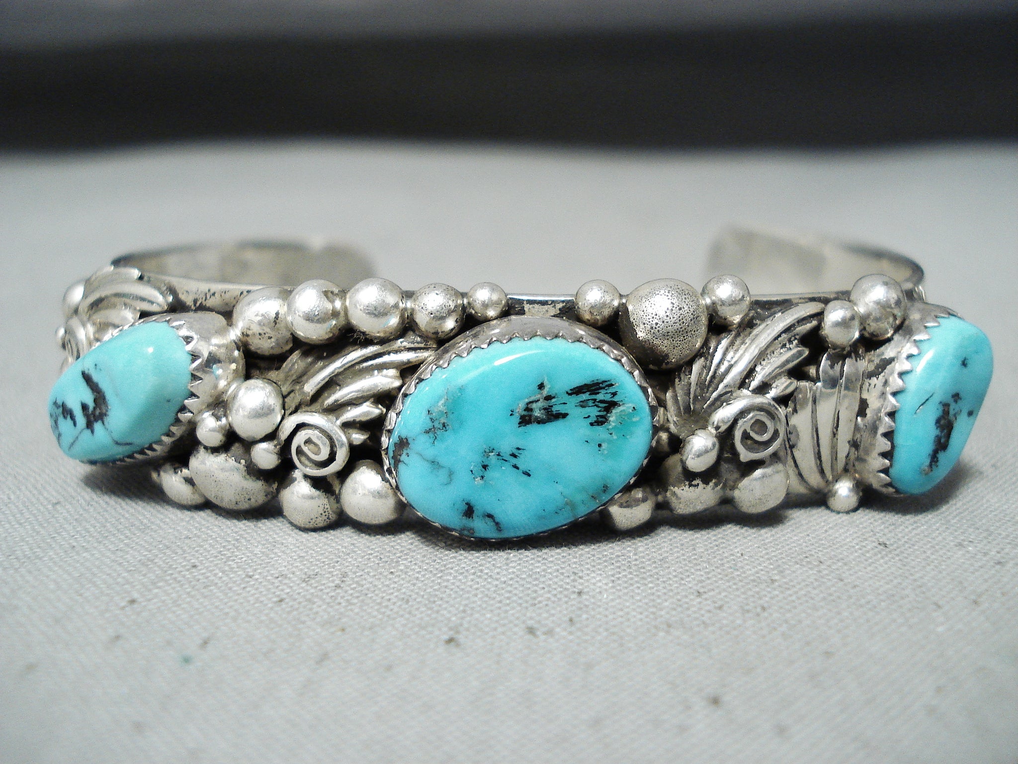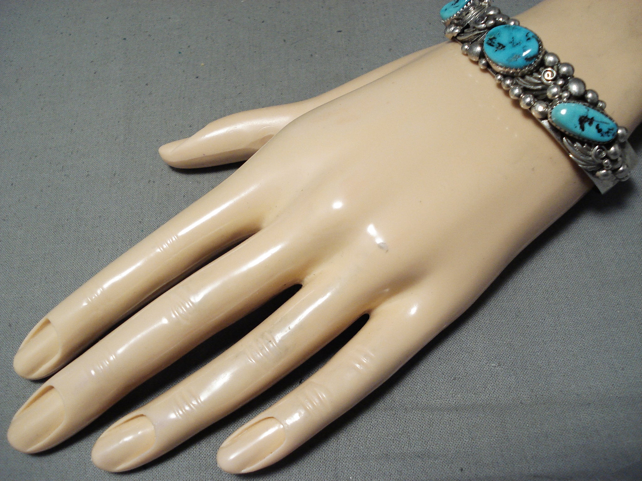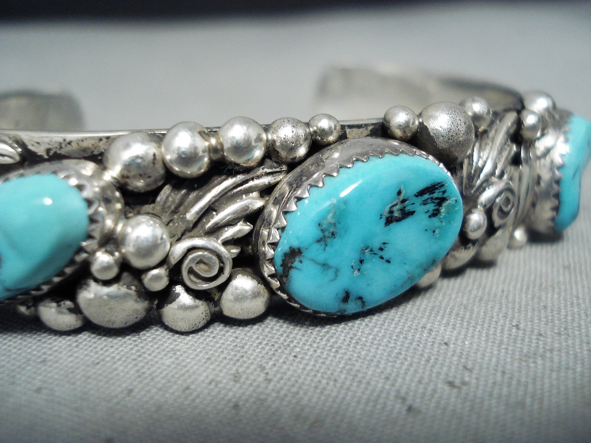 Elaborate Vintage Native American Navajo Morenci Turquoise Sterling Silver Bracelet Signed