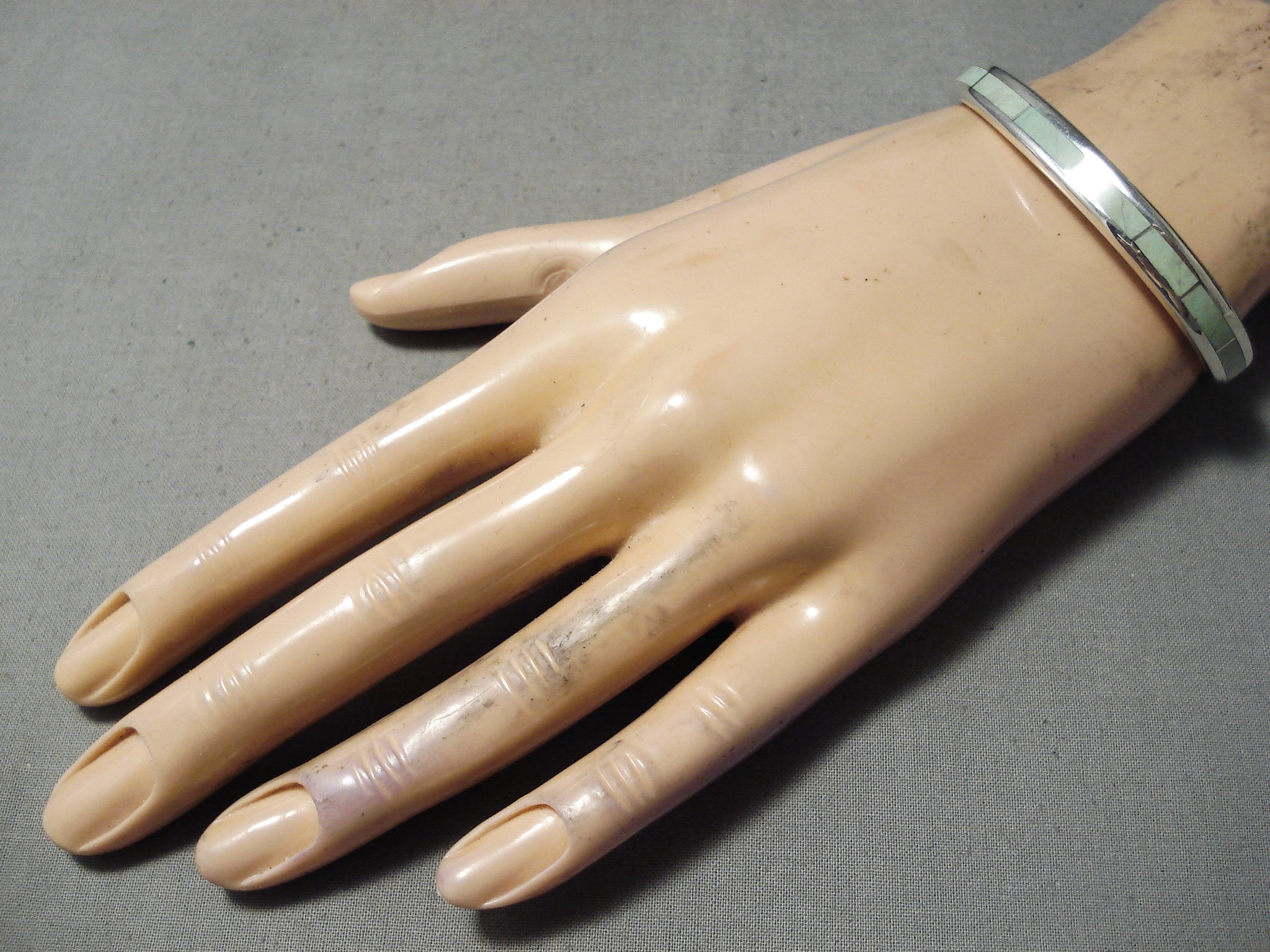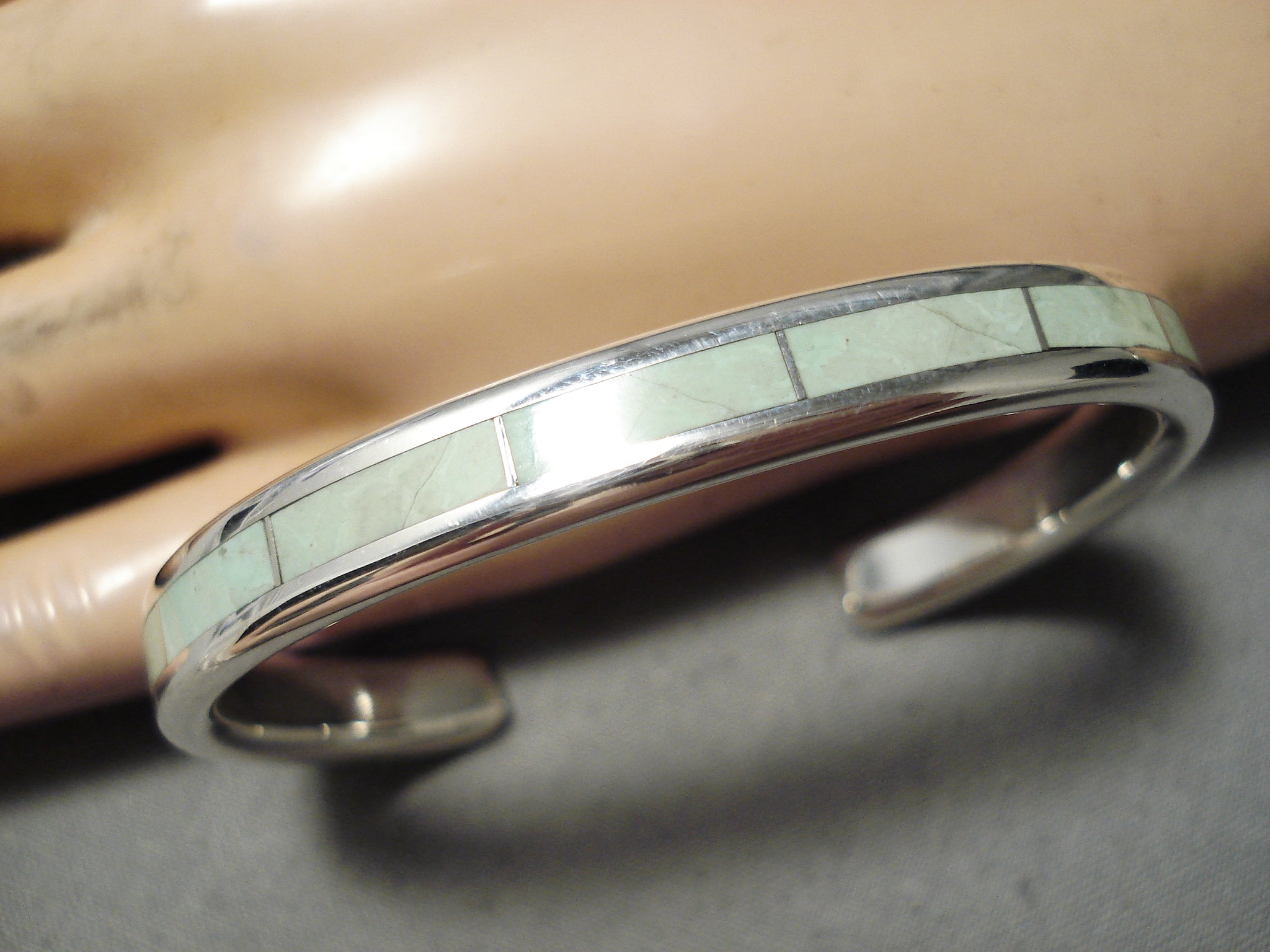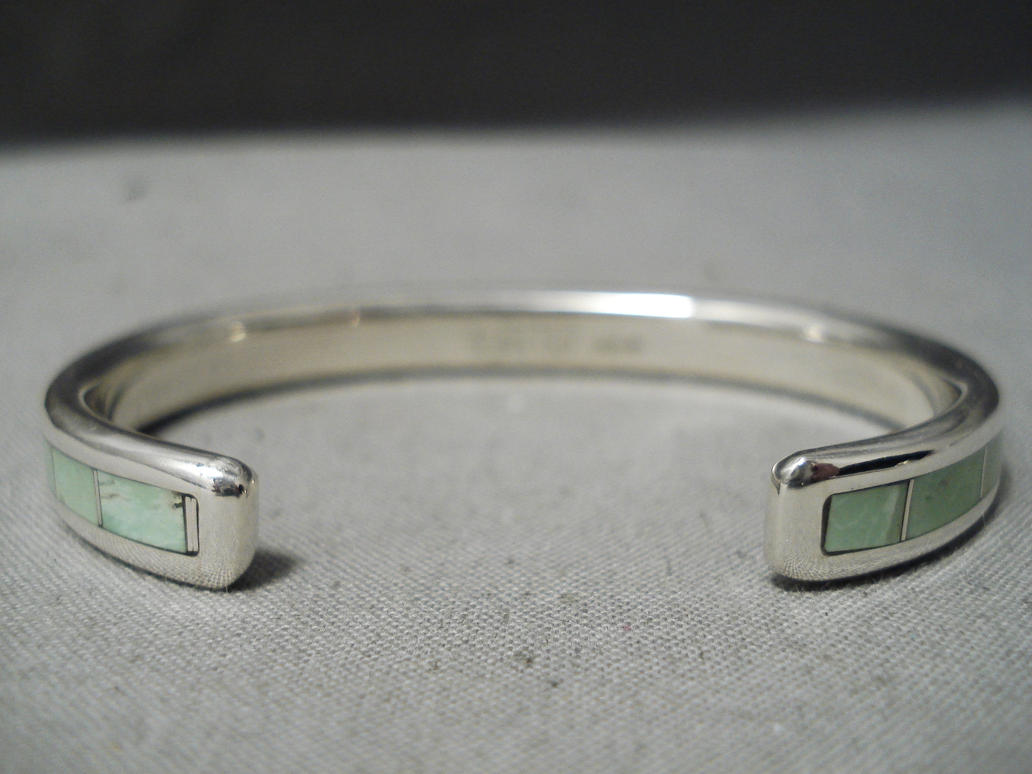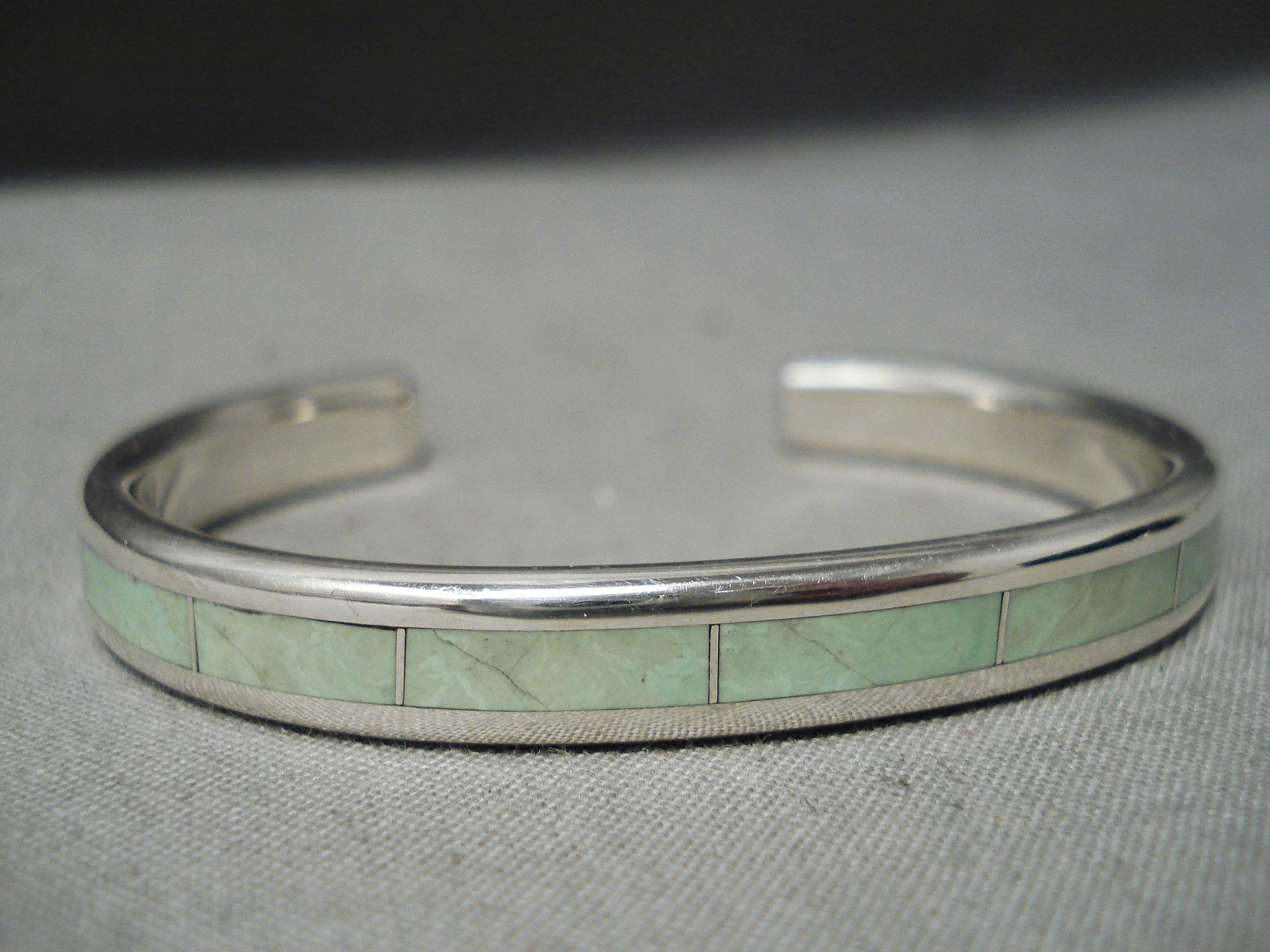 An exquisite vintage Zuni silver bracelet. The 1/8” wide spine of stunning inlay gaspeite rectangles reach from end to end of this thick, rounded cuff! The width of the bracelet measures around 1/4". Signed by Zuni artist, Larry Loretto. Sterling silver, marked. The inside end to end measures around 5-1/8" with an additional 1" gap. Sturdy 28 grams.