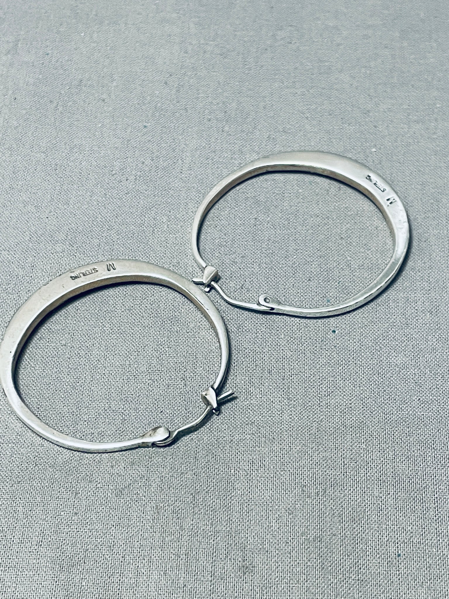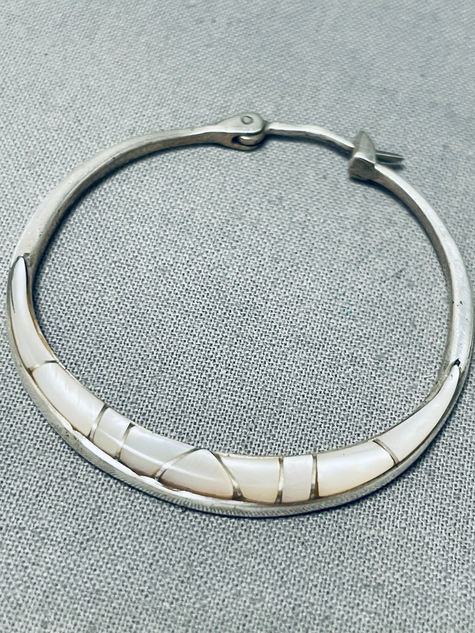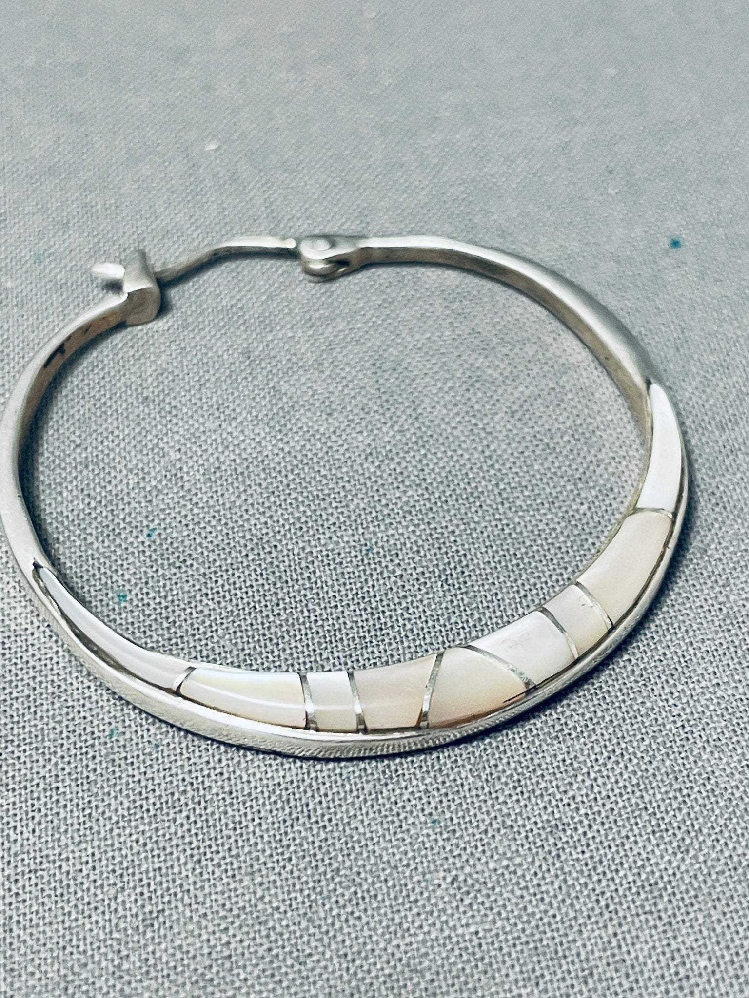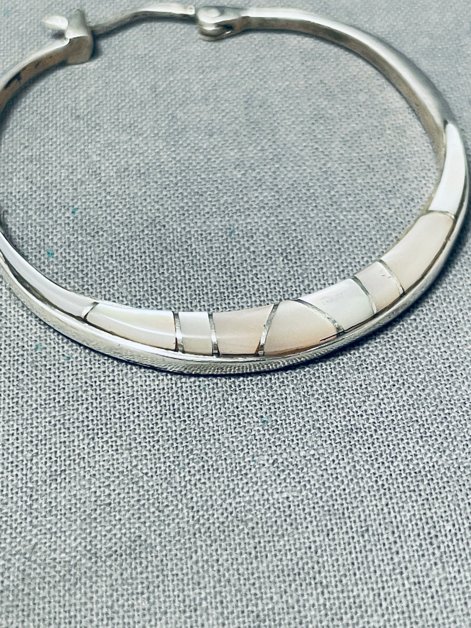 Elegant Vintage Native American Navajo Inlay Mother Of Pearl Sterling Silver Large Hoop Earrings