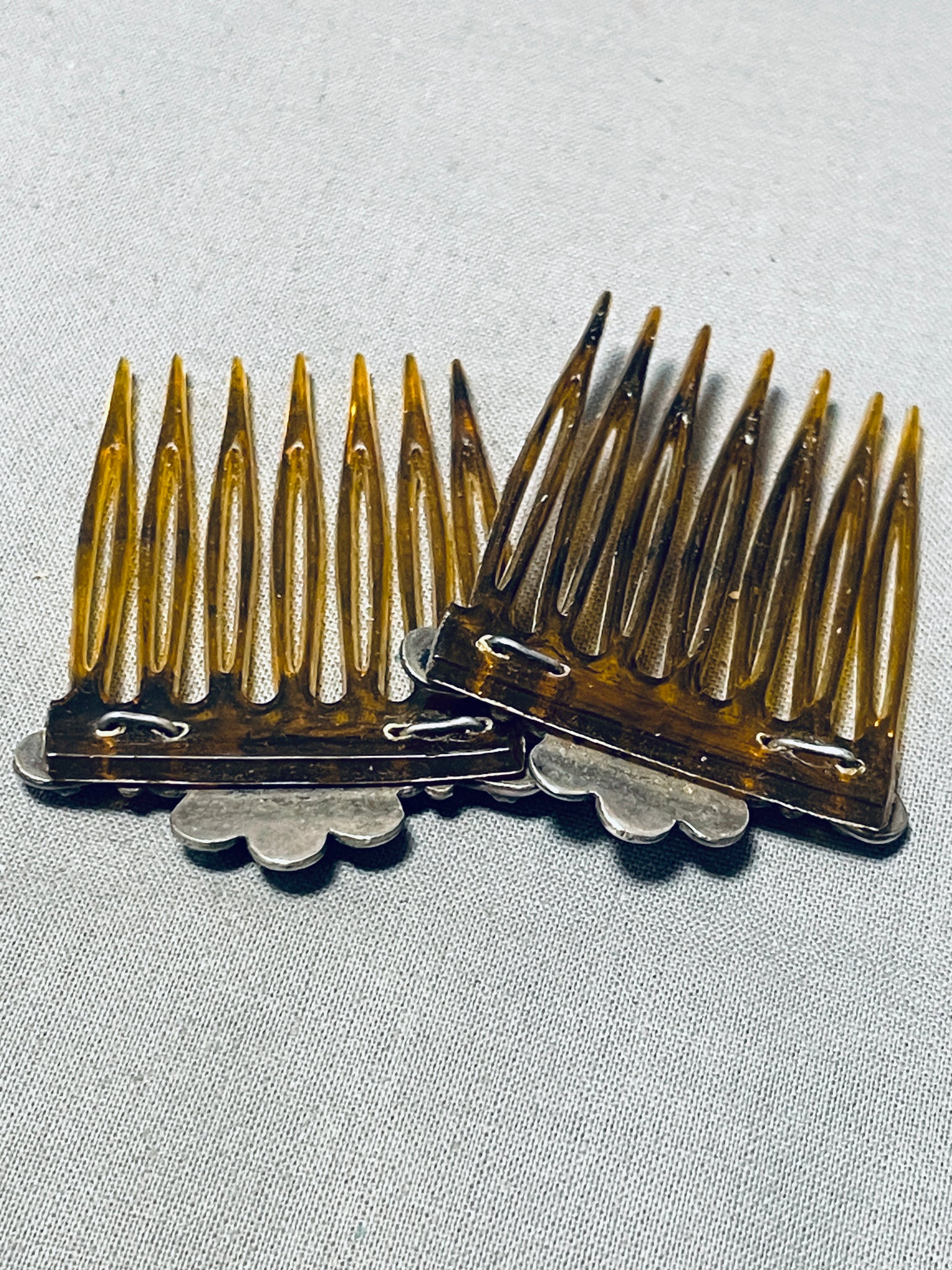 Enchanting Vintage Native American Zuni Blue Gem Turquoise Sterling Silver Hair Combs