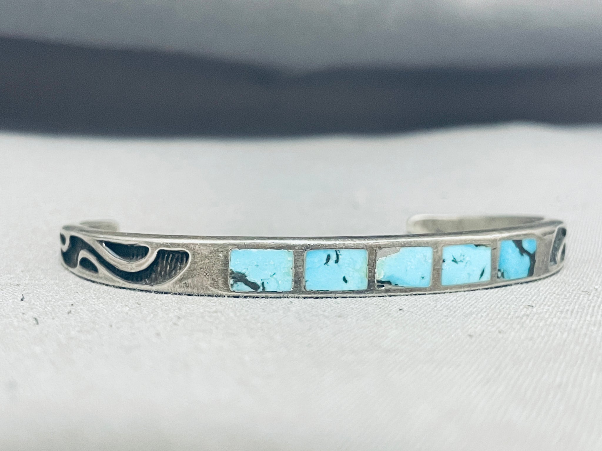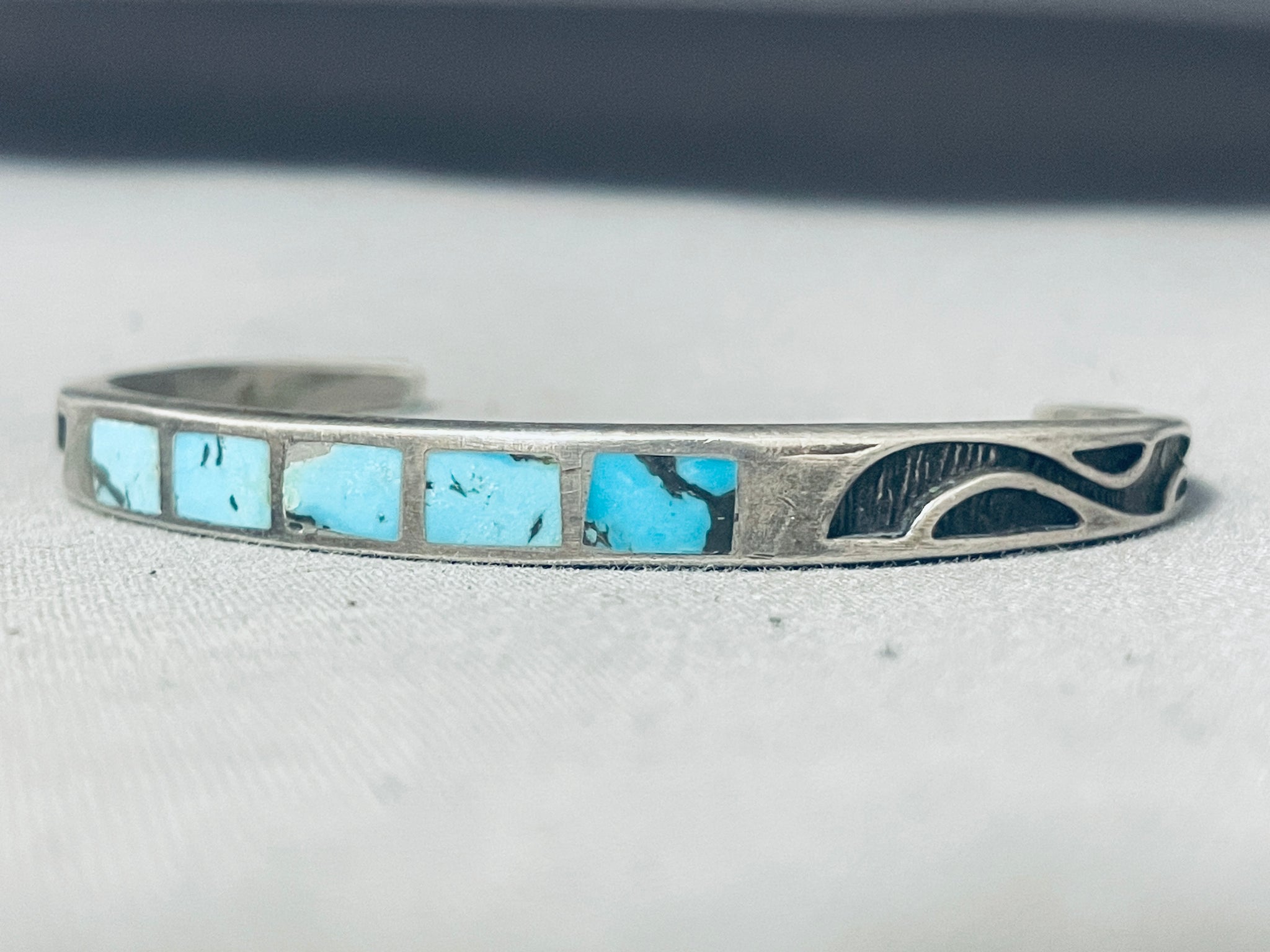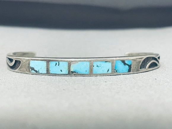 Enticing Vintage Native American Hopi Turquoise Inlay Sterling Silver Bracelet